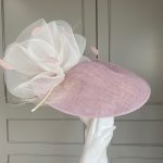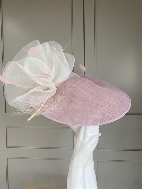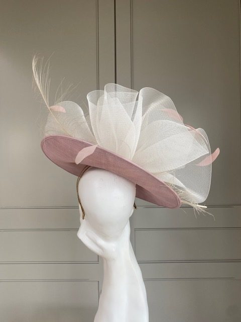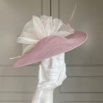 The Exclusive Hat 069 features an 18″ dish, Trimmed to the back with waves of crinoline, inserted with coque feathers and set off with one large Ostrich feather