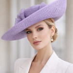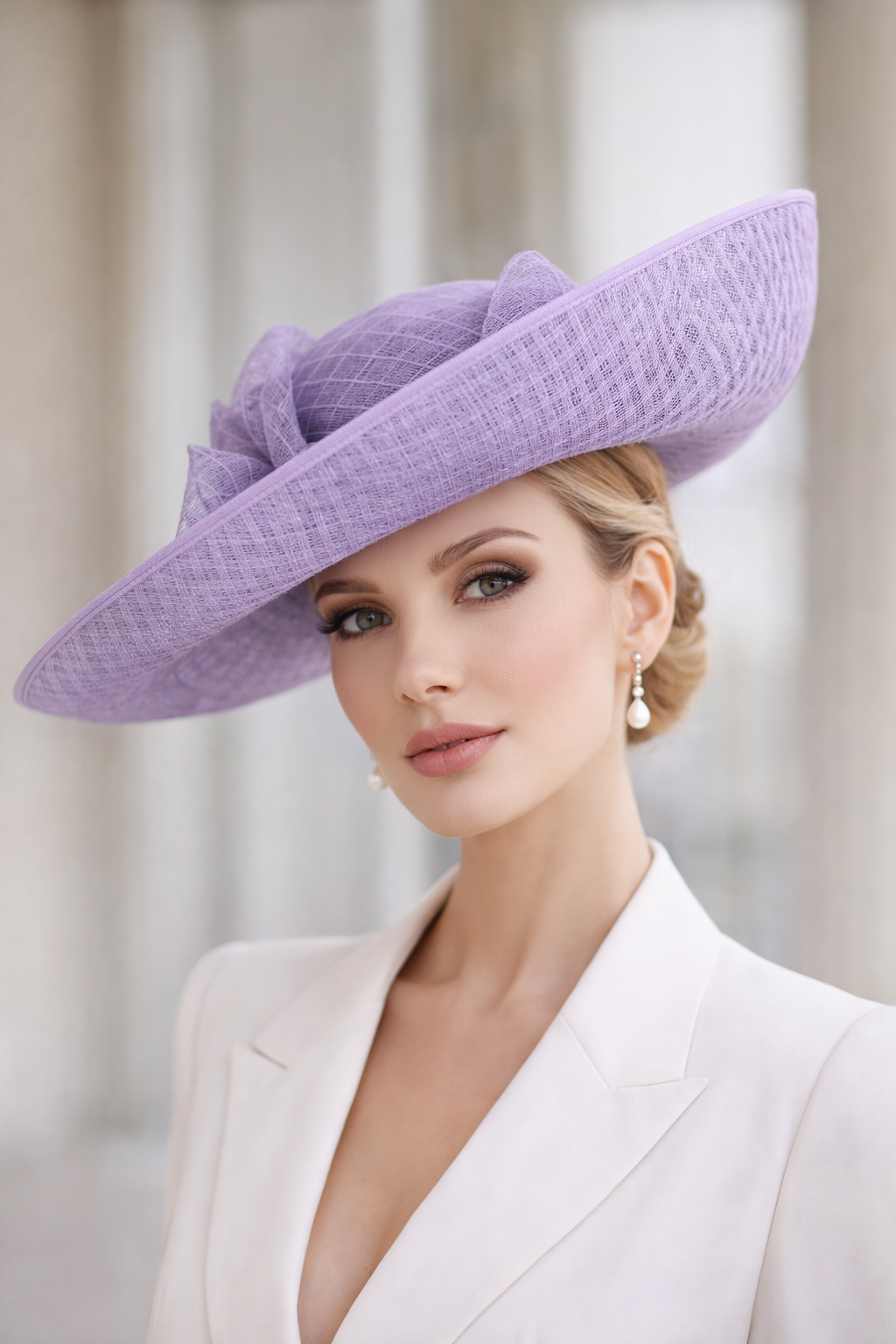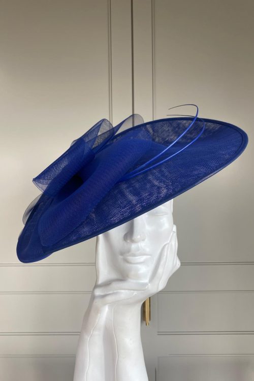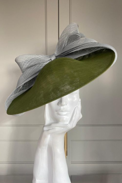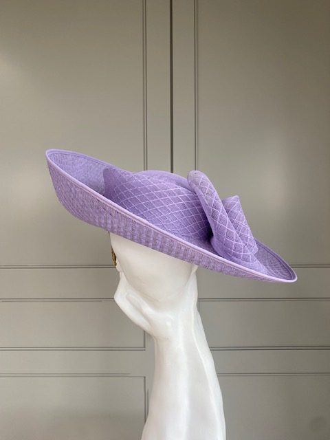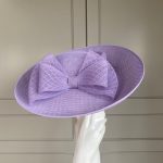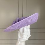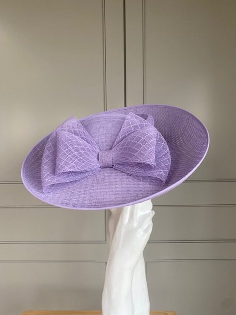 The Exclusive Hat 070 features and elegant shaped hat with a basket brim, trimmed with a diamond crinoline bow.