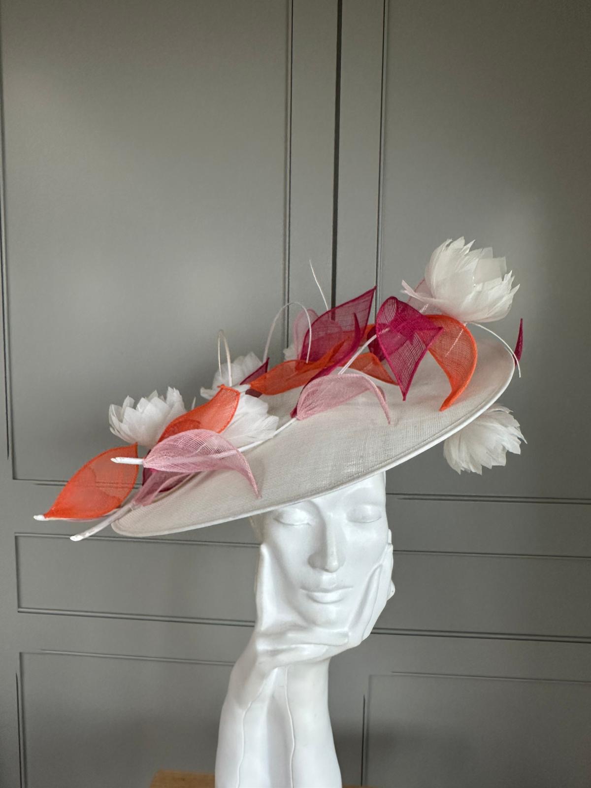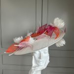 The Exclusive Hat 074 comprises a 18″ dish sinamay base, trimmed with Quills, feather flowers and sinamay petals