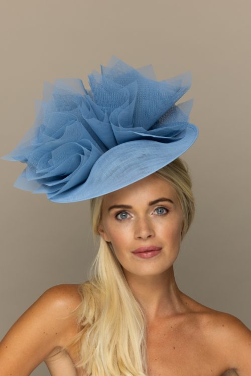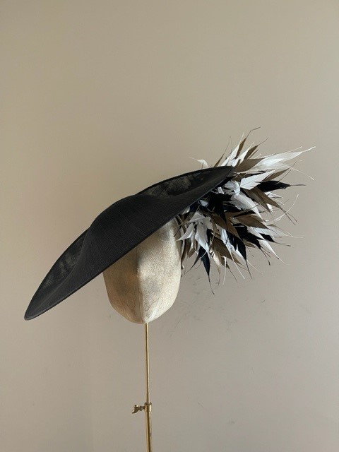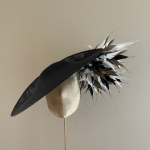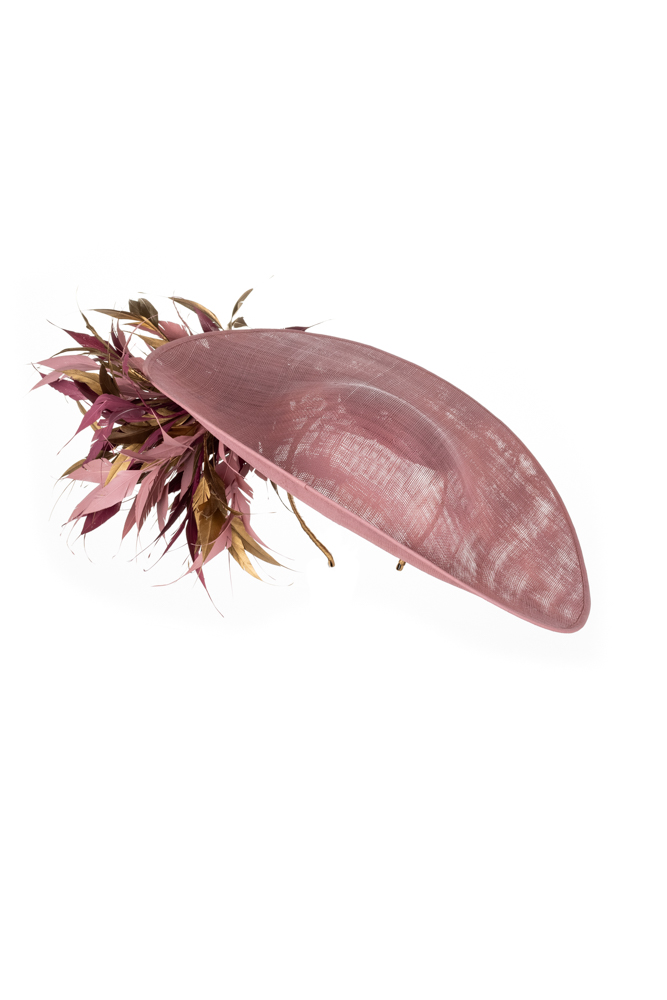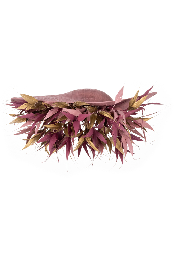 The Faroe dish hat comprises a 18″ sinamay dish base trimmed to the underside of the brim with a spray of spiked feathers to one side in up to three colours. The hat comes on a ribbon-wrapped double headband for comfort.