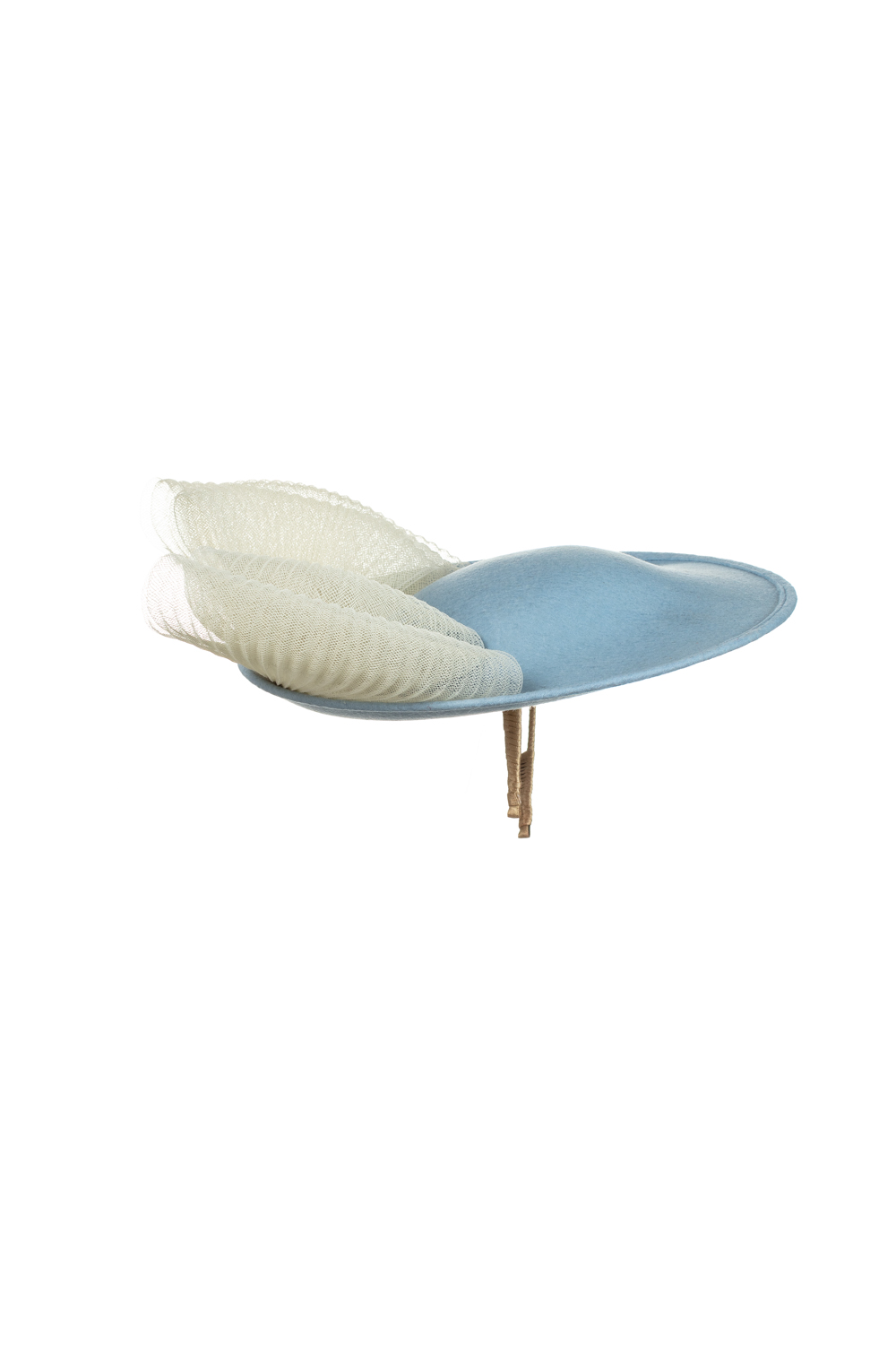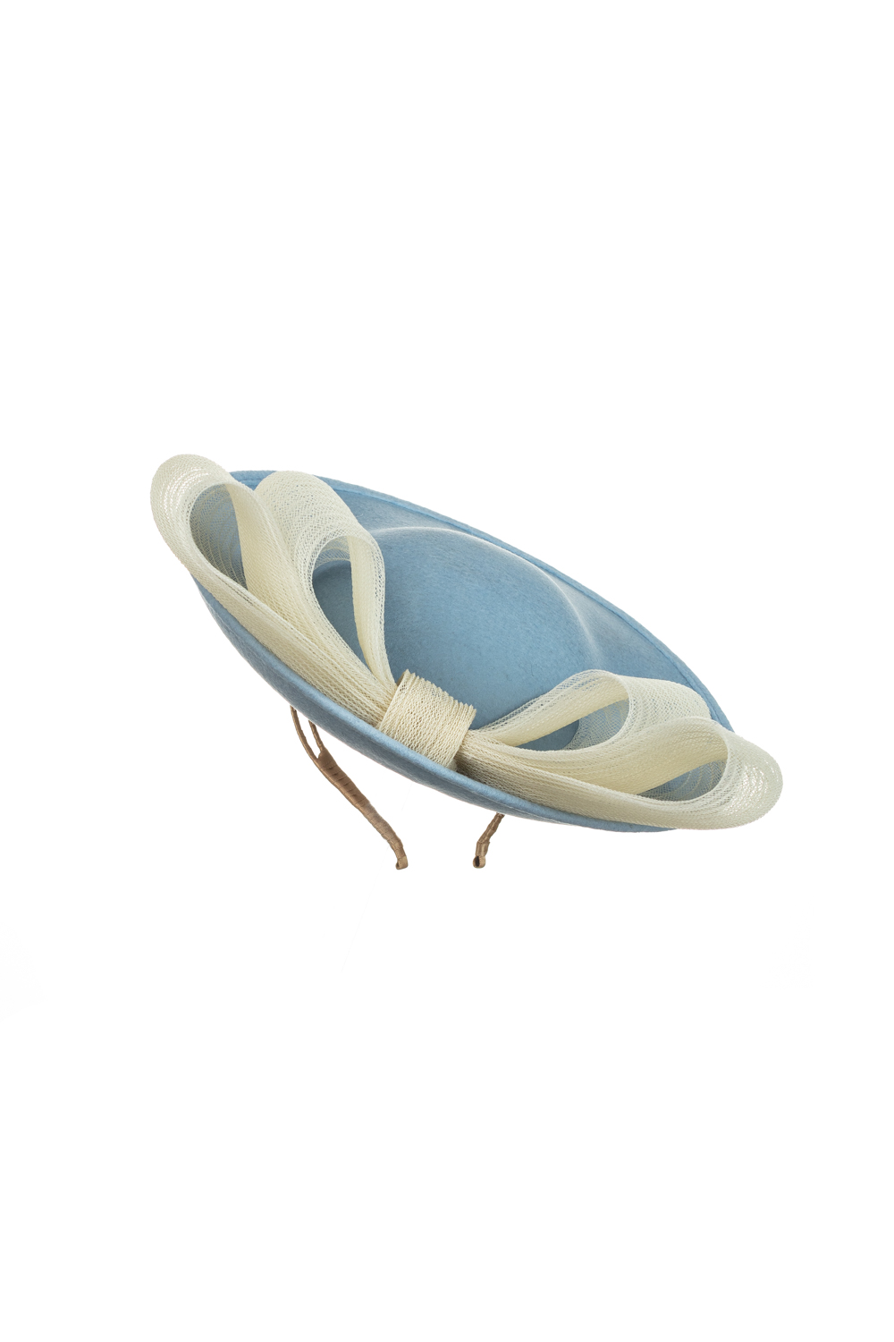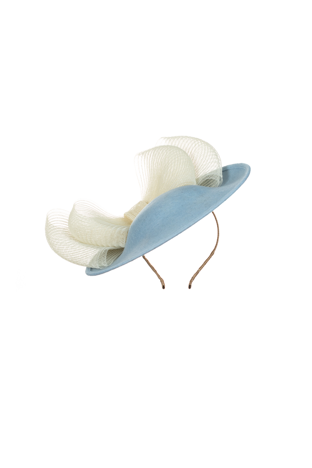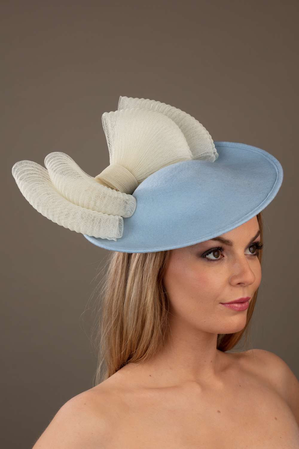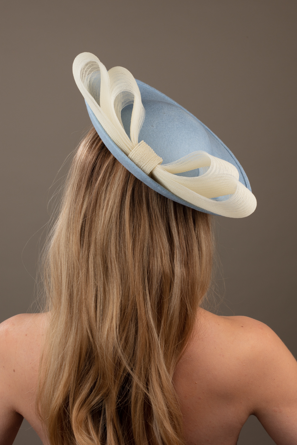 The Fumé Dish Hat comes on a hair band which will be carefully ribbon wrapped to match your hair colour, providing a seamless finish to your outfit.