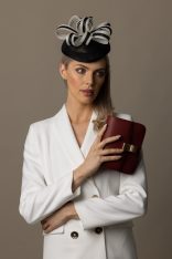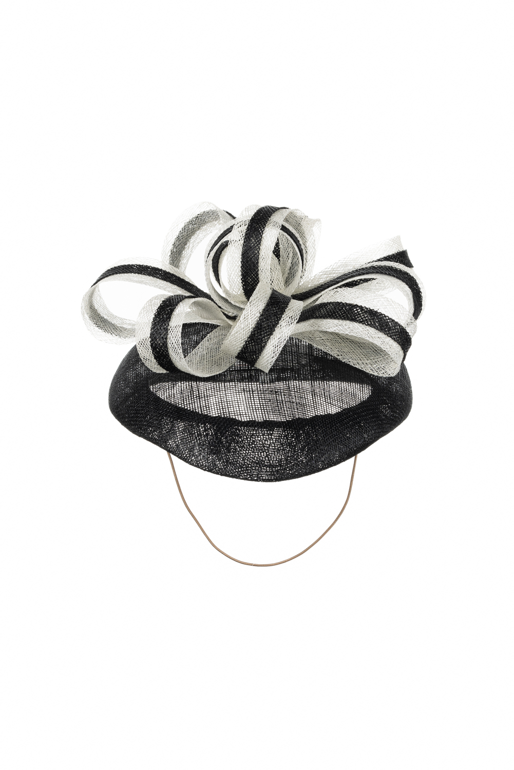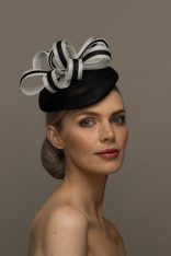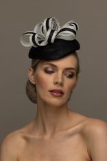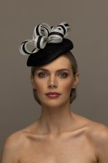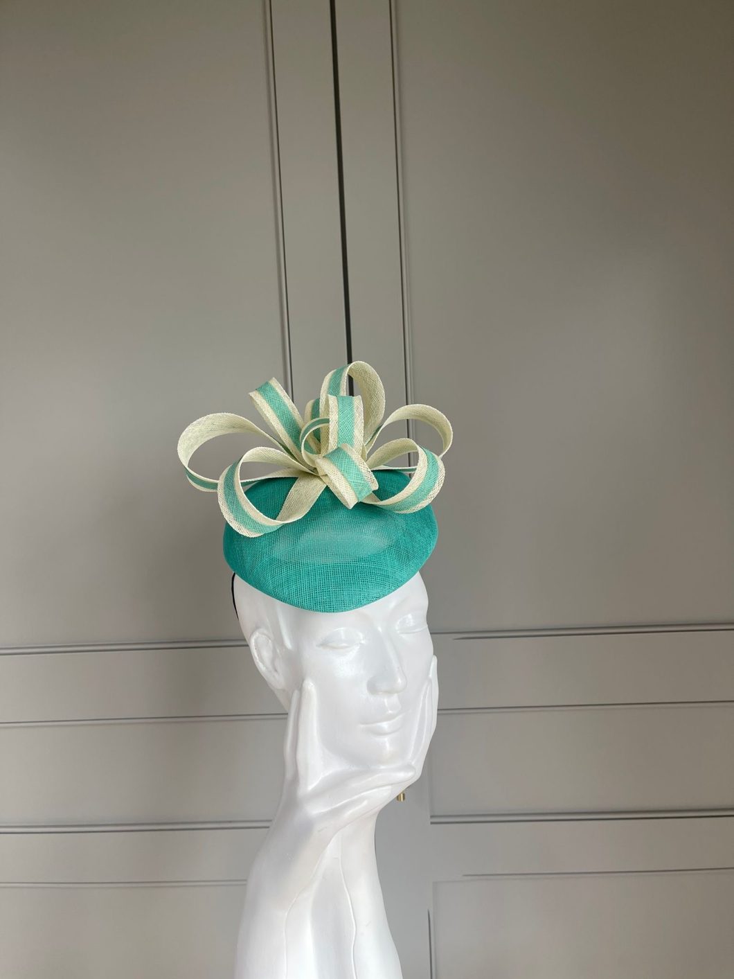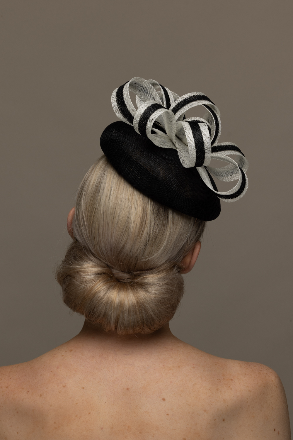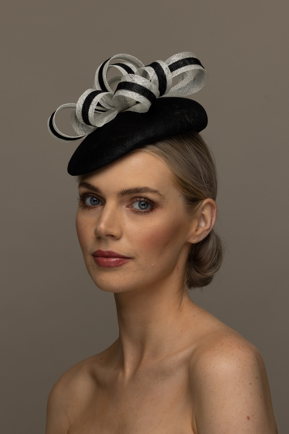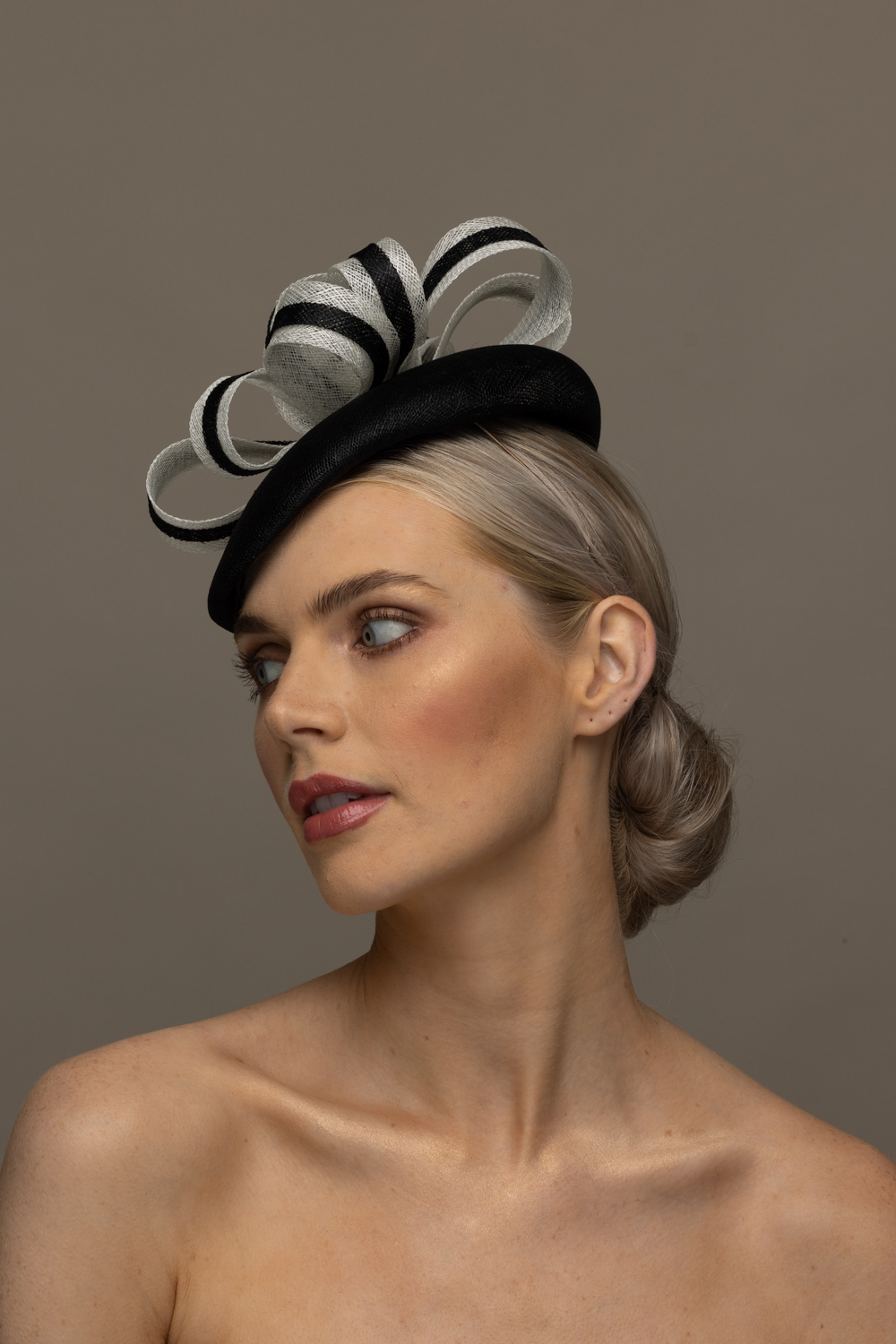 The Funnell Pillbox hat comprises a sinamay pillbox base trimmed to with trimmed with 1 ” sinamay loops overlaid with a second colour.