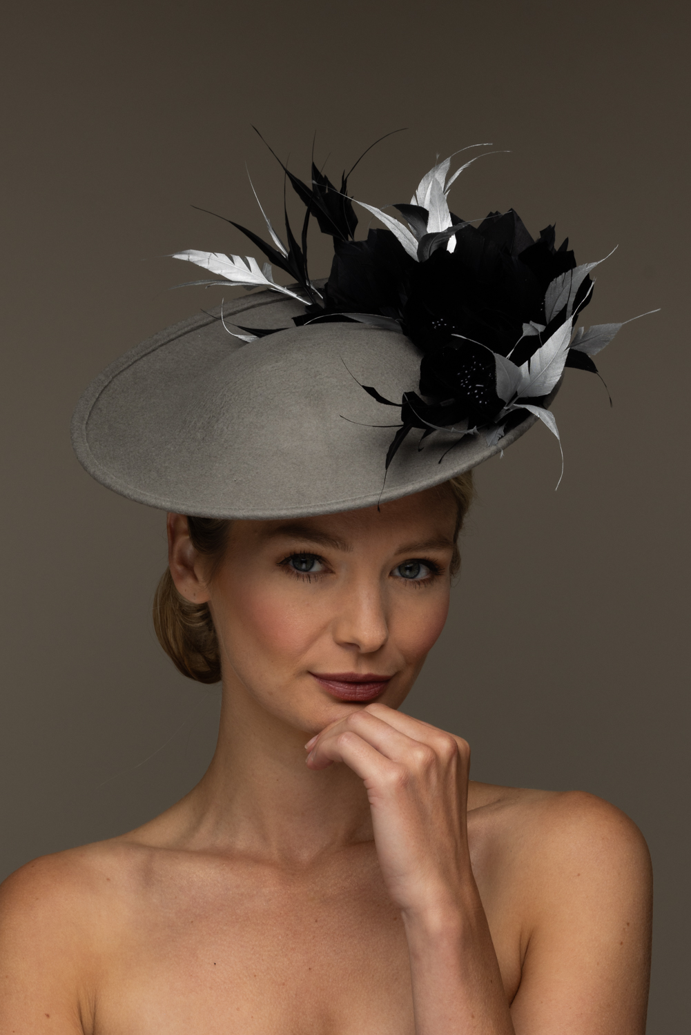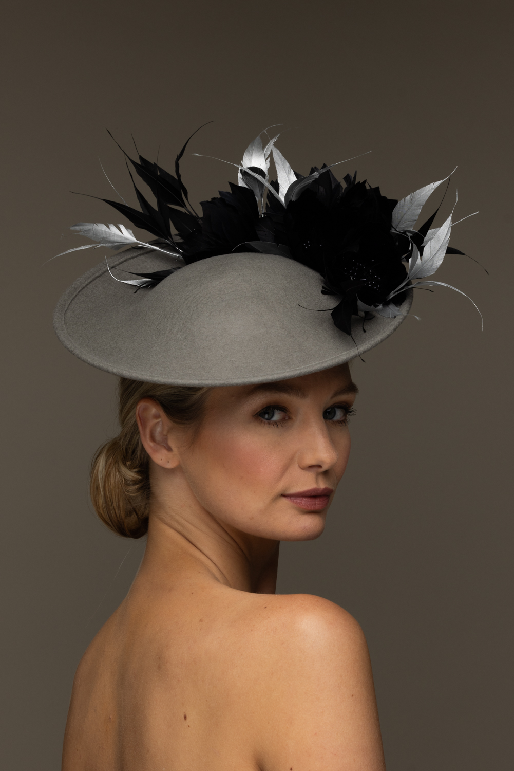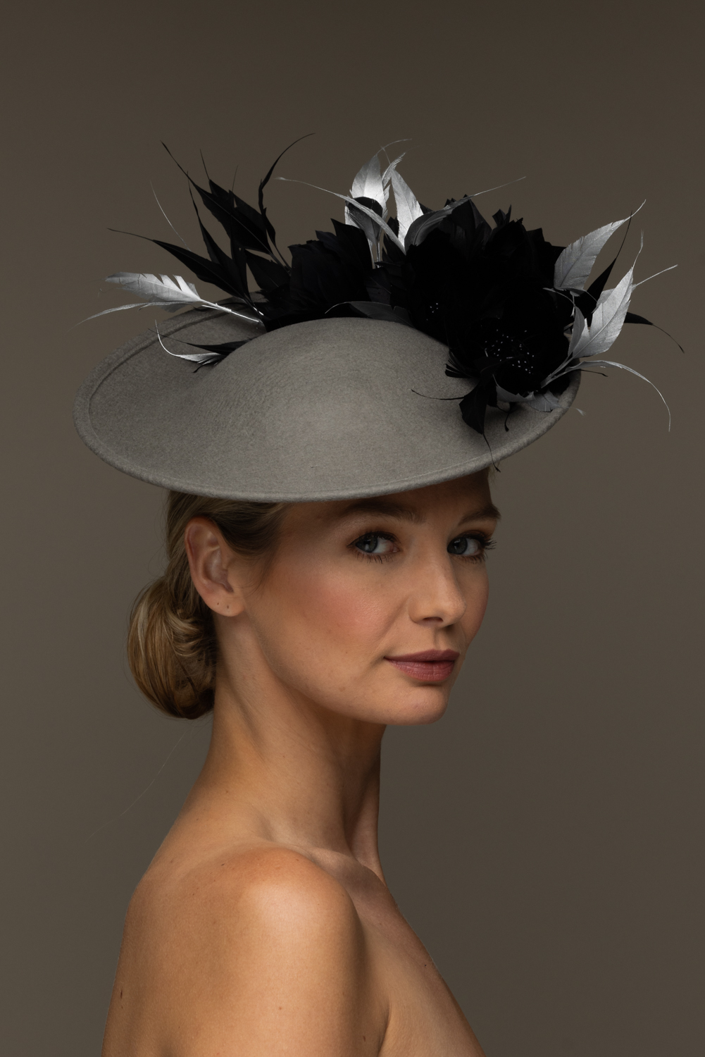 As with all of our hats, you can have your Heath dish hat in any colour you wish. Choose your felt base colour here and your feather colour here. The feather flowers are available in navy, ivory and black only.