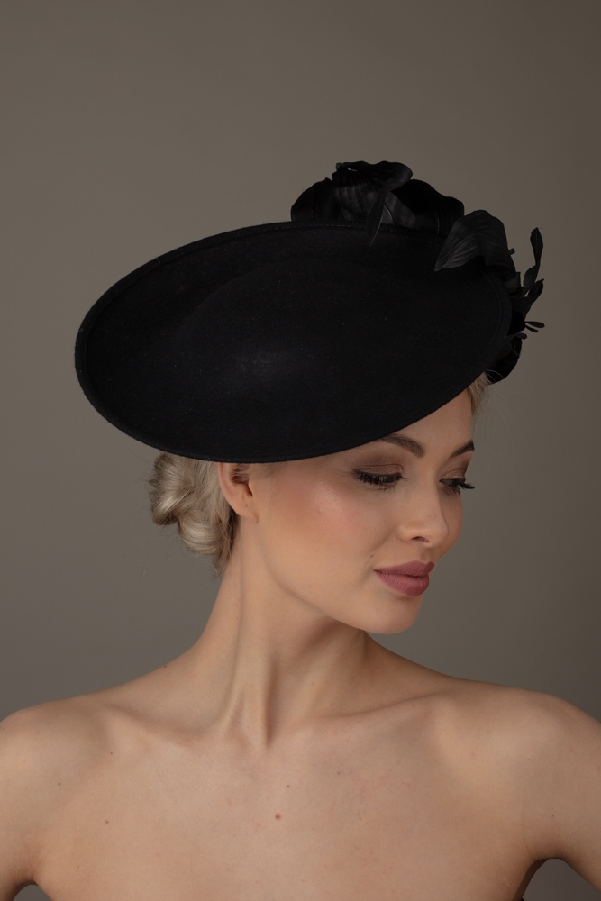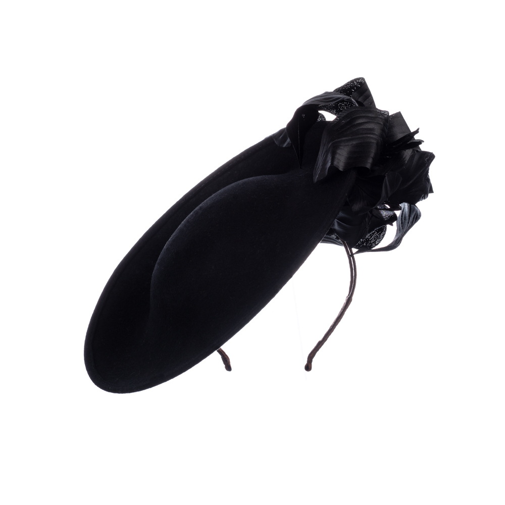 The Hirst Dish Hat comes on a comfortable ribbon wrapped double headband colour matched to your hair colour.