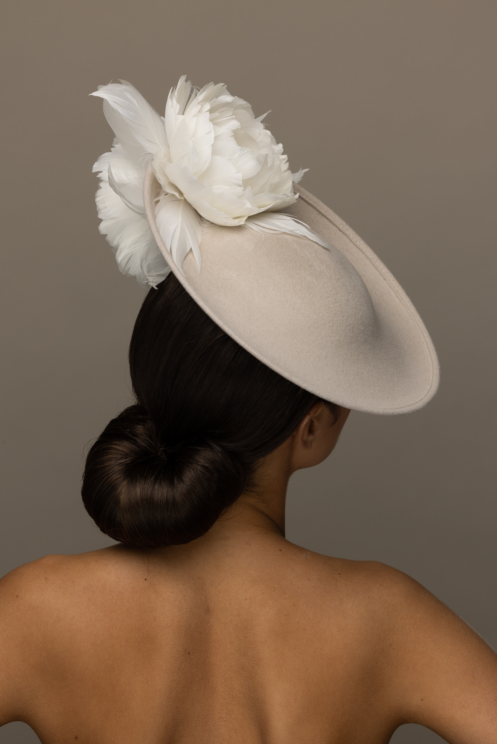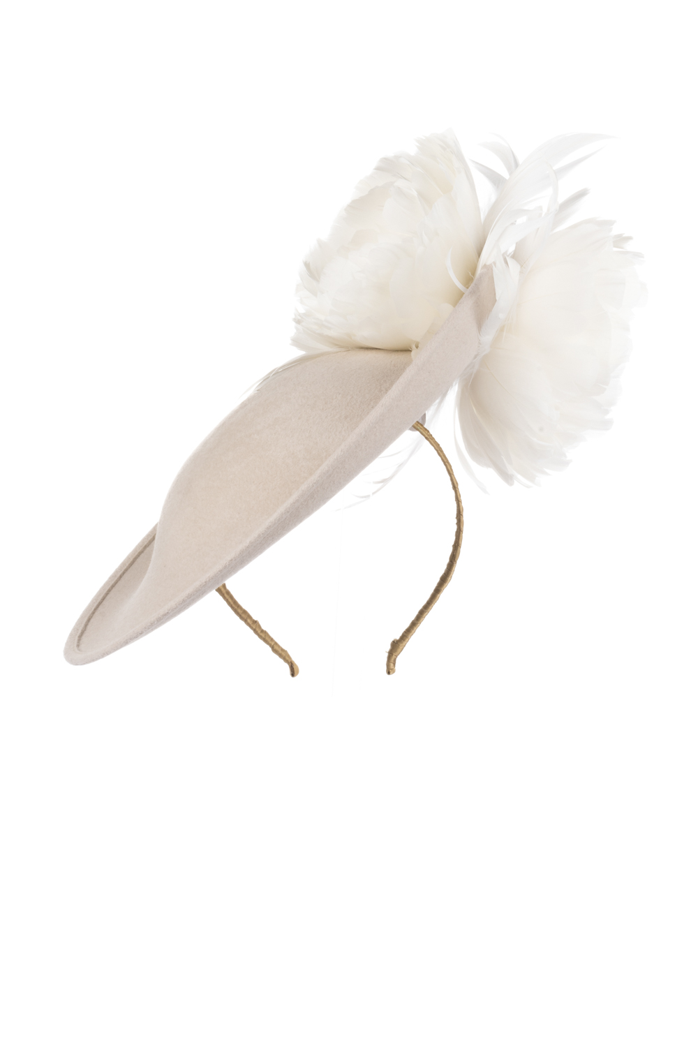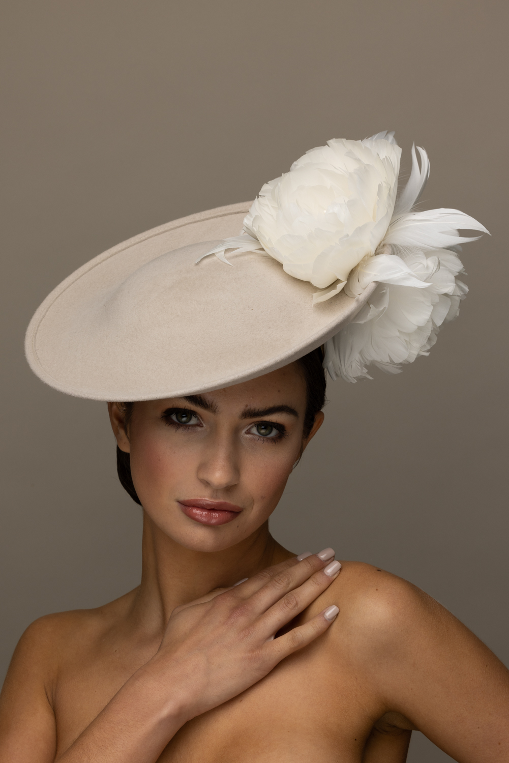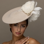 The Honeysuckle dish hat is a beautiful hat, especially in these soft neutral colours. The hat comprises a 12″ felt dish base trimmed to the top and underside of the brim with soft feather flowers.