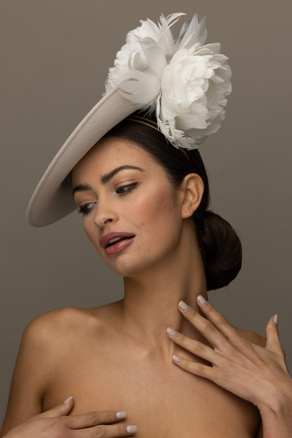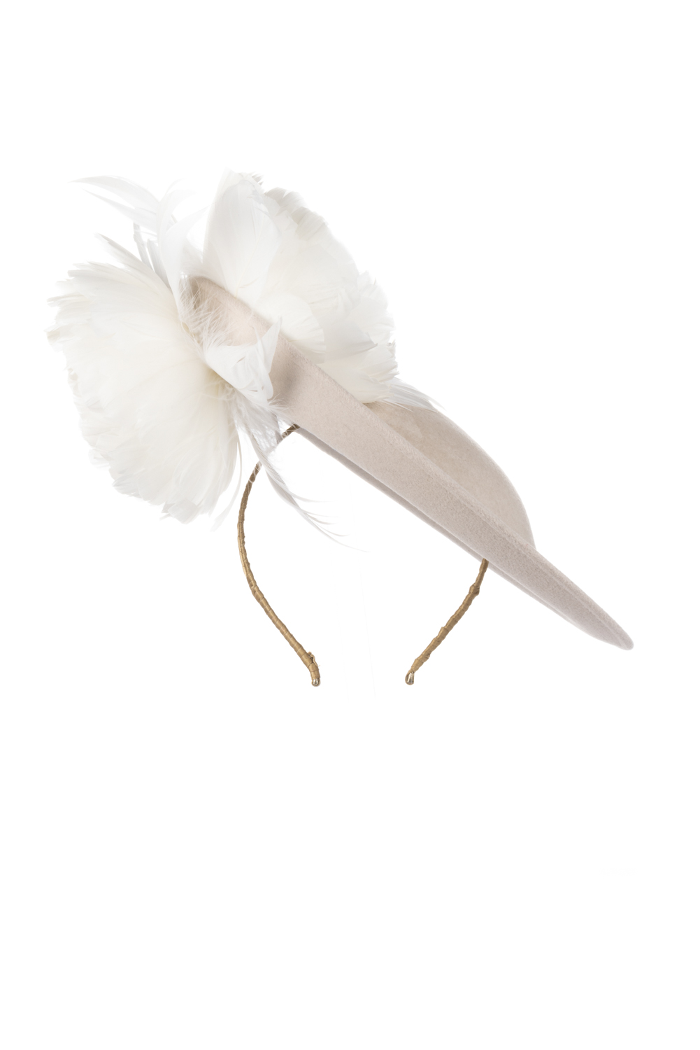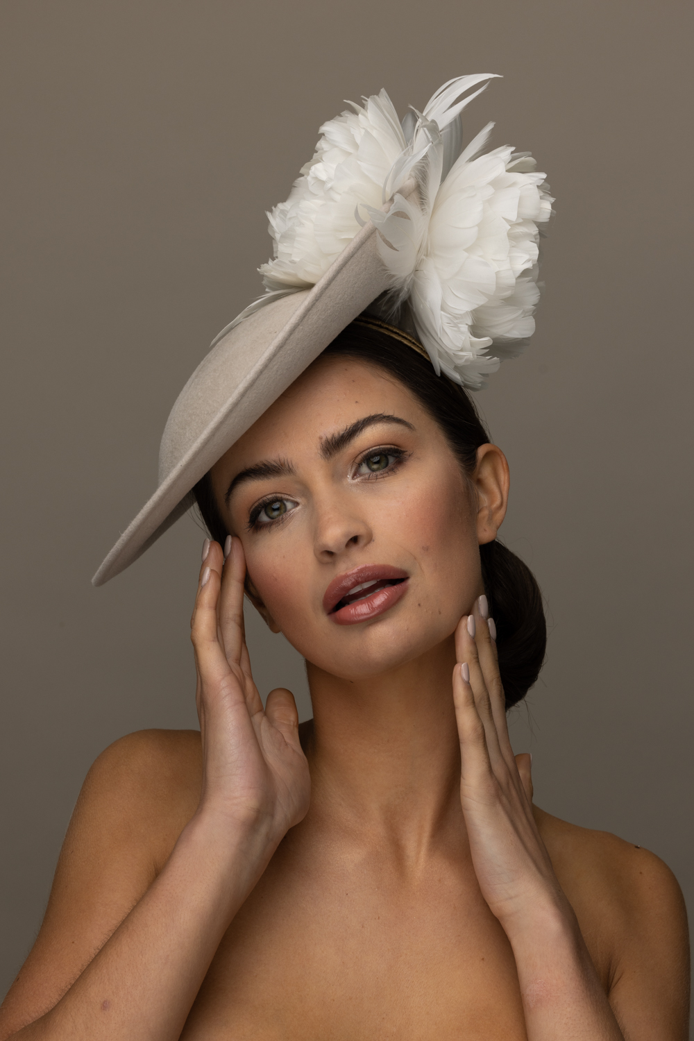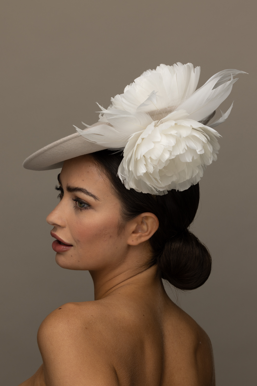 The Honeysuckle dish hat is a beautiful hat, especially in these soft neutral colours. The hat comprises a 12″ felt dish base trimmed to the top and underside of the brim with soft feather flowers.