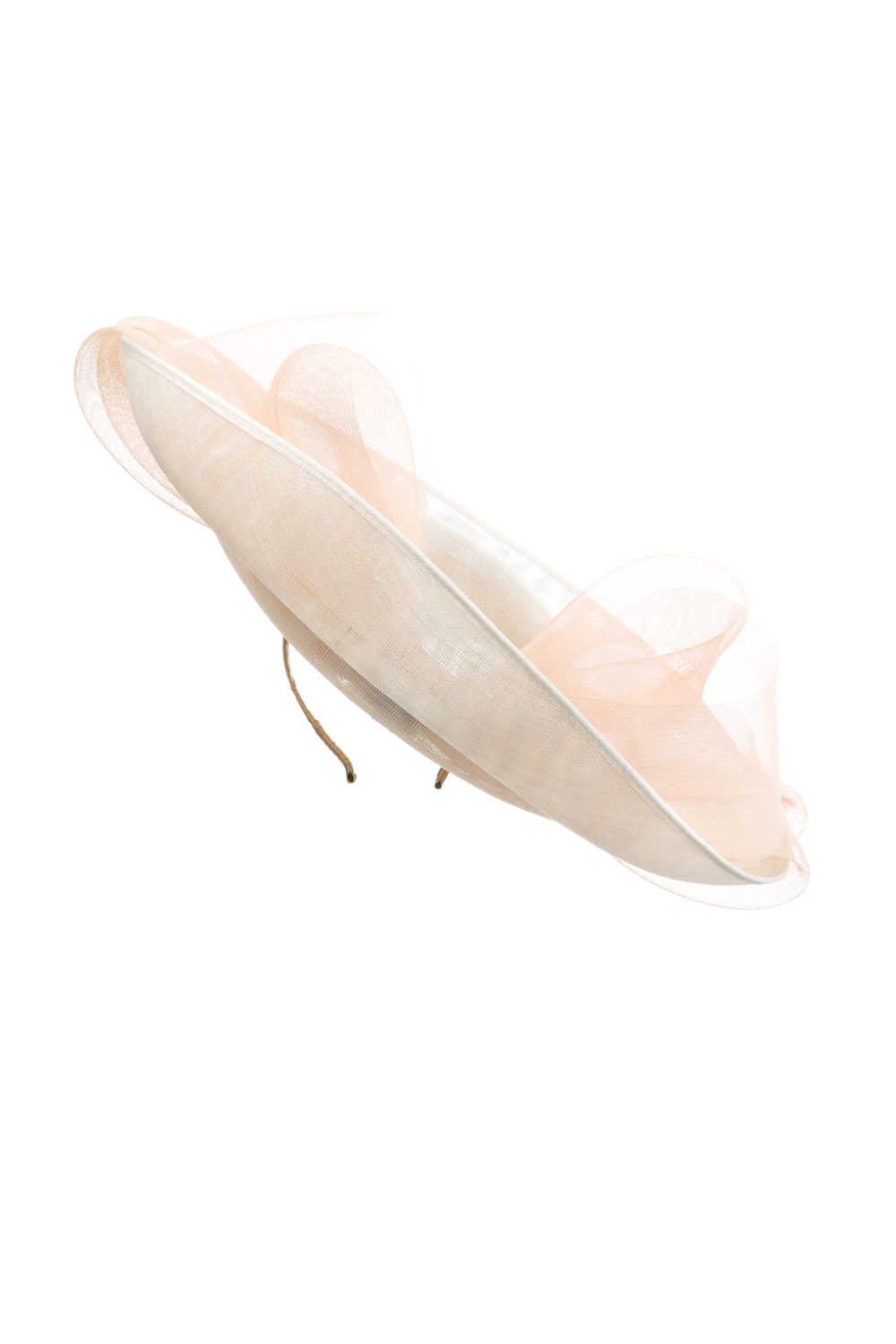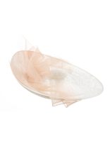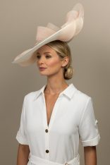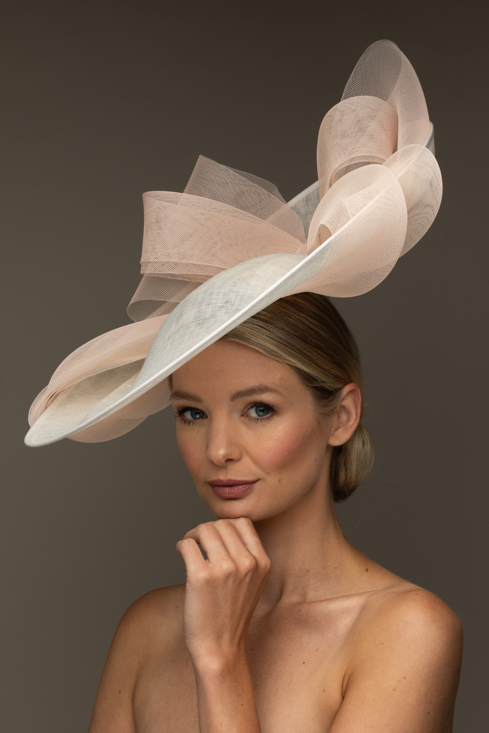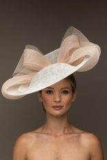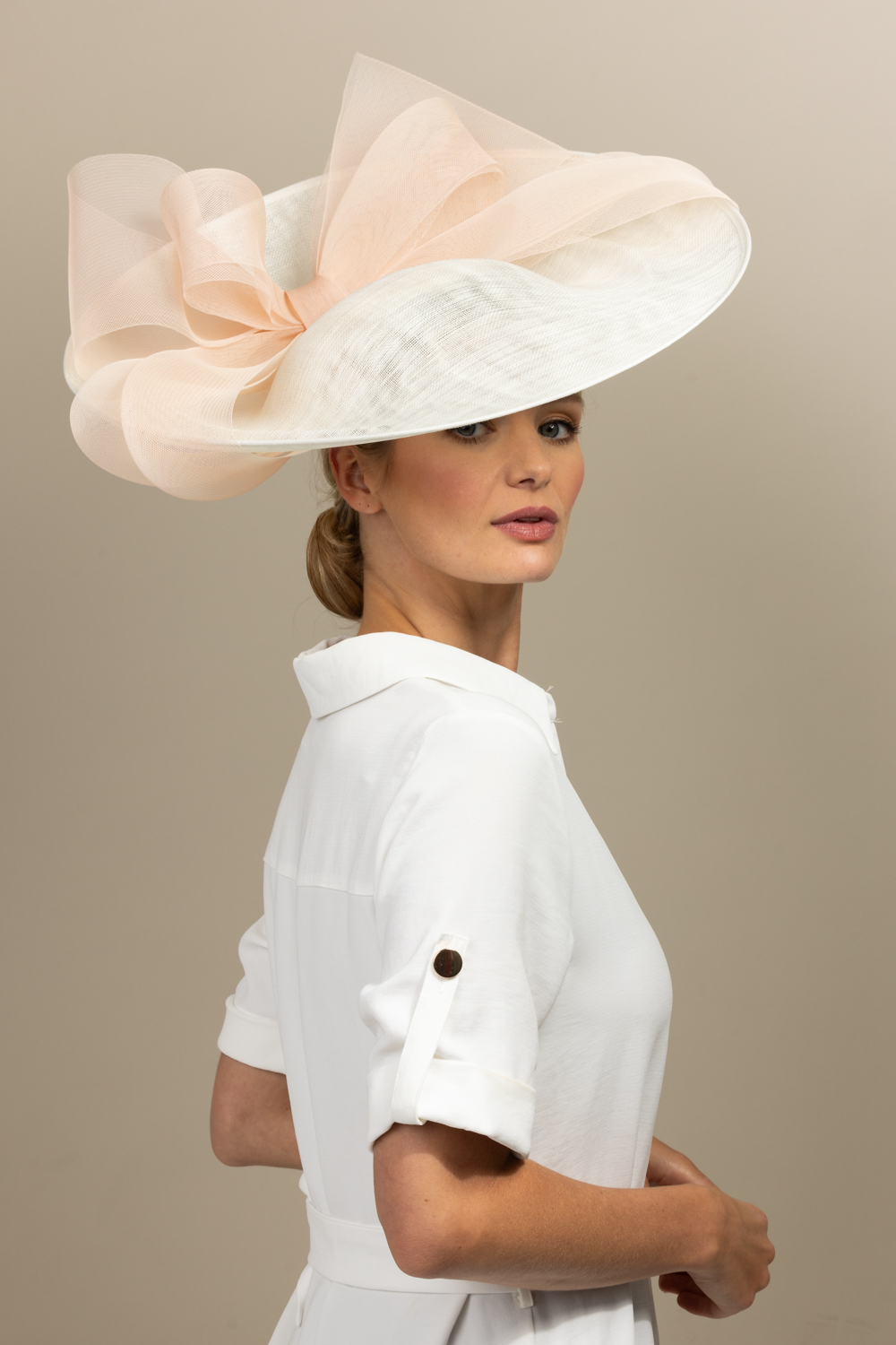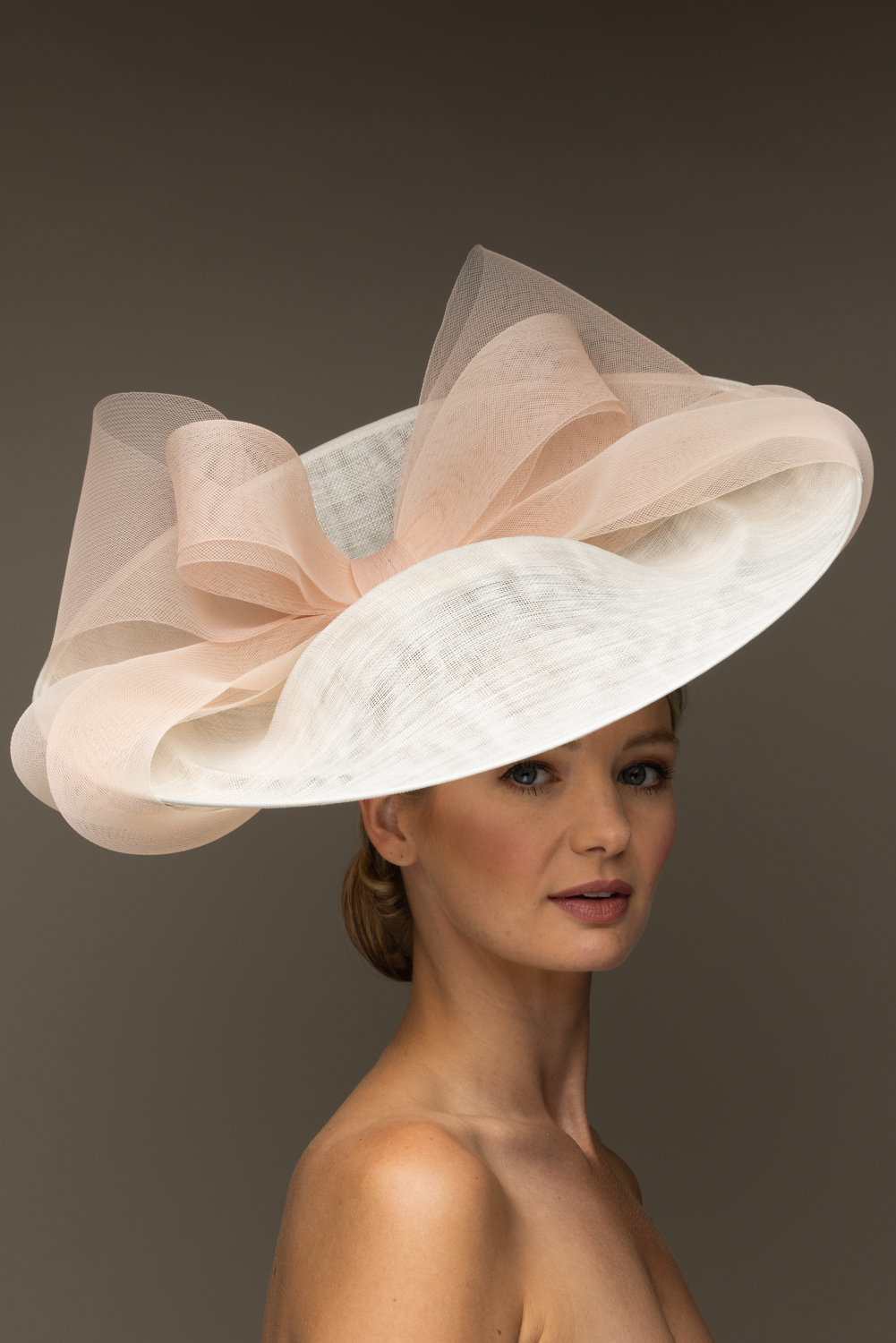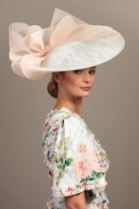 The Jefferson Dish Hat features a large sinamay dish base trimmed with a beautiful plain crinoline bow, the tails of which wrap under the brim of the hat at the back.