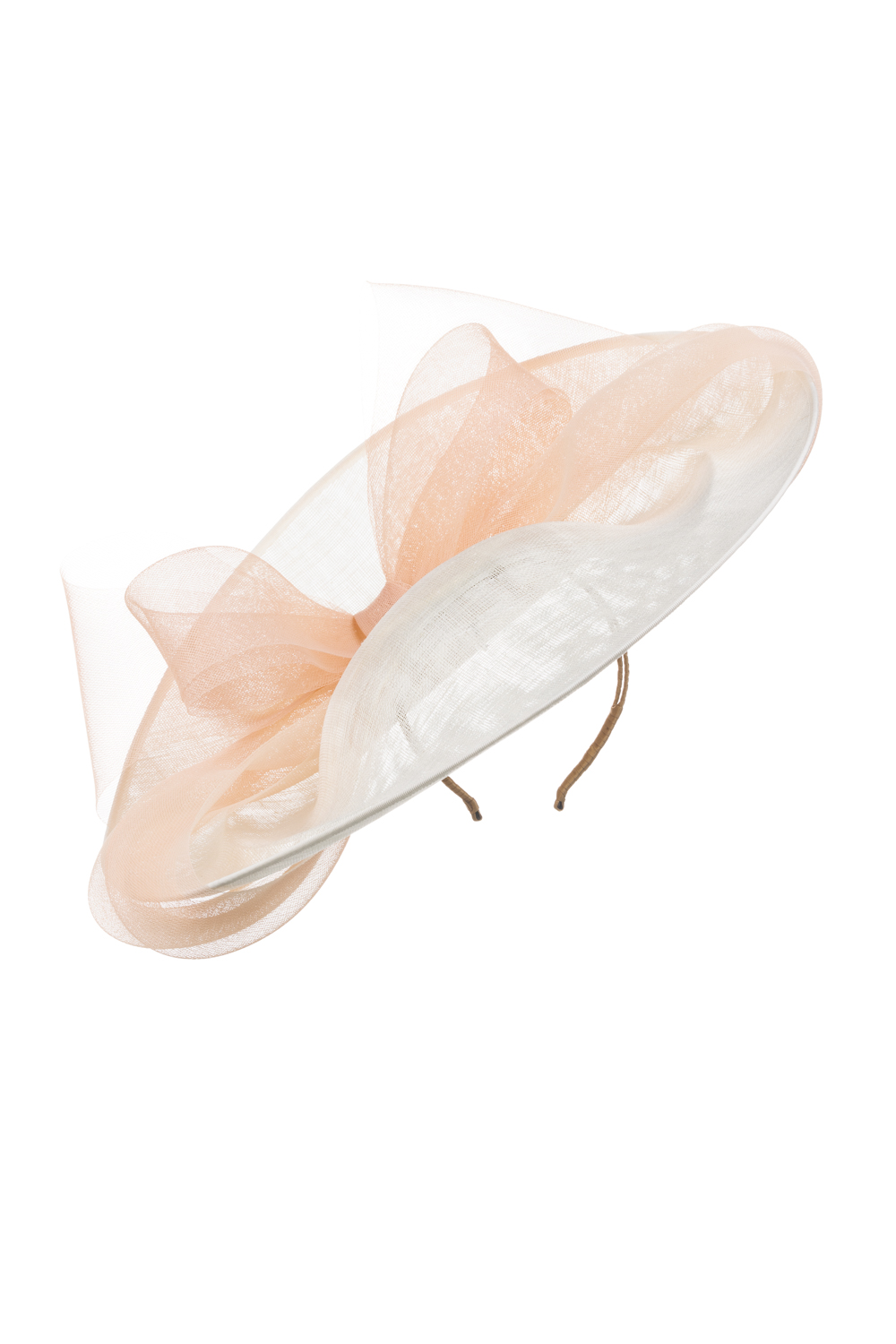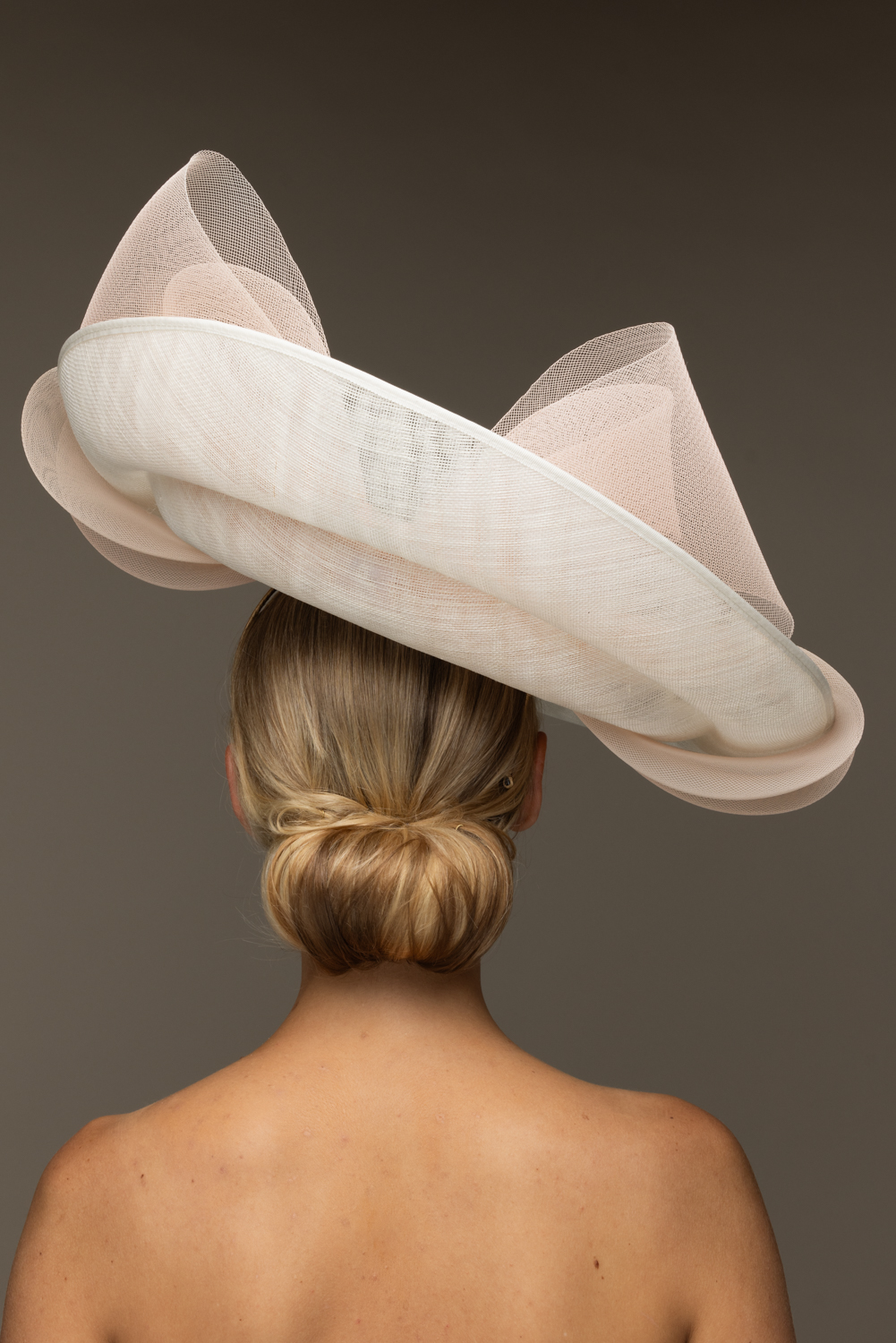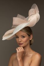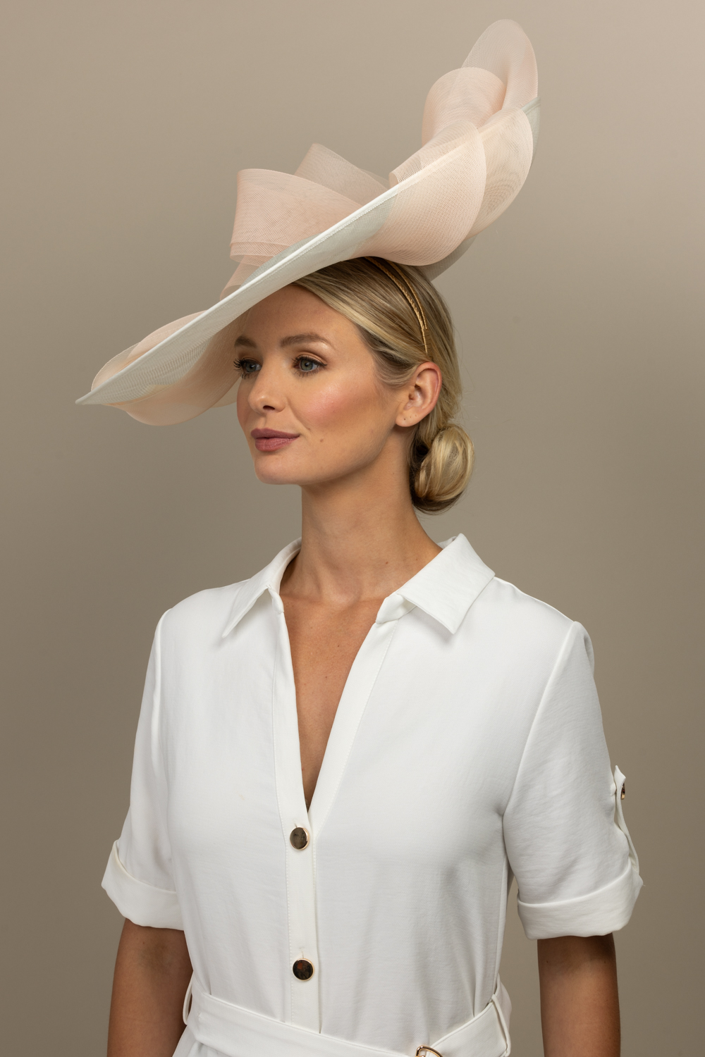 This hat comes on a comfortable, ribbon wrapped double headband which we will match to your hair colour.