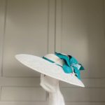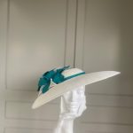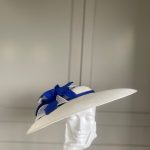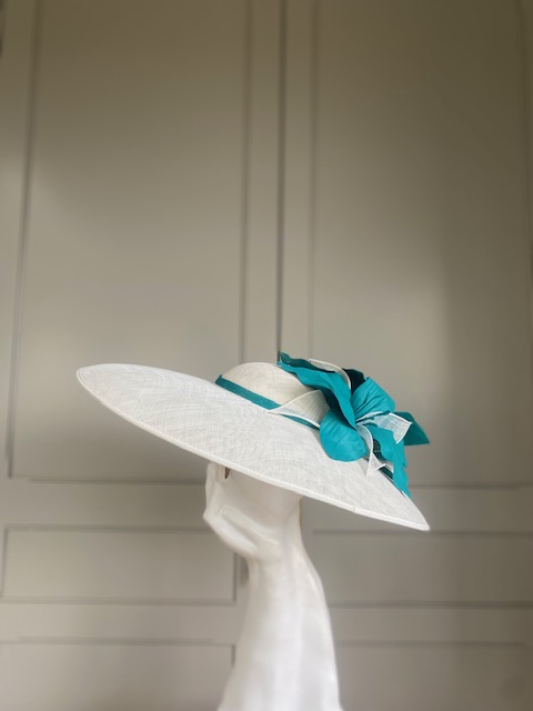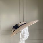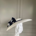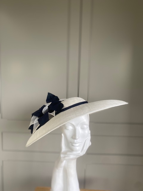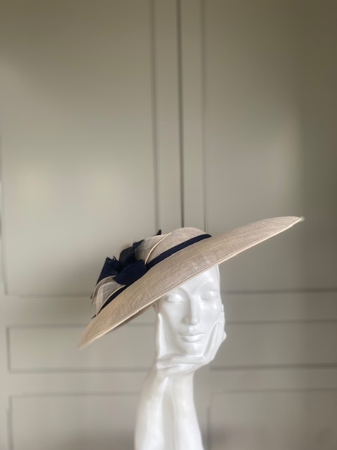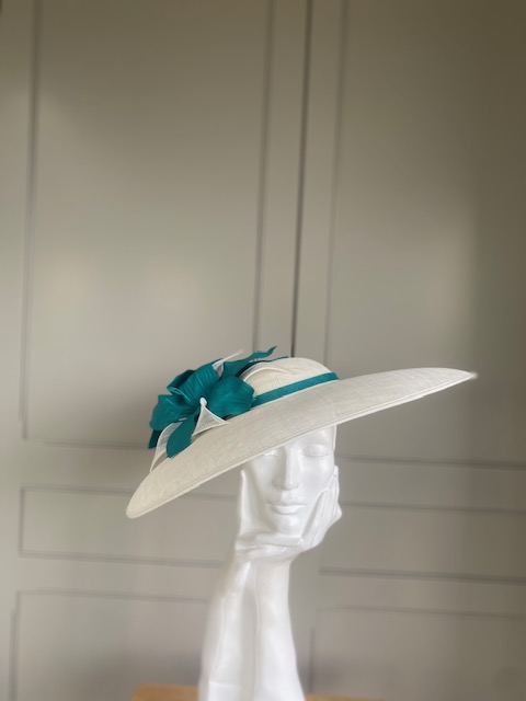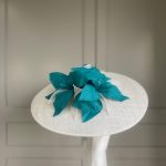The John Charles Chester Hat comprises a dish style base with shallow crown trimmed with a contrasting hat band. This is then topped with two flowers and sinamay leaf detail.