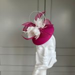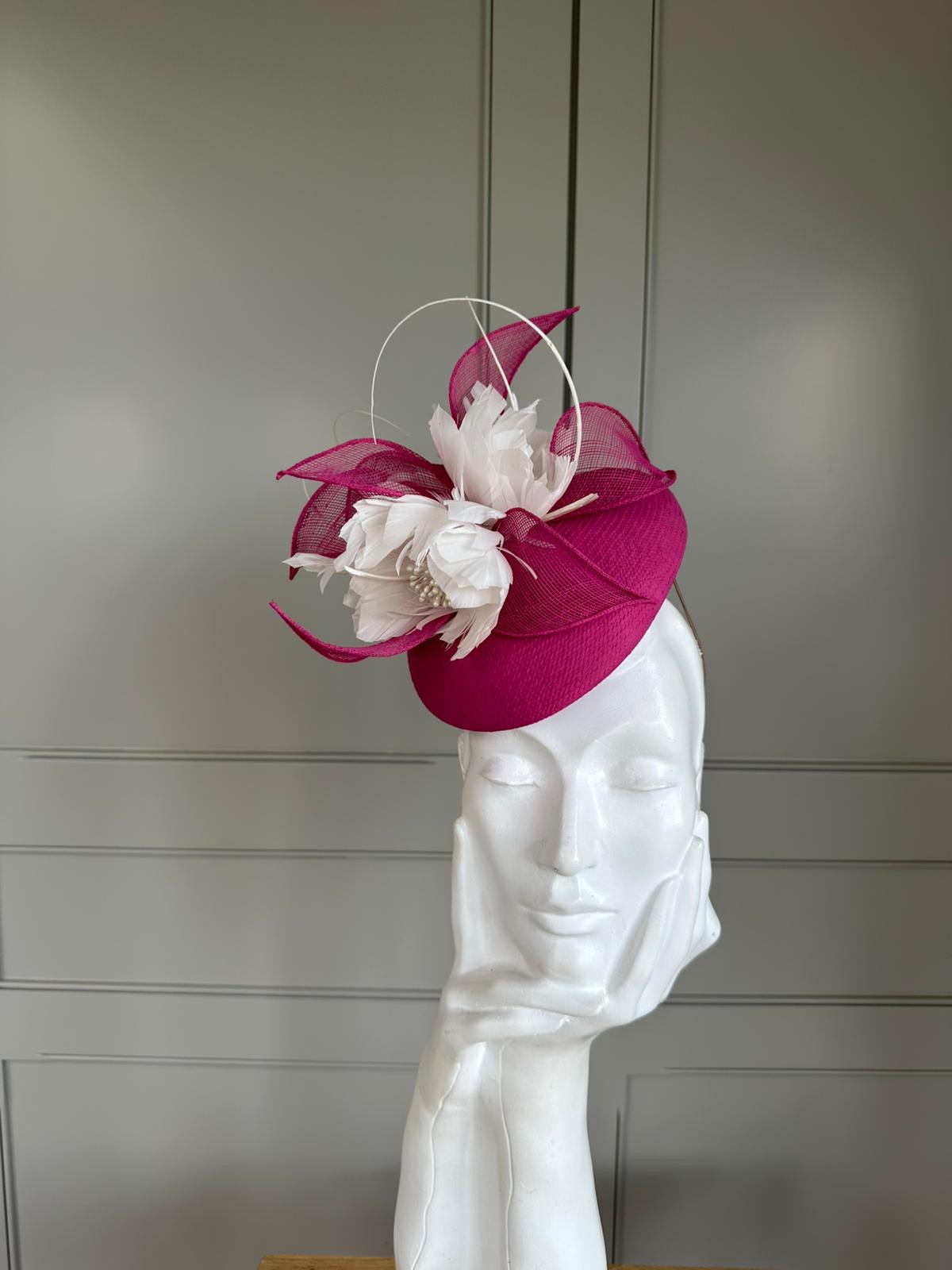 The John Charles Durham Pillbox Hat comprises a neat pillbox base trimmed with feather roses, offset by sinamay leaves and curled quills.