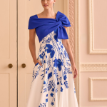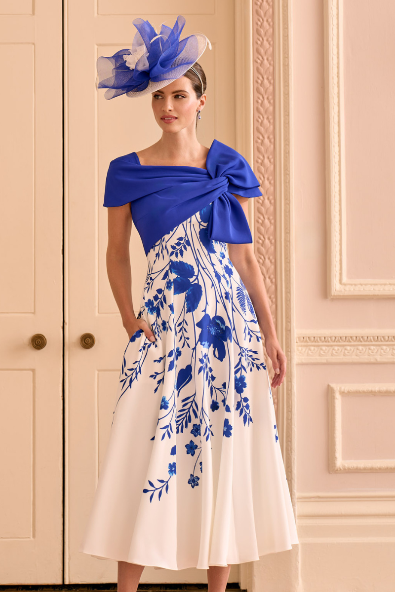 The John Charles Frampton Dish hat comprises a basket weave 12″ dish base trimmed with a flower nestled in crinoline offset with feathers.