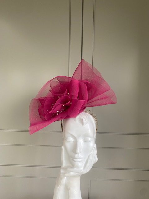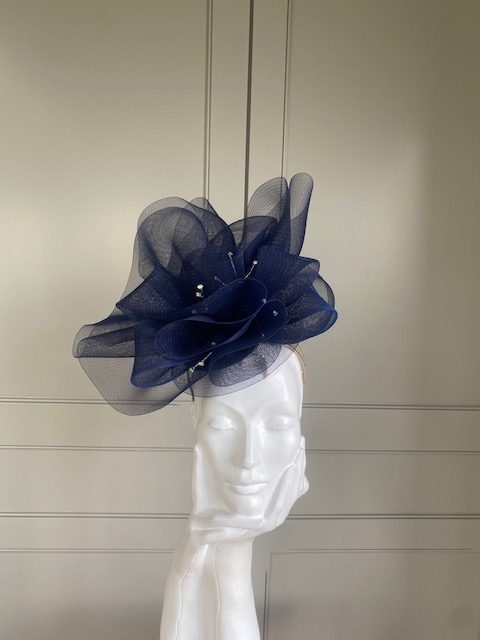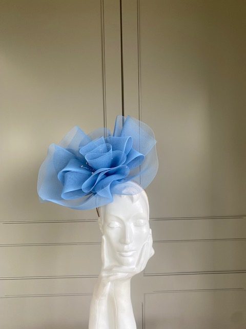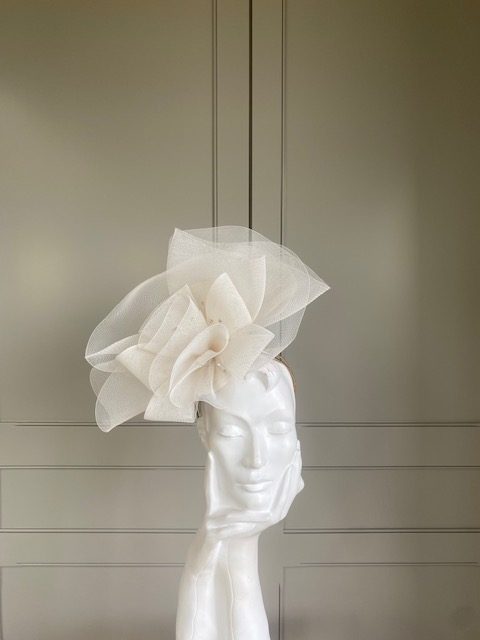 The John Charles Norwich headband comprises a ribbon wrapped double headband, which will be matched to your hair colour, generously topped with a crinoline swirl which is interspersed with wired crystals.