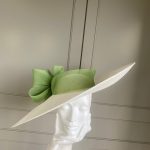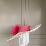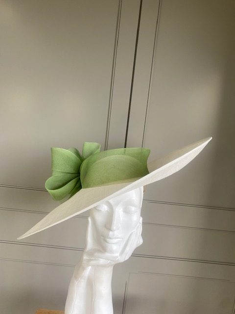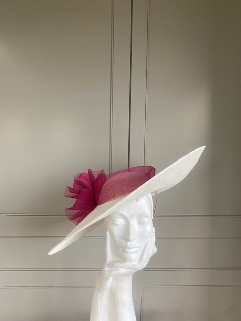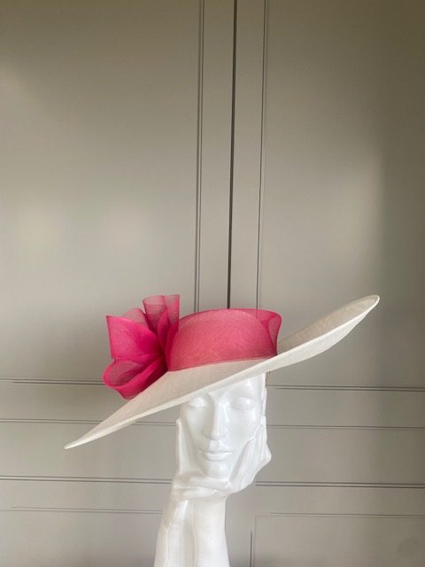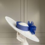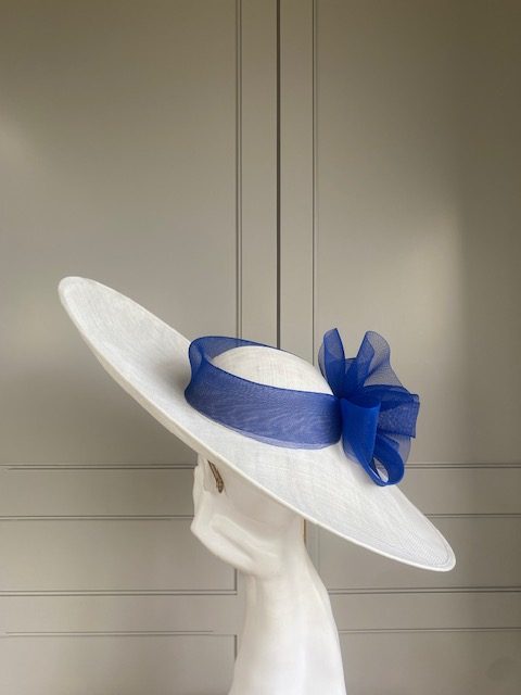 The John Charles Surrey Hat comprises a sinamay base with structured crown trimmed with a deep crinoline hat band and bow.