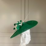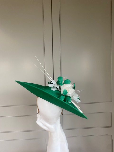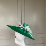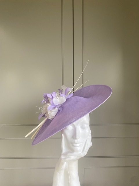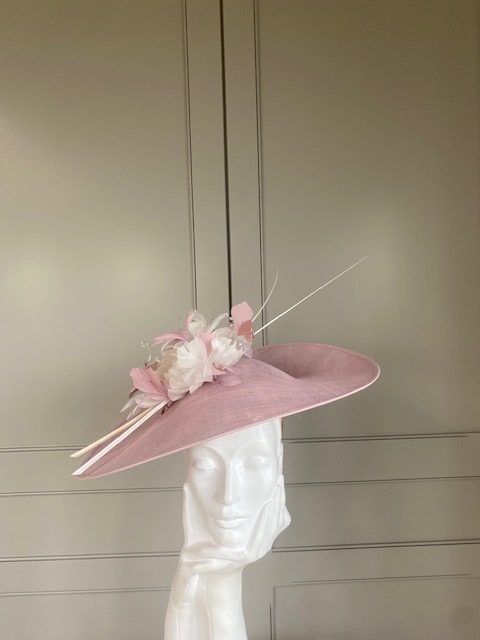The John Charles Swansea Hat comprises a sinamay dish base trimmed to the top with an arrangement of small feather flowers and cut feathers, finished beautifully with two elegant stripped quills.