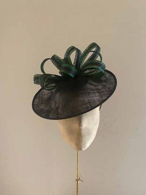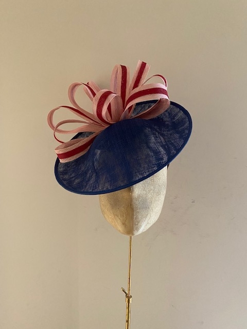 The Kanto Dish Hat comprises a 12″ sinamay dish base trimmed with 1 ” sinamay loops overlaid with a second colour. This hat comes on a comfortable double head band which will be ribbon wrapped to match your hair colour.