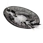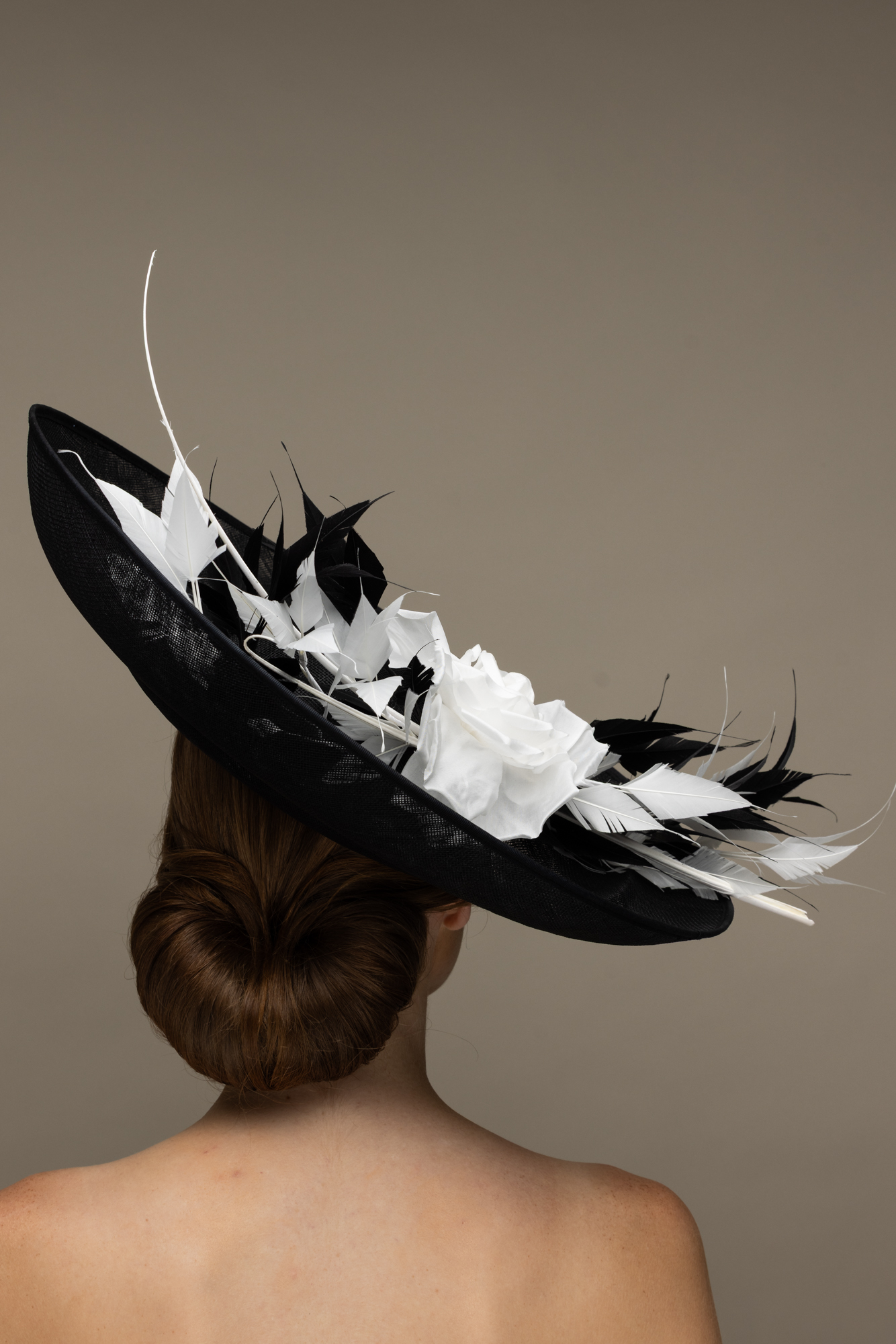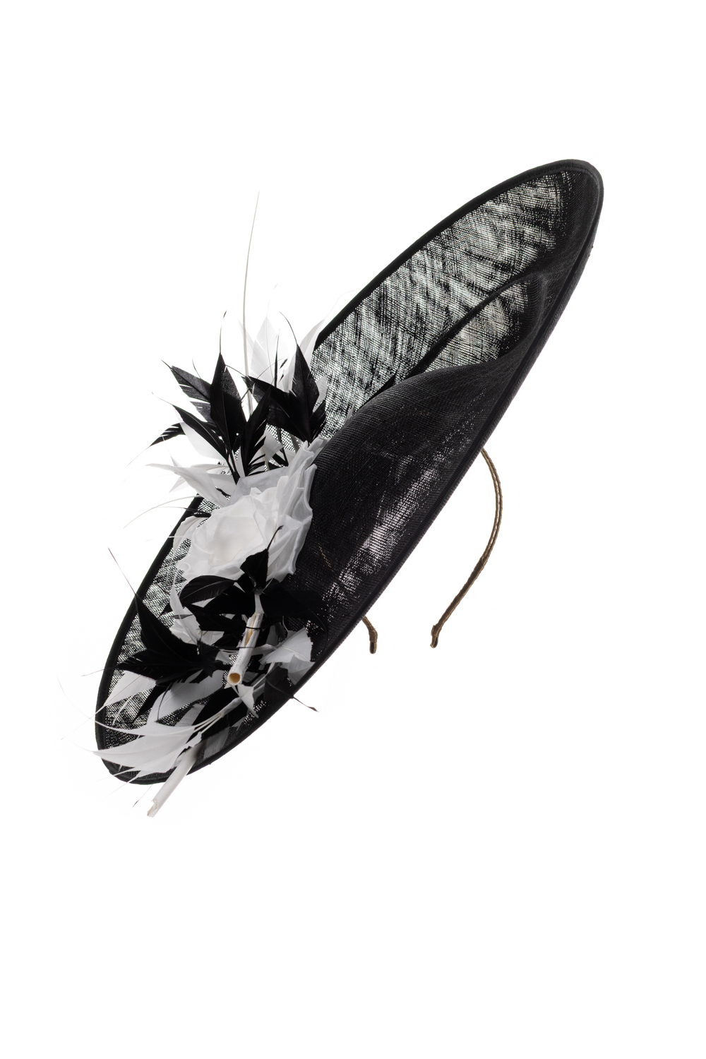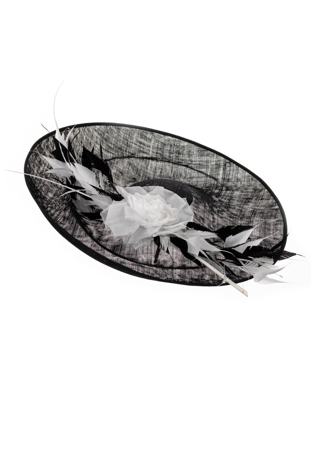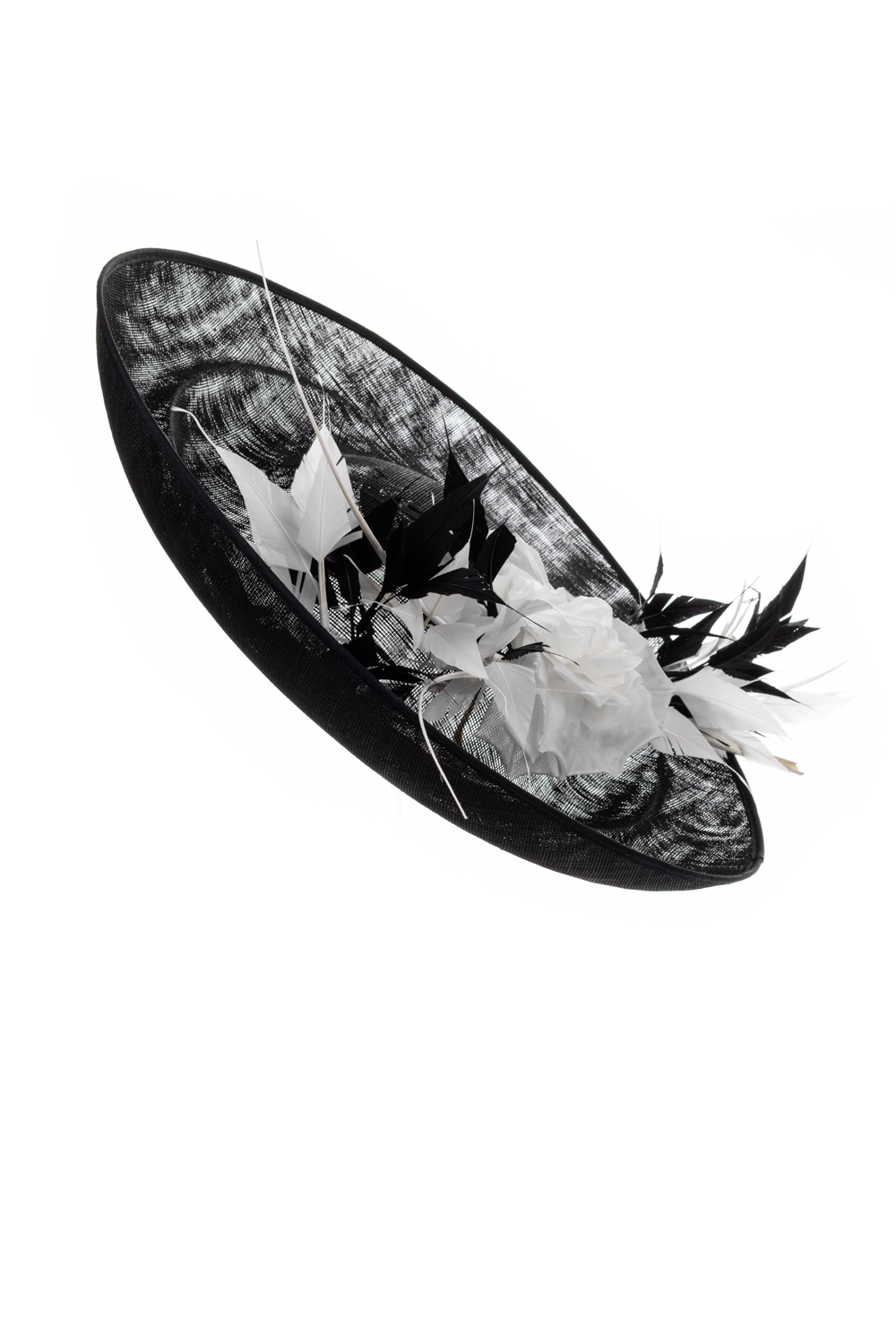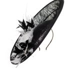 The Kingfisher Dish Hat comprises a large sinamay dish base with upturned brim, generously trimed with a large rose, spiked feathers and two elegant quills.