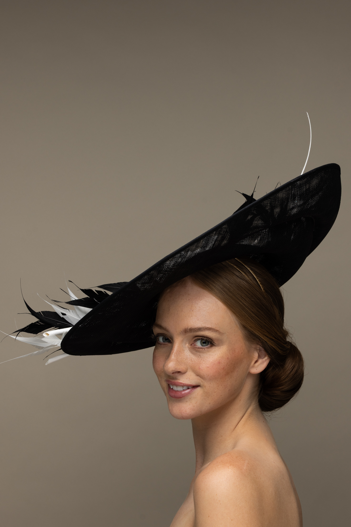 This hat comes on a comfortable, ribbon wrapped double headband which we will match to your hair colour.