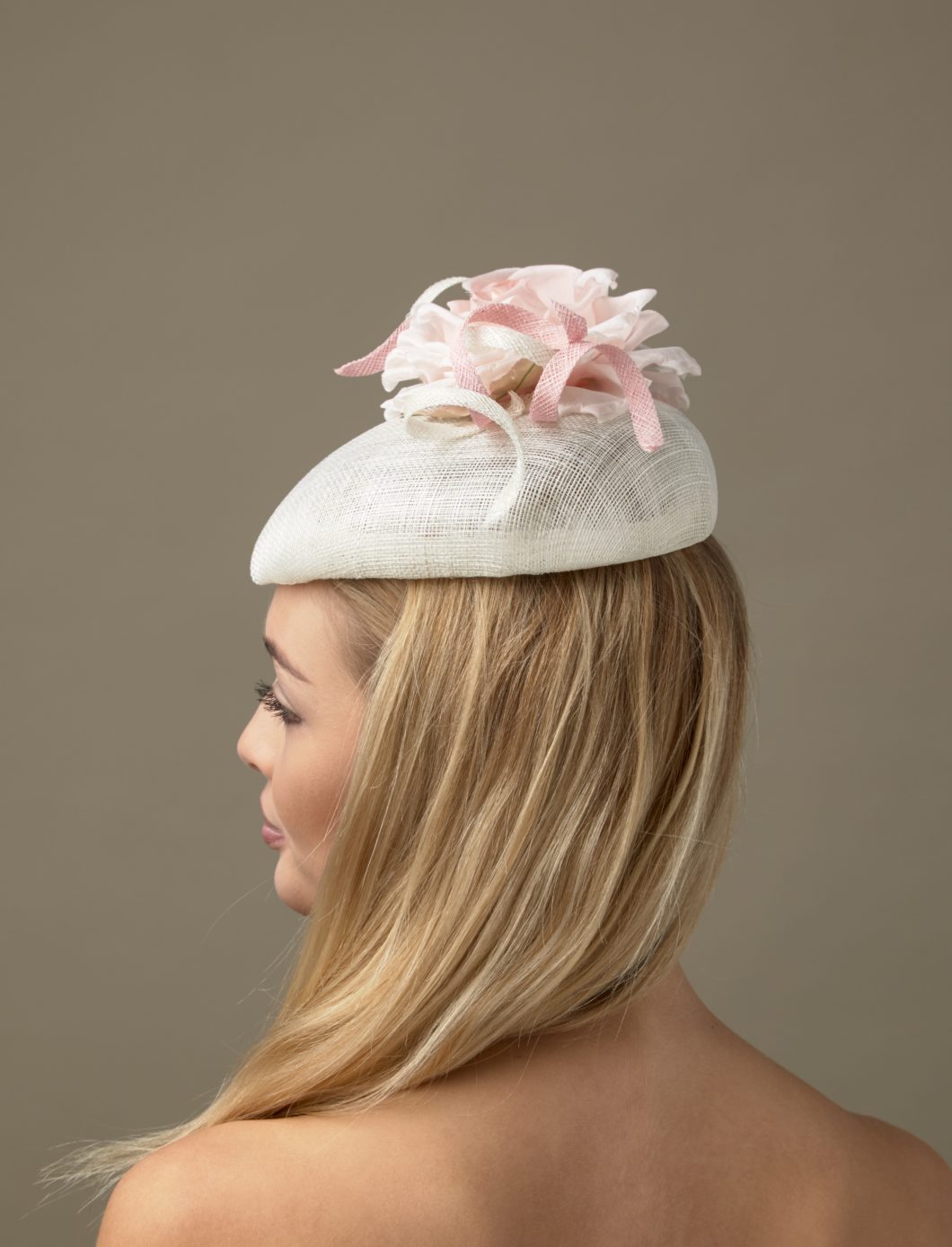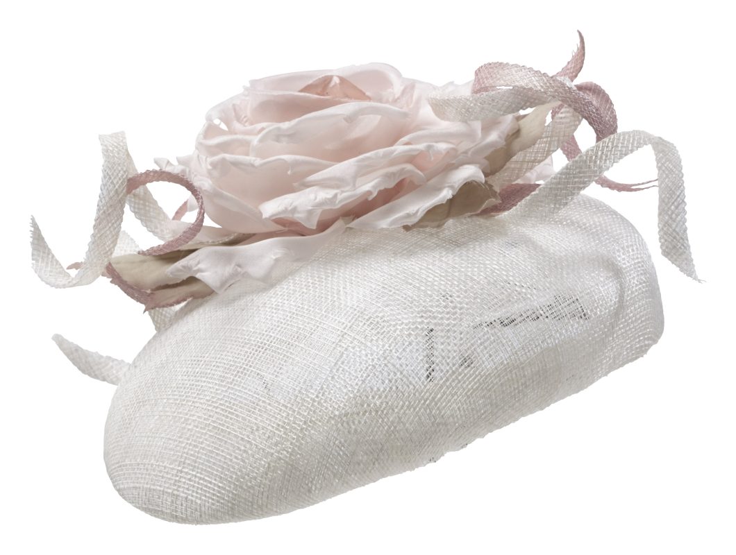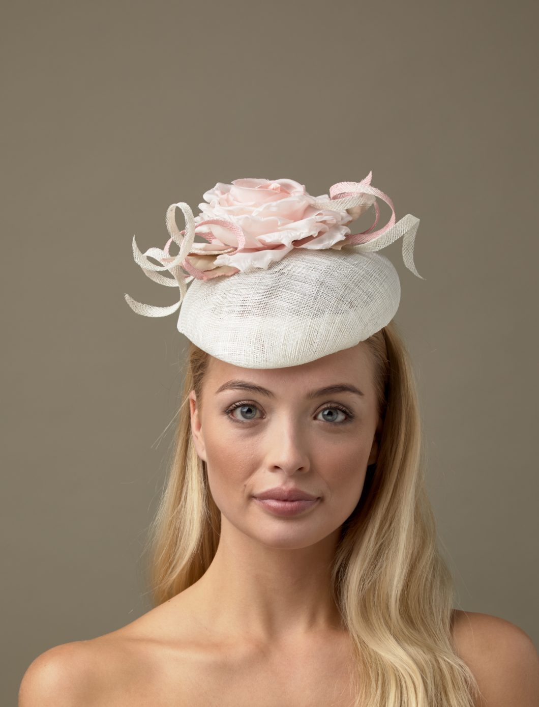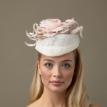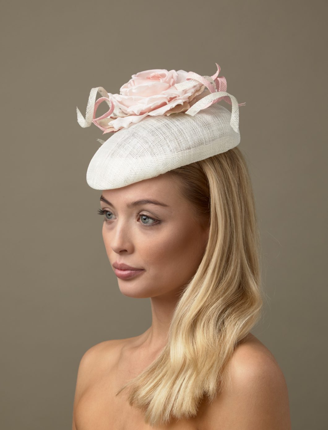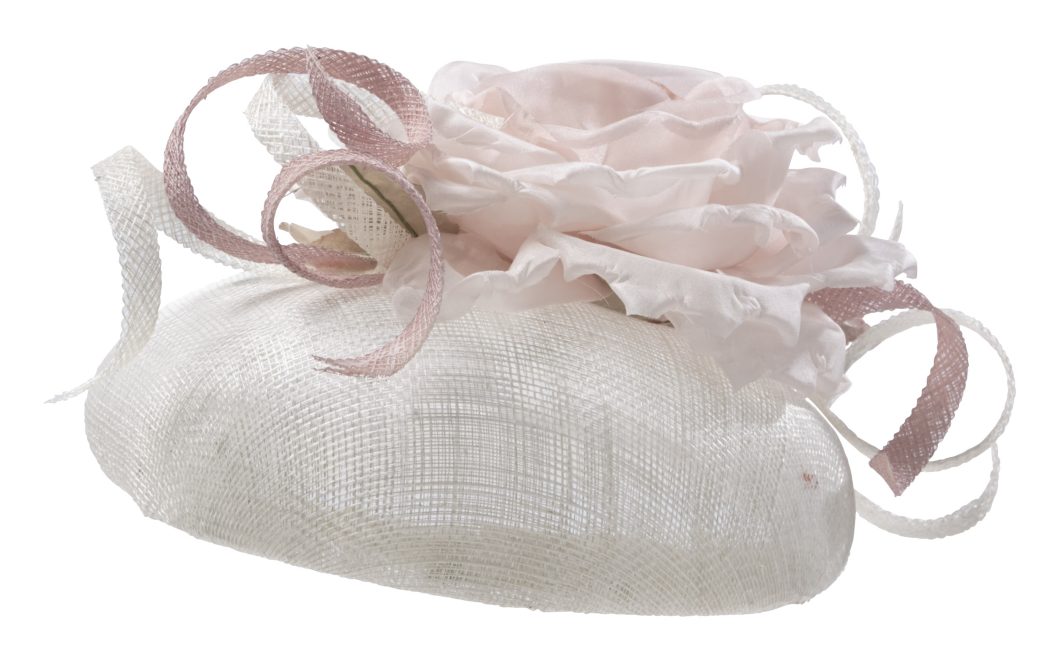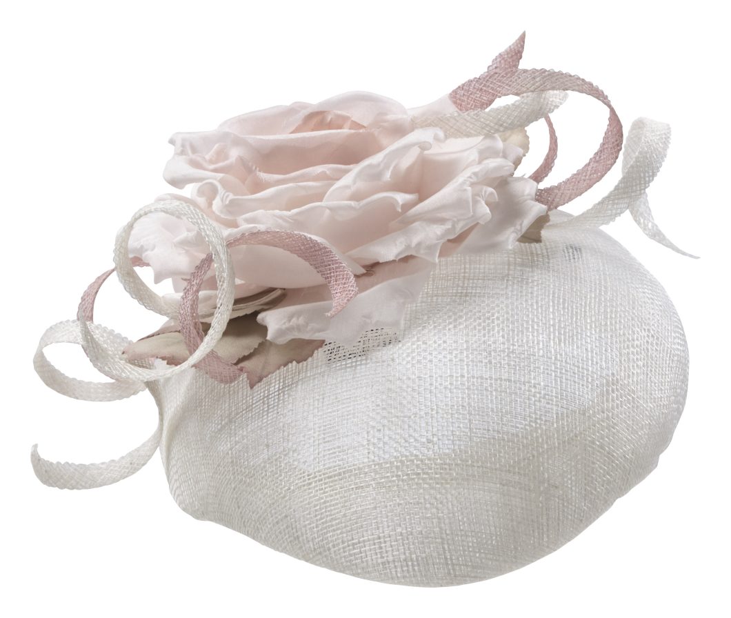 The Kir is made up of a sinamay pillbox base adorned at the back with a large fabric English rose. The rose is set of beautifully with some small curls of sinamay.