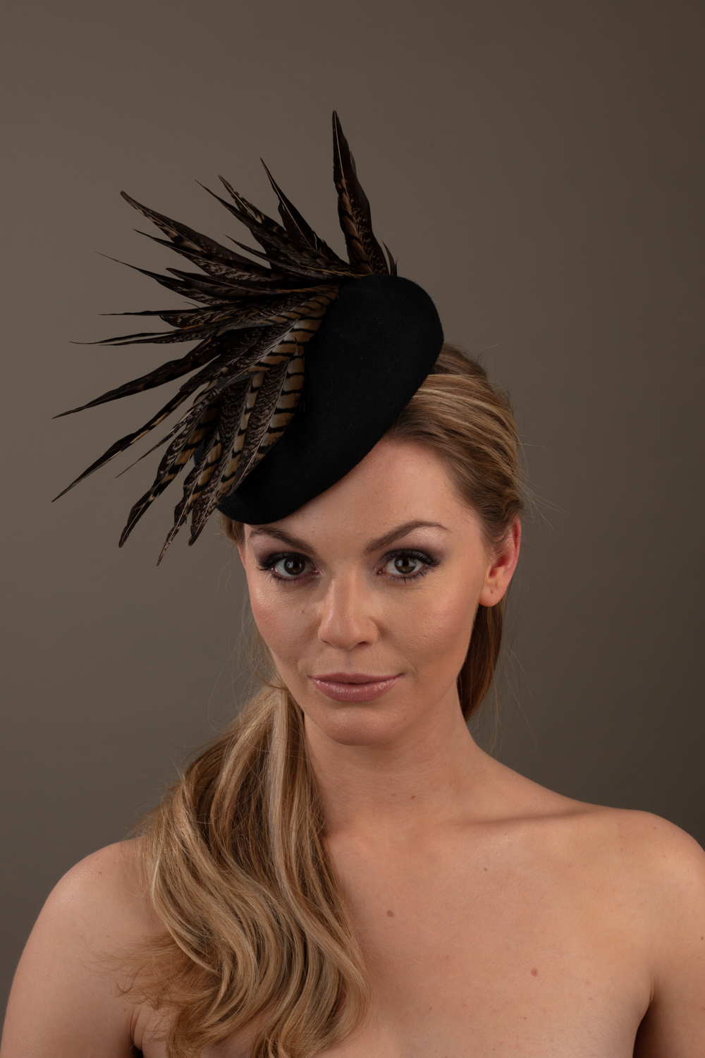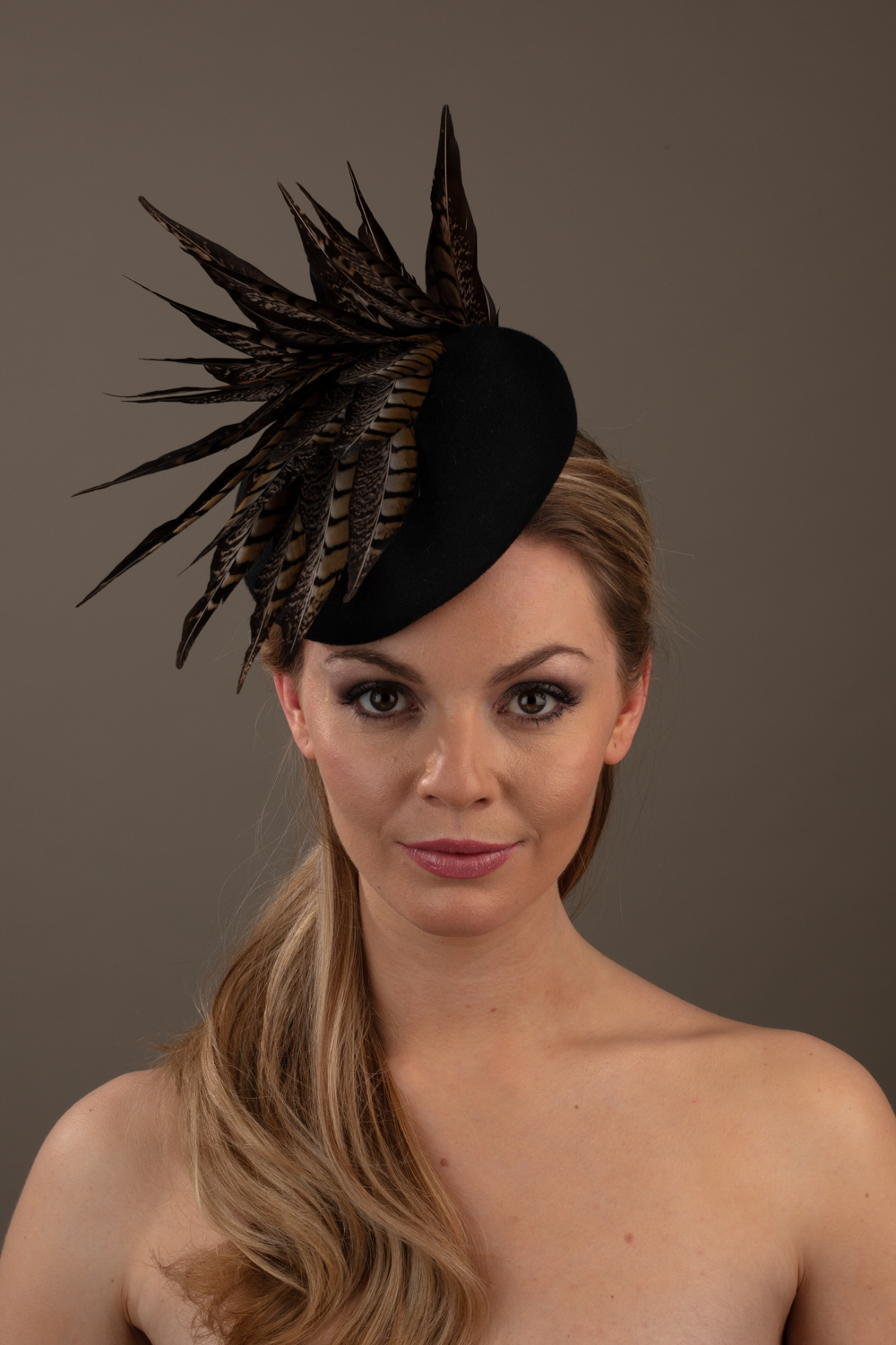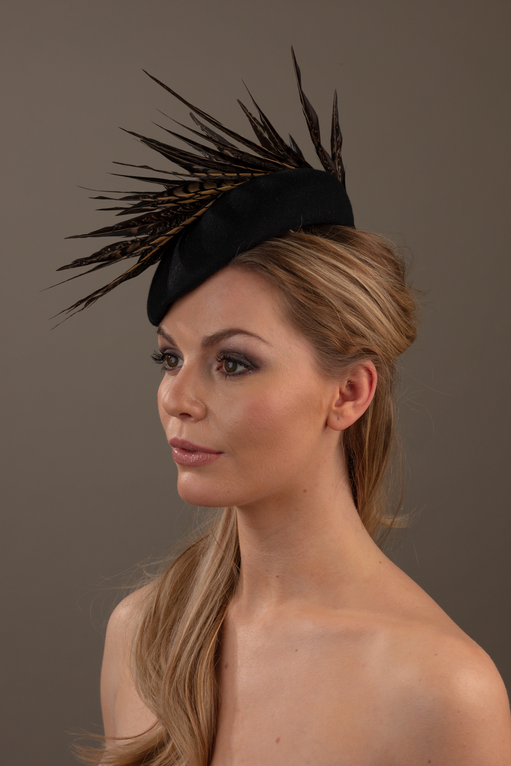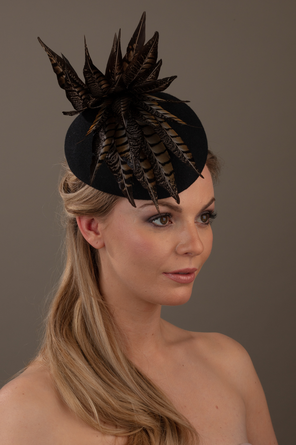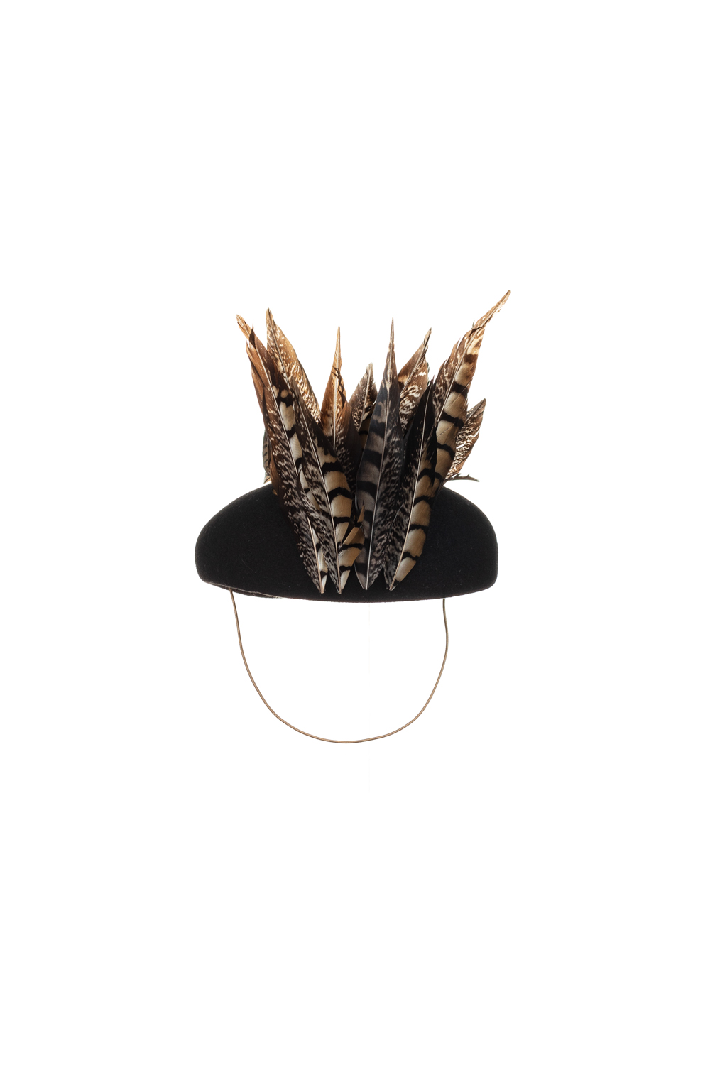 The Krug Pillbox Hat comprises a neat felt base trimmed with a central line of spiked pheasant feathers running from back to front.