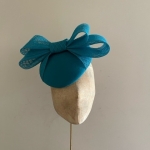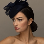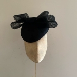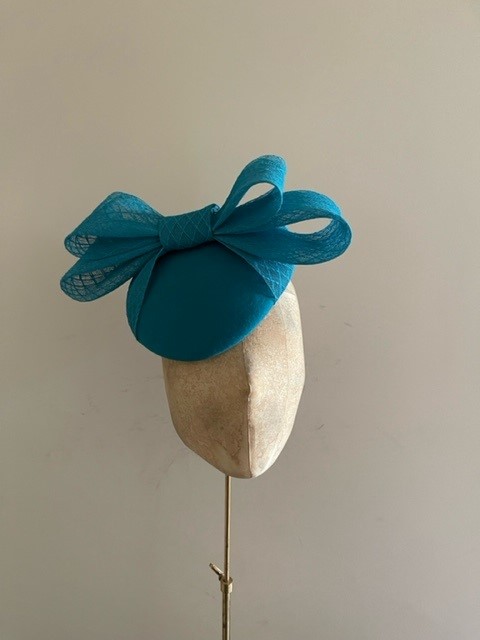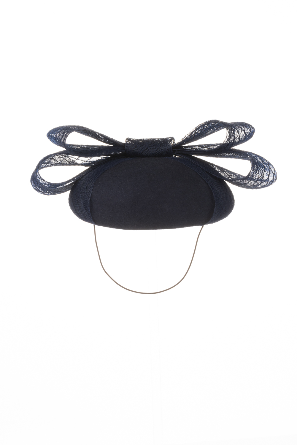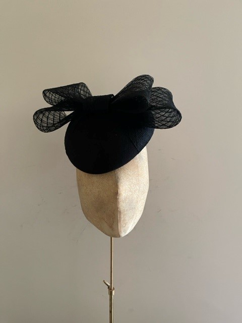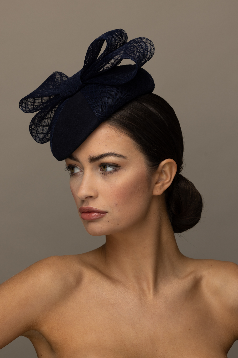 The Laurel Pillbox Hat is sure to be a favourite this season. It comprises a felt pillbox shaped base trimmed with a large bow in diamond patterned crinoline which wraps under the pillbox base.