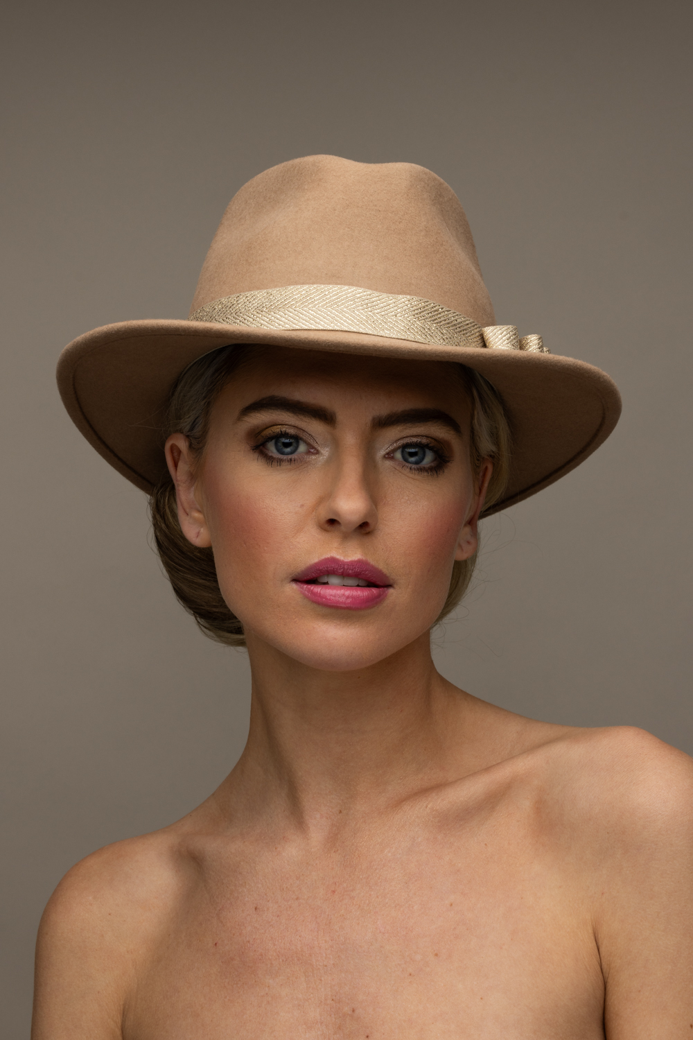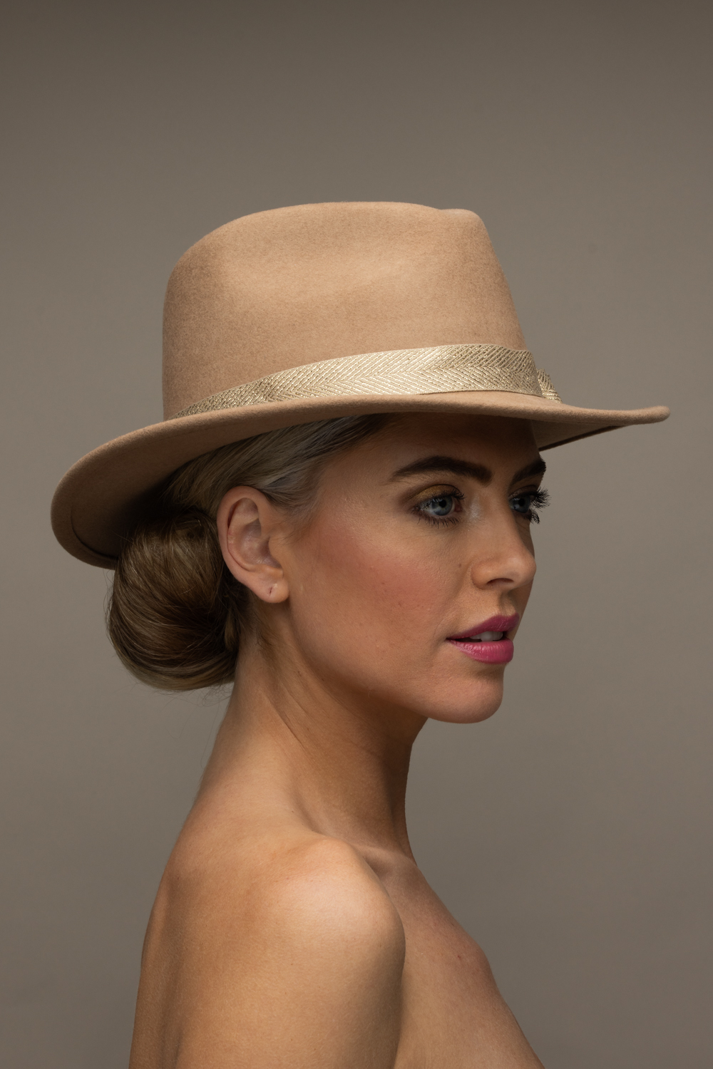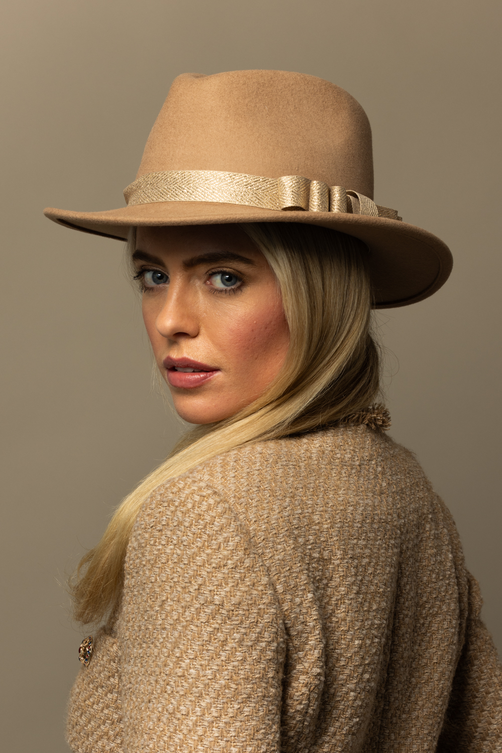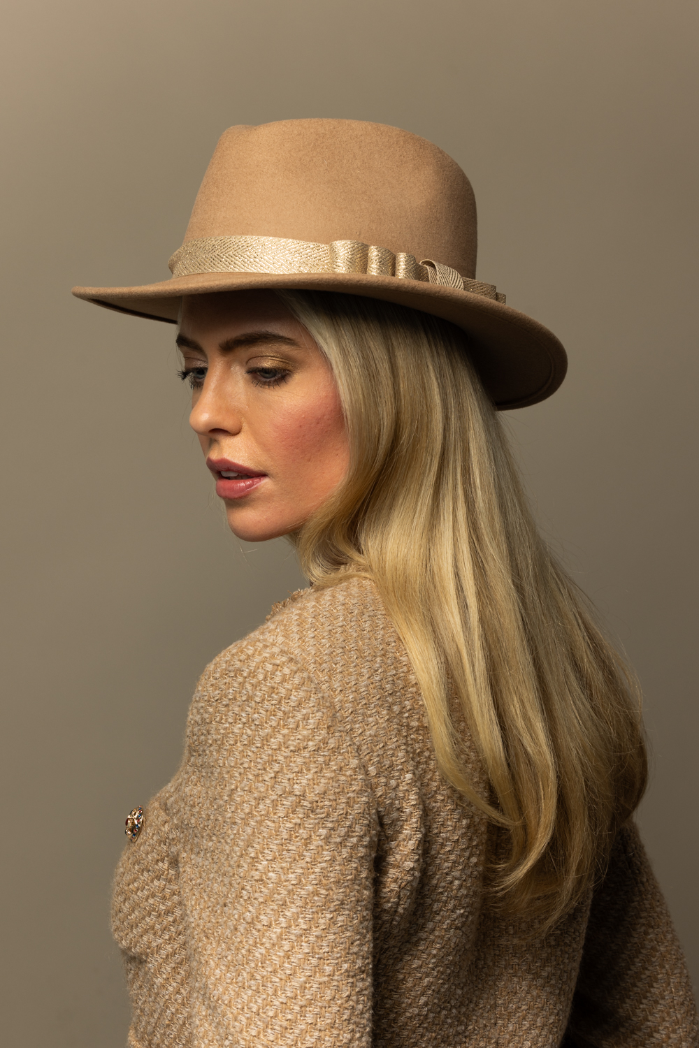 The Lomond fedora hat comprises a felt fedora base trimmed with a gold grosgrain ribbon as a hat band. We love it in the camel colourway against the gold.