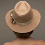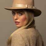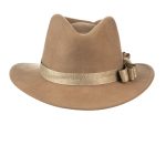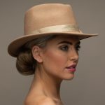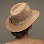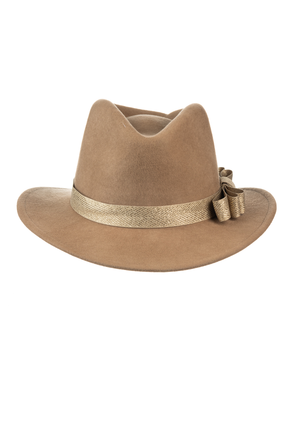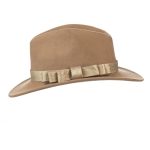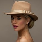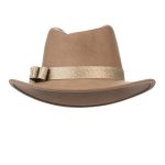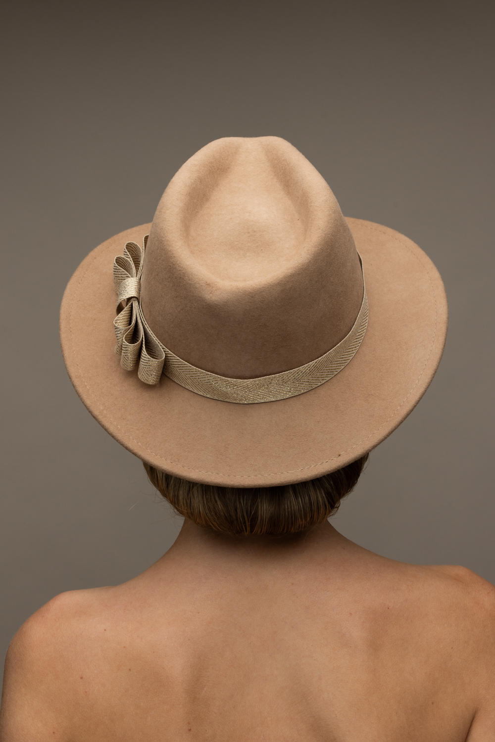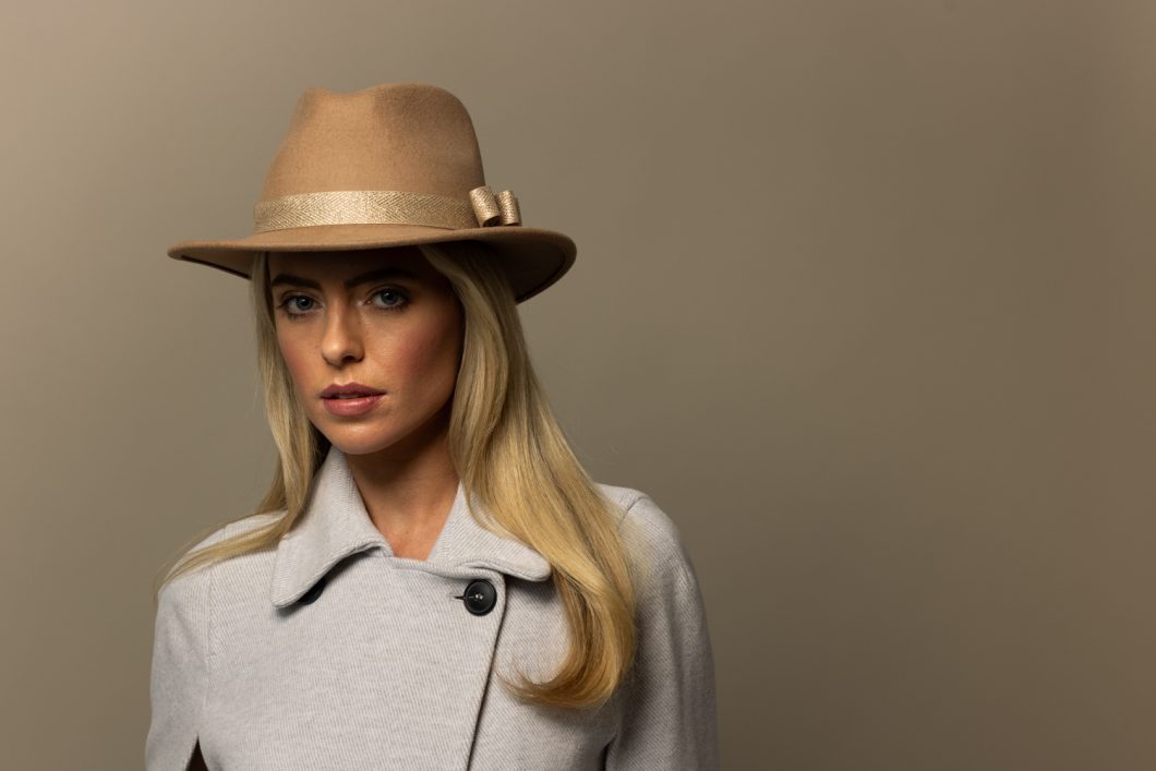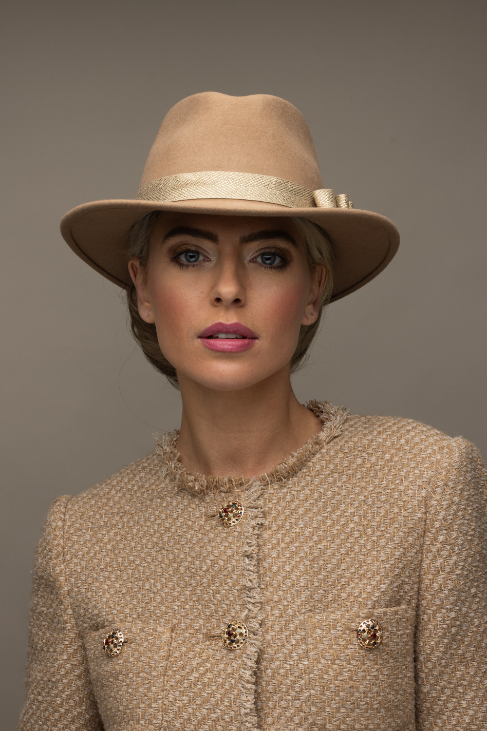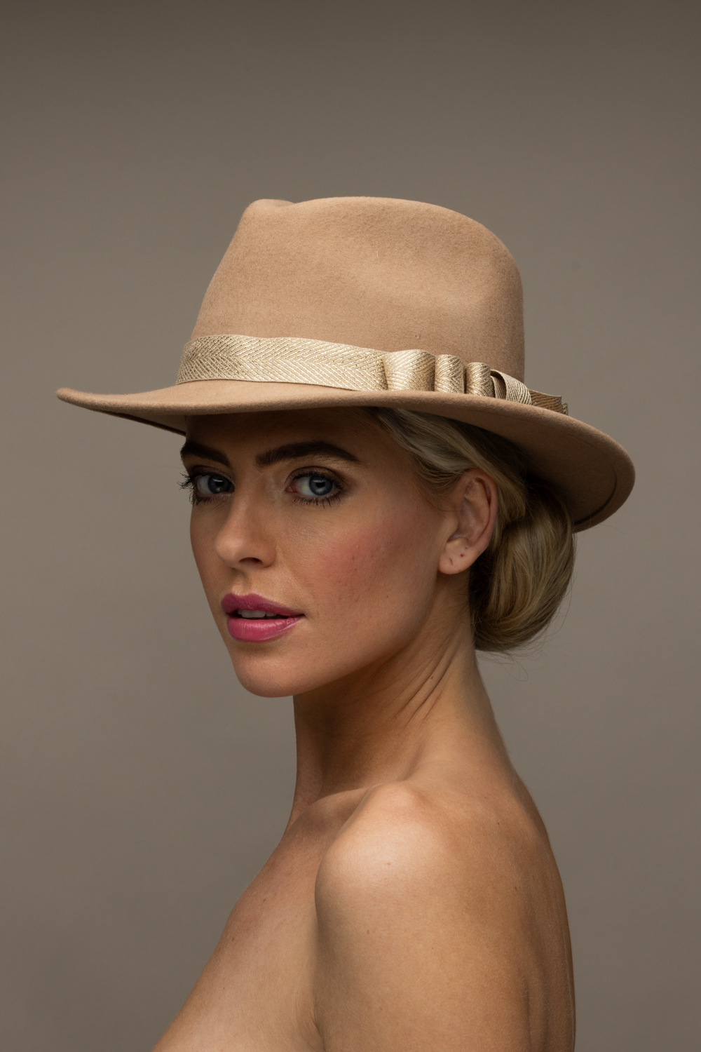 The Lomond fedora hat comprises a felt fedora base trimmed with a gold grosgrain ribbon as a hat band. We love it in the camel colourway against the gold.