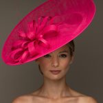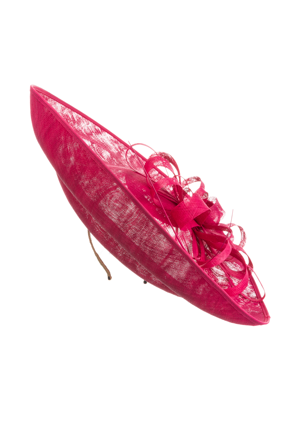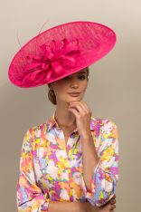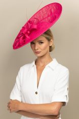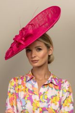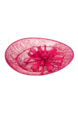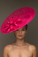 The Madison Dish hat comprises a large sinamay dish base on a headband with an upturn to the back of the hat. The base is trimmed with a flower of sinamay loops with a stripped quill.