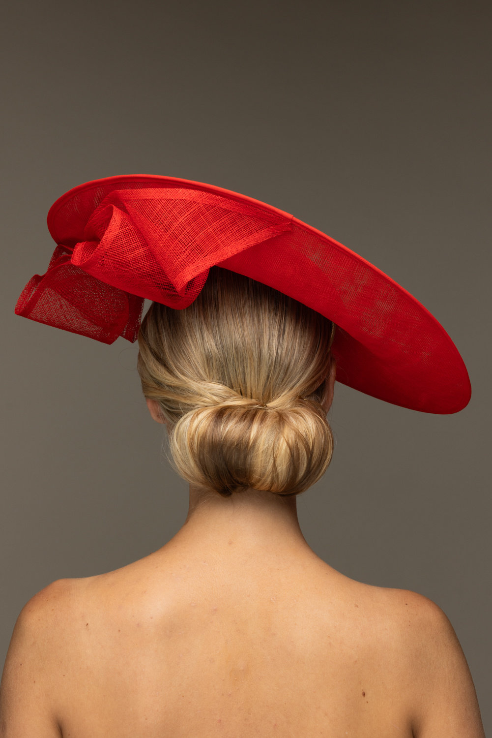 The Major Dish hat comprises an 18″ sinama dish base trimmed to the underside of the brim with a large sinamay bow.