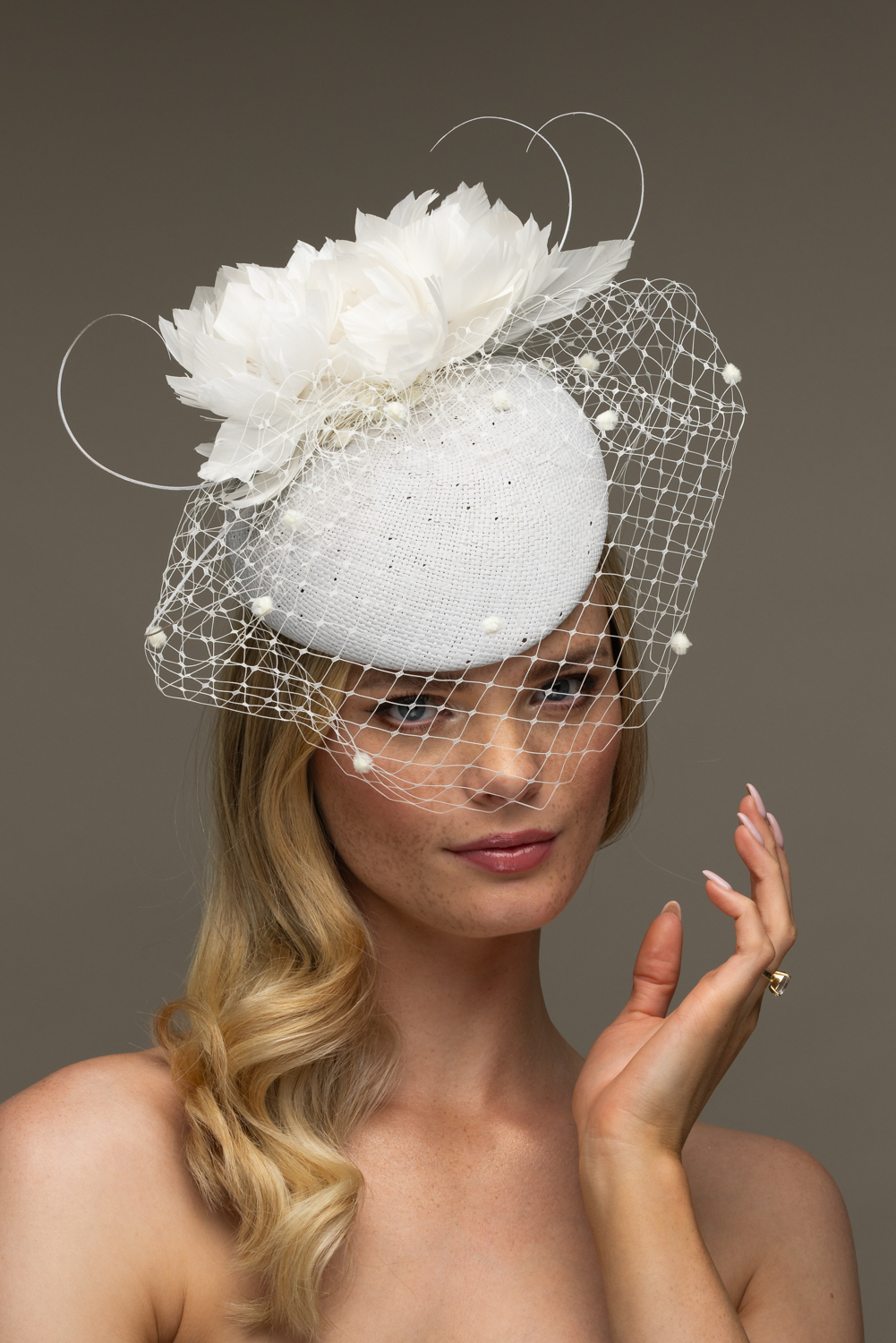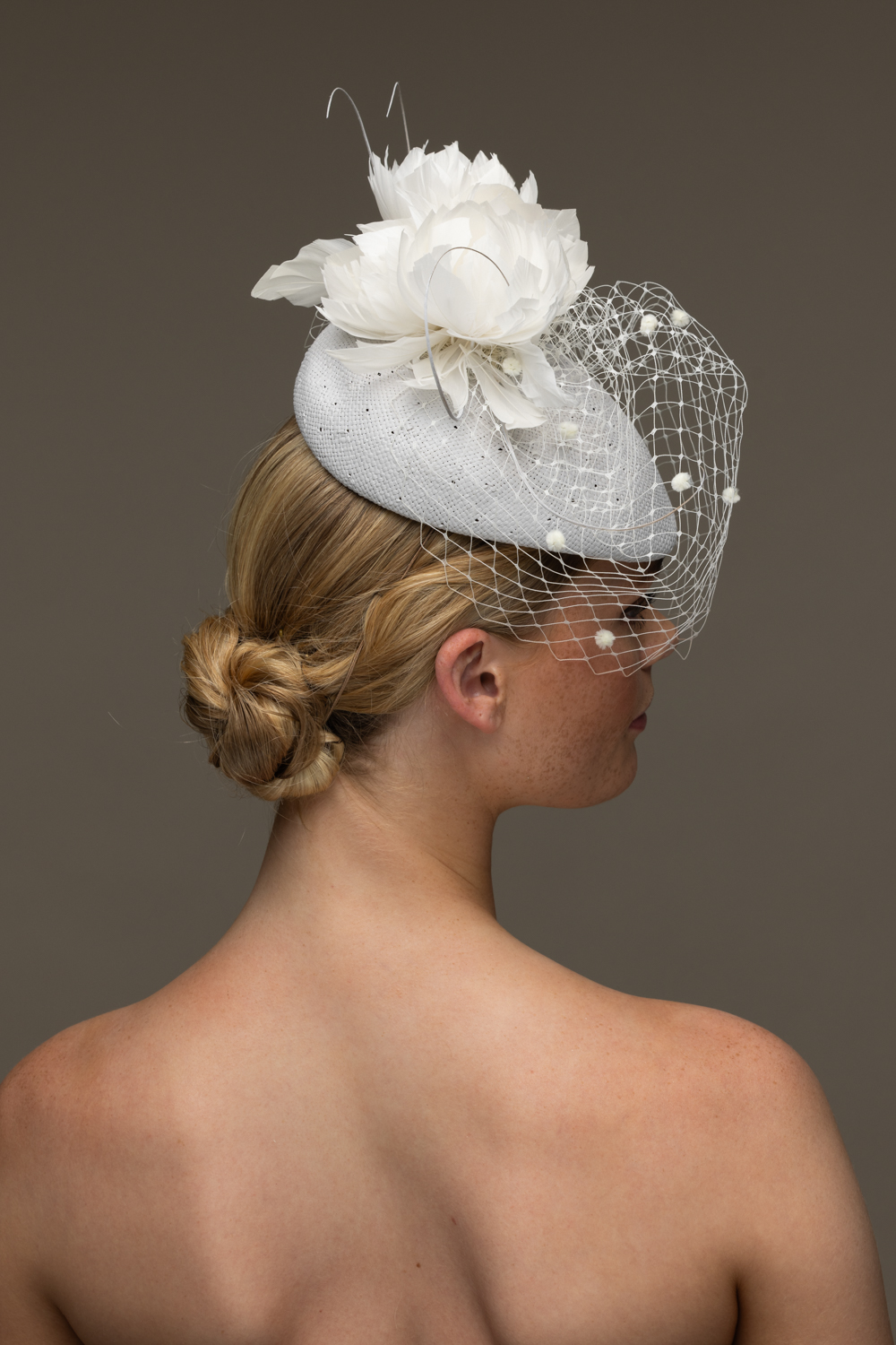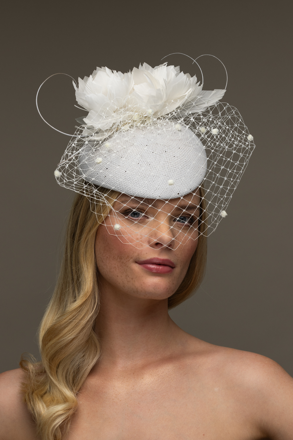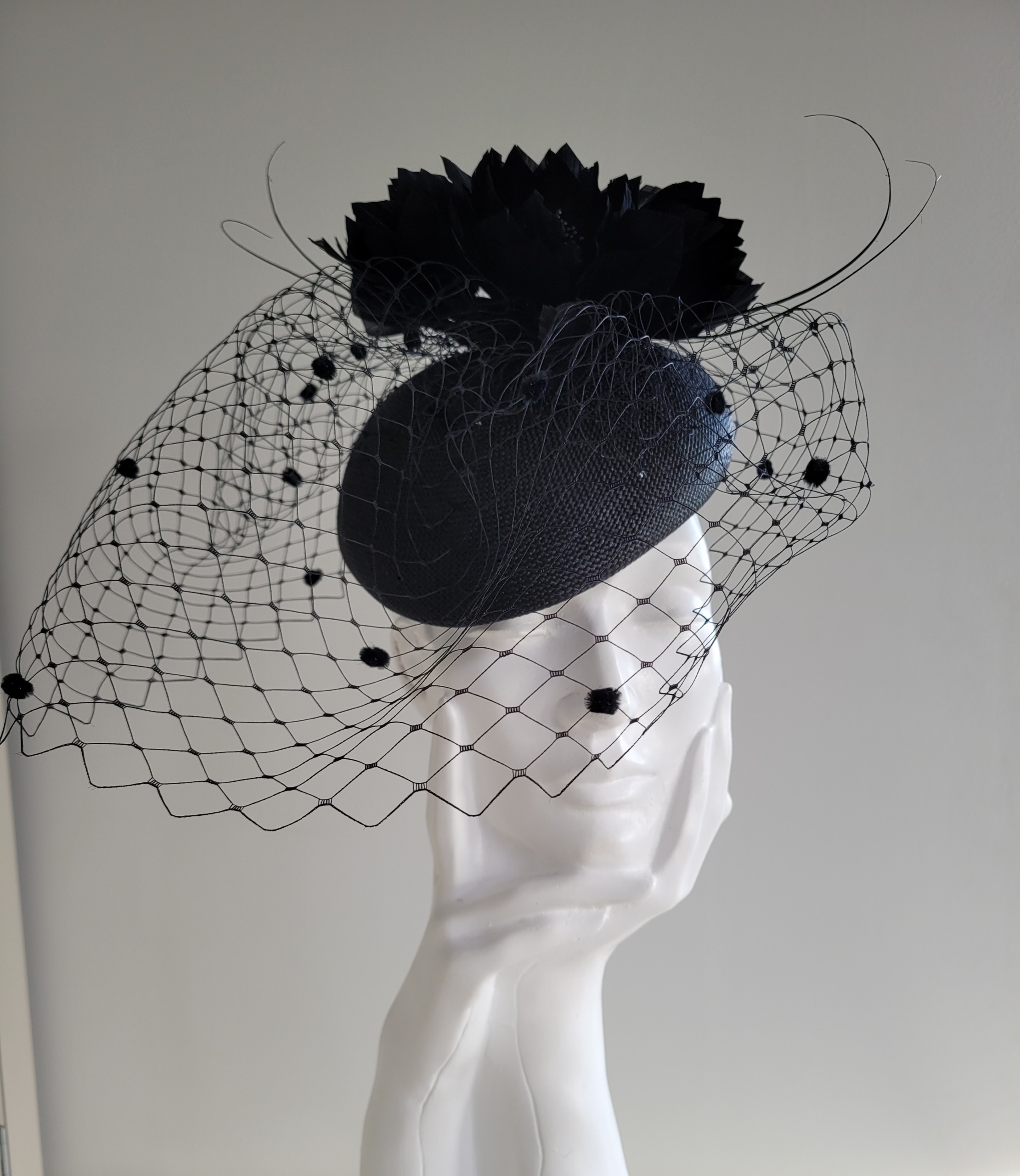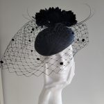The Marine Pillbox hat comprises a straw pillbox base trimmed to the top with feather flowers and curled quills, finished off with a spotted veil.