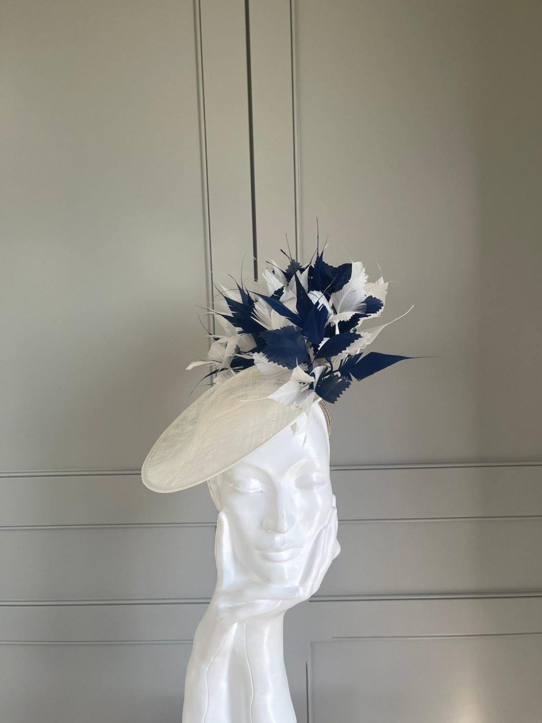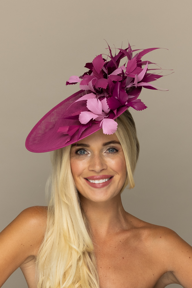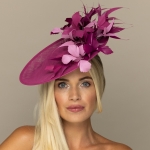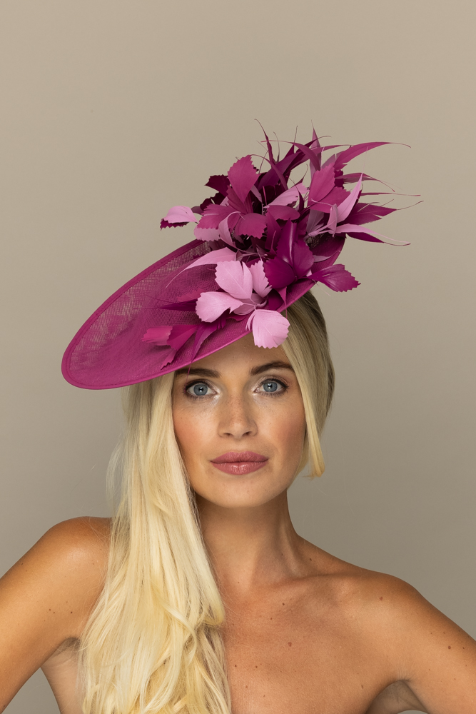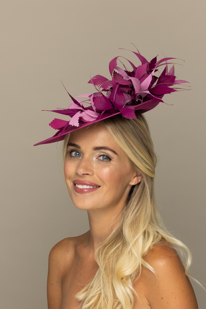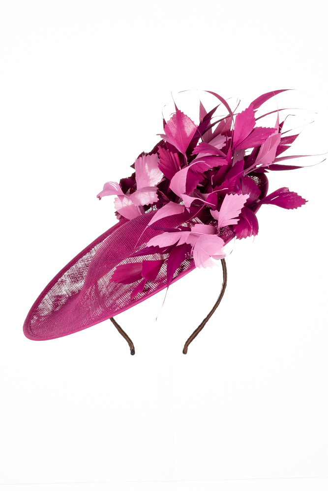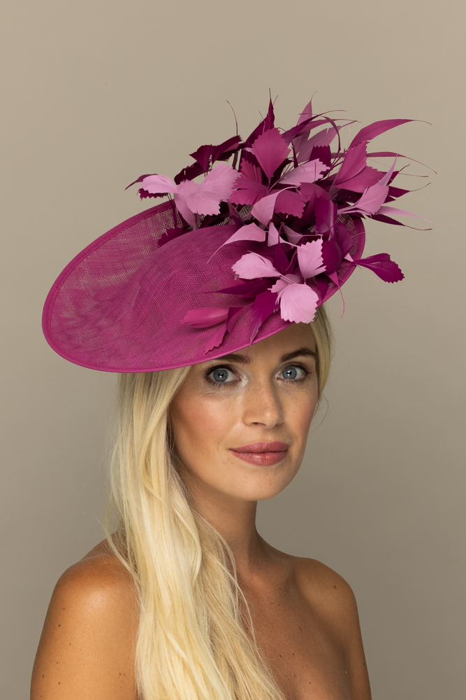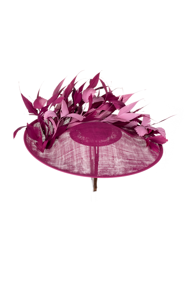 The Menorca dish hat comprises a 12″ sinamay dish base trimmed with a spray of spiked and zig-zag edged feathers to one side in up to three colours. The hat comes on a ribbon-wrapped double headband for comfort.
