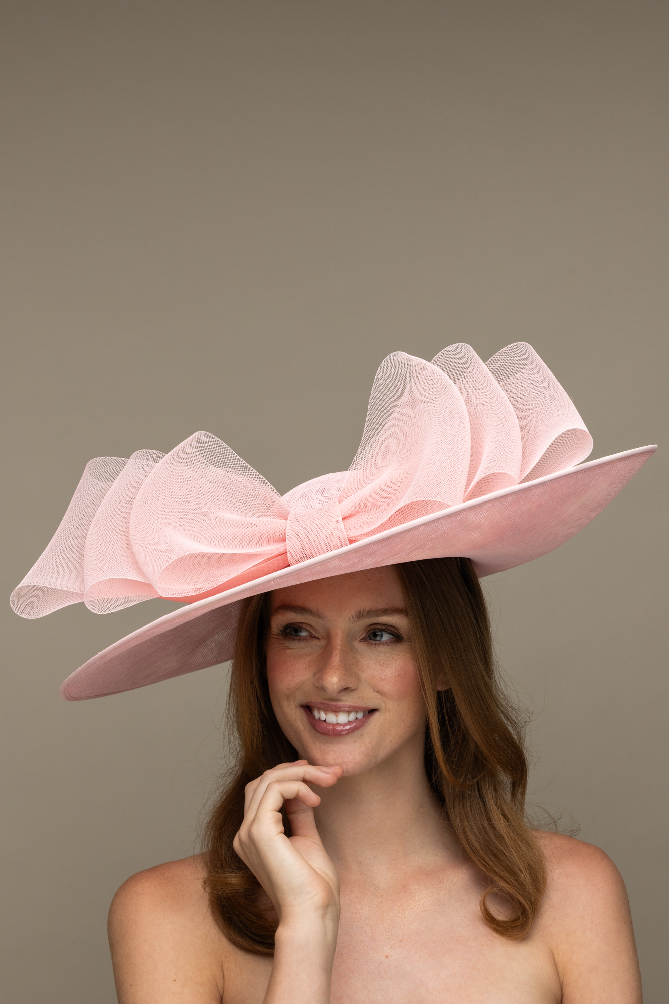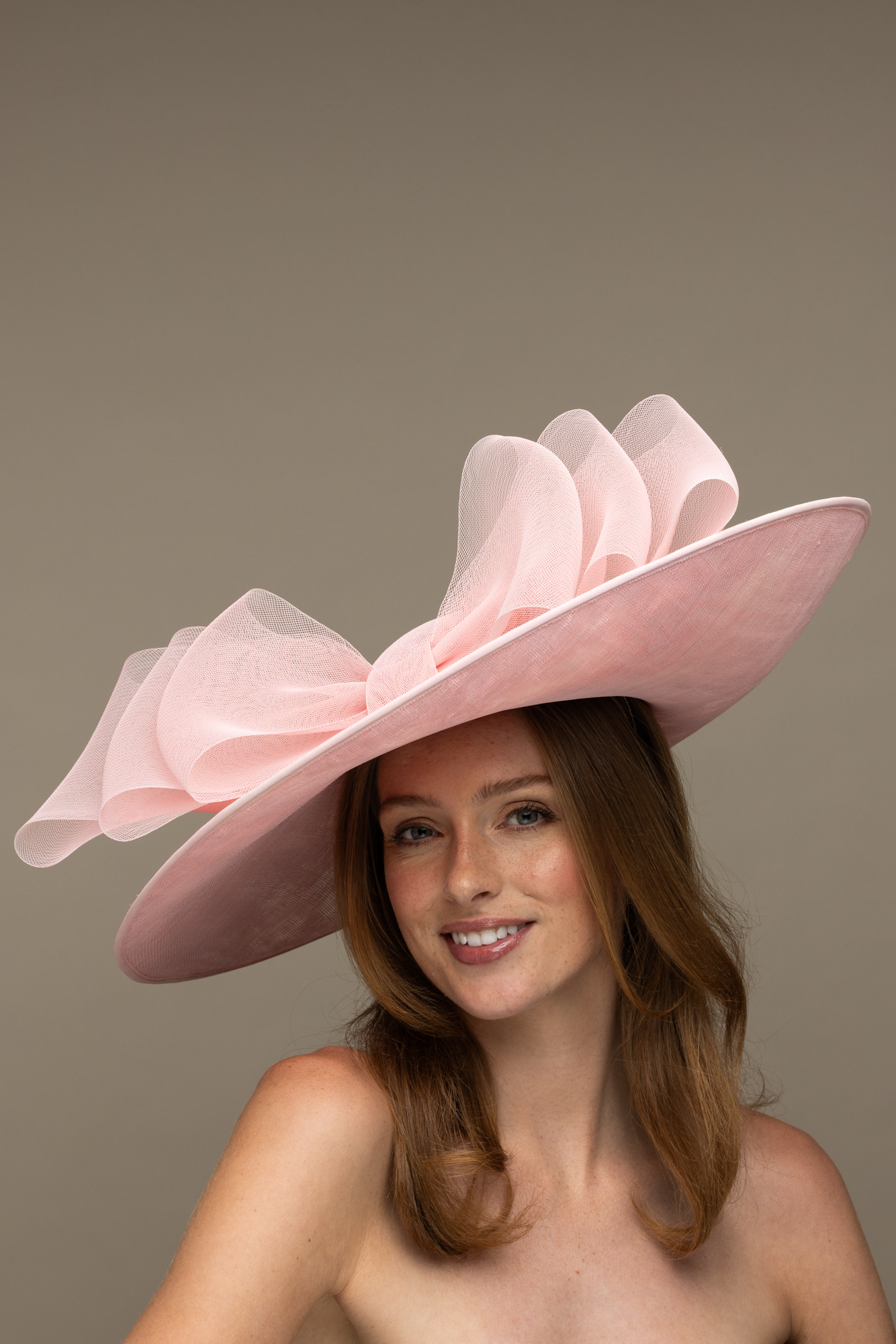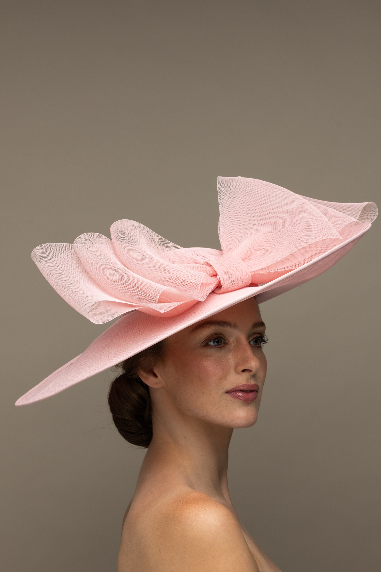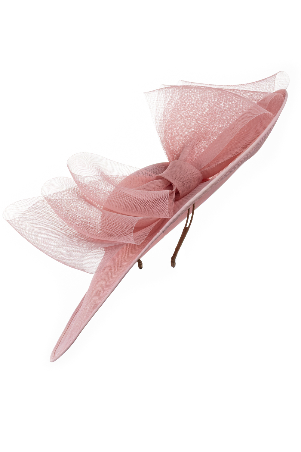 The Merlin Hat comprises a large base with upturn to one side of the brim trimmed to the front with a large signature Hostie bow made from crinoline with three bow loops.