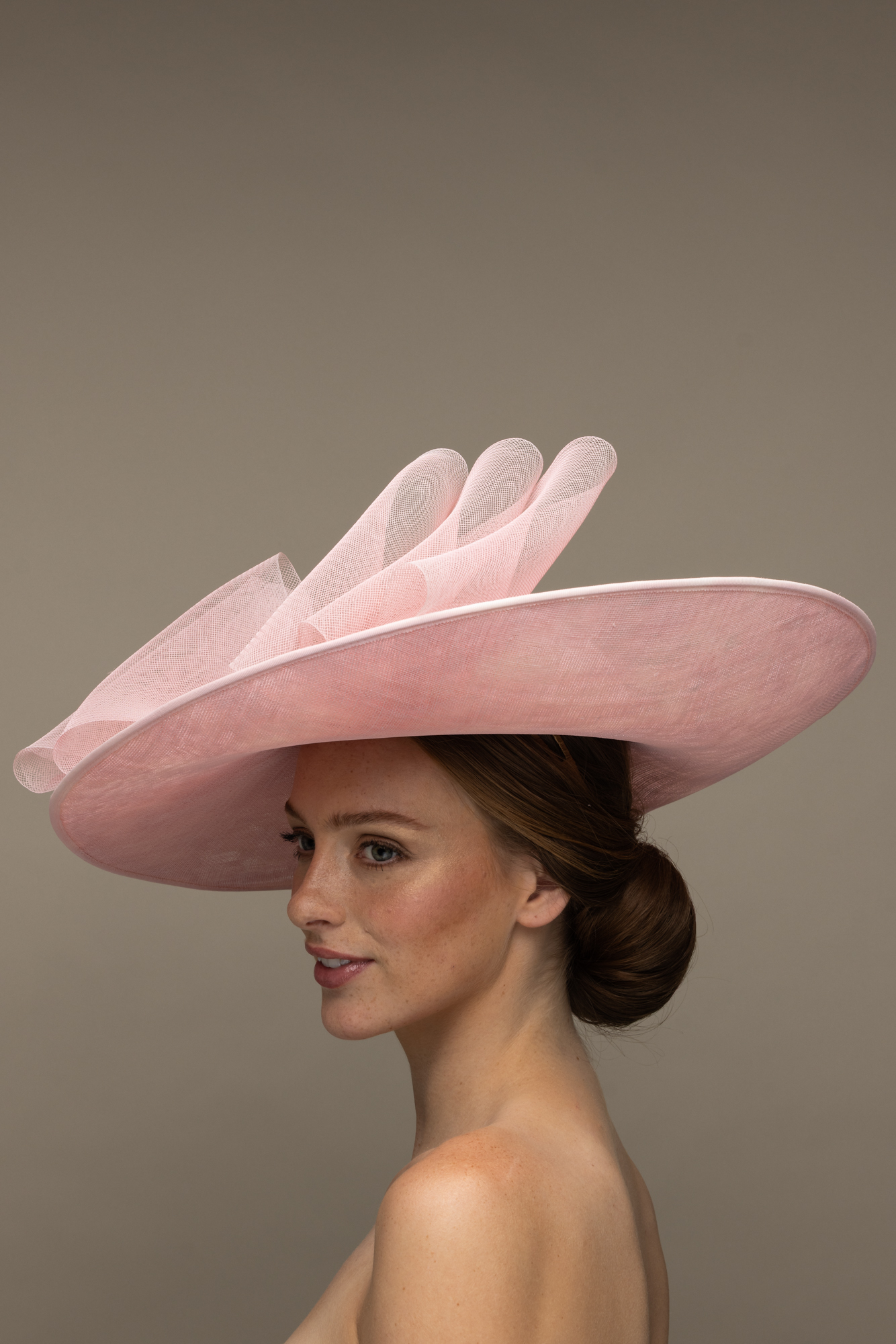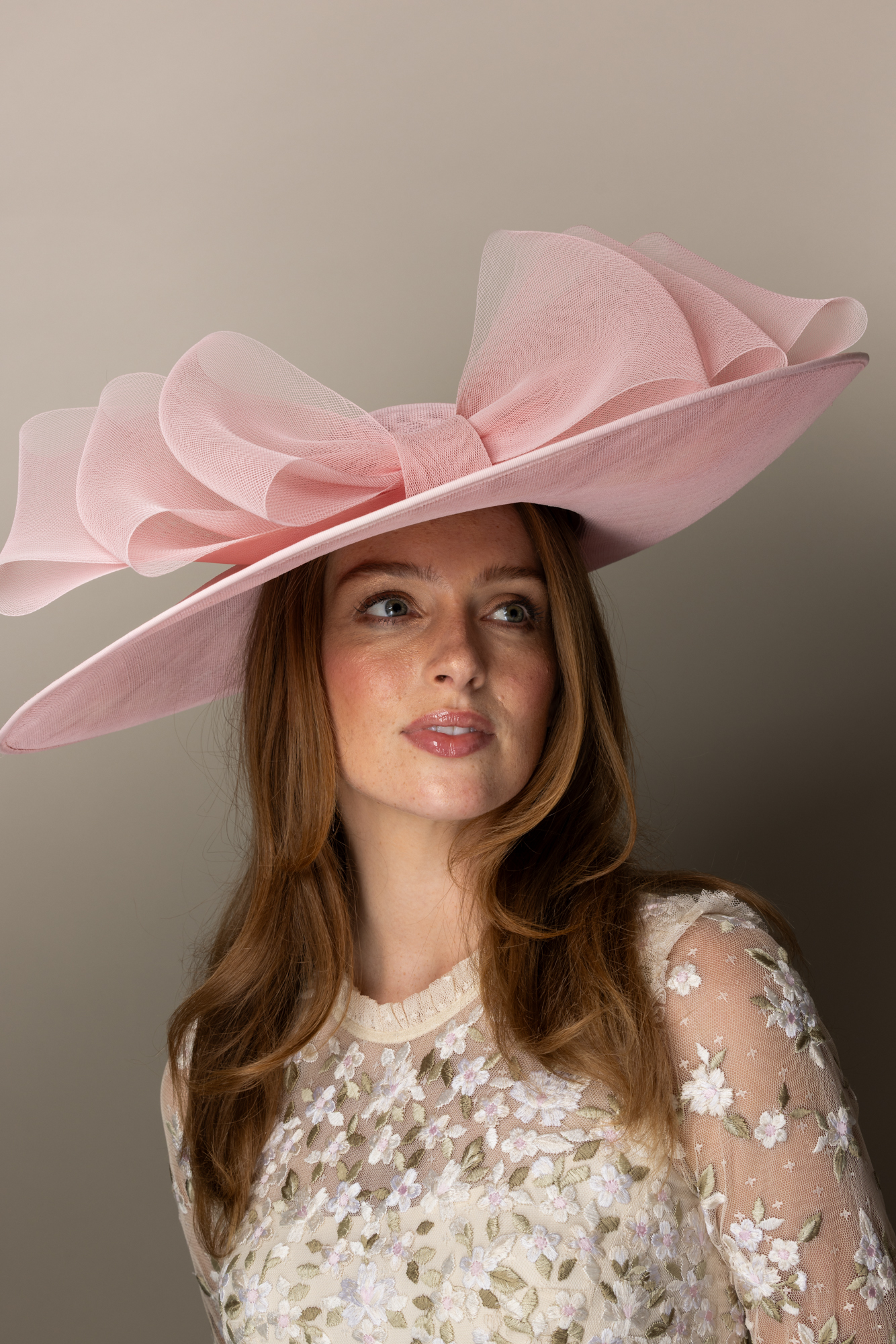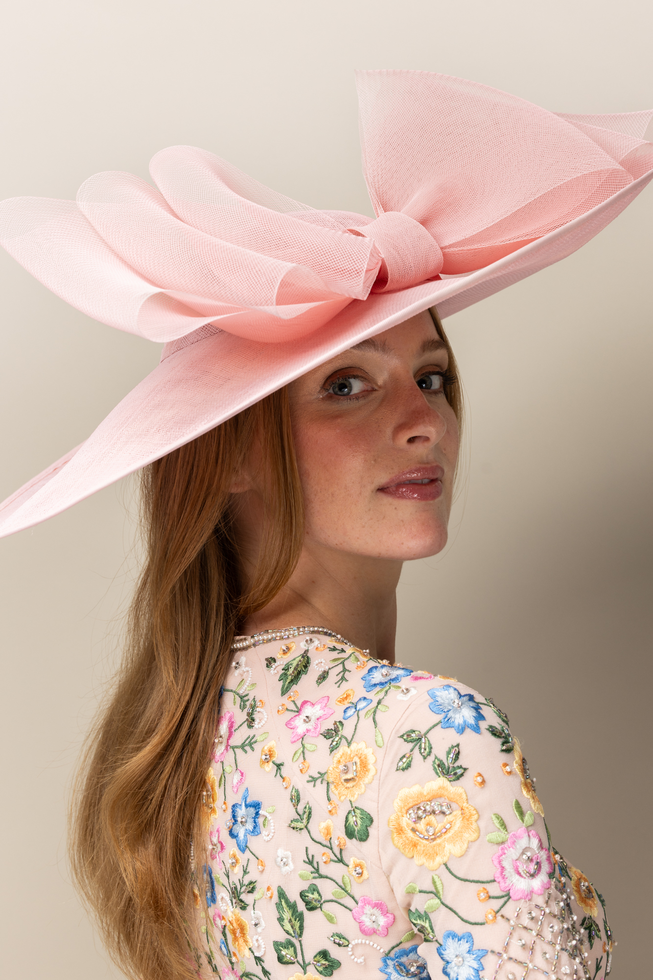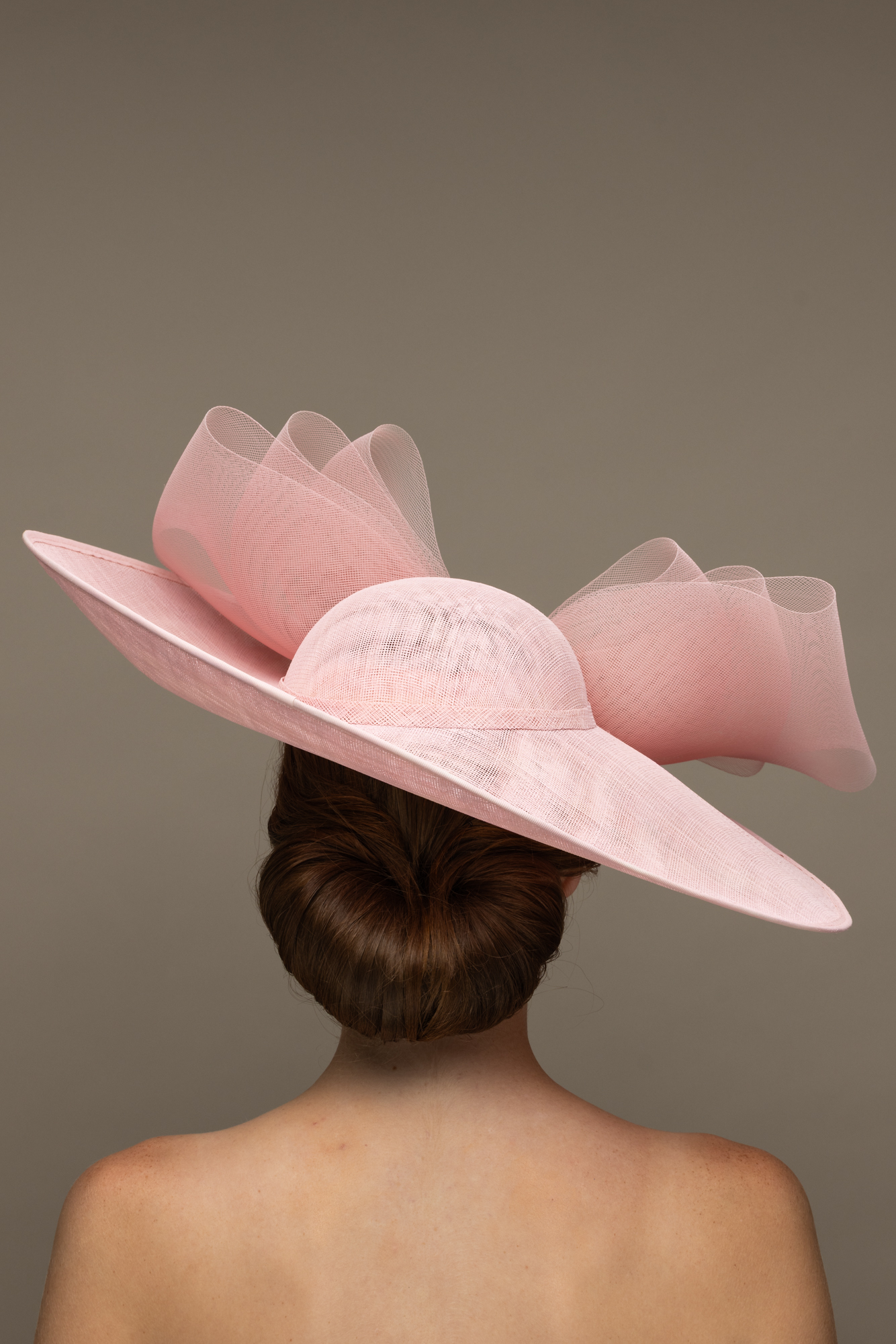 The Merlin Hat comprises a large base with upturn to one side of the brim trimmed to the front with a large signature Hostie bow made from crinoline with three bow loops.