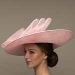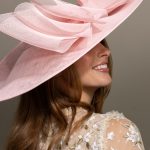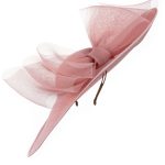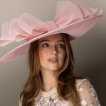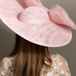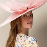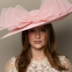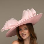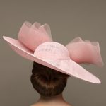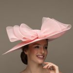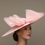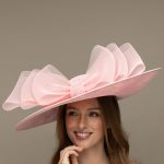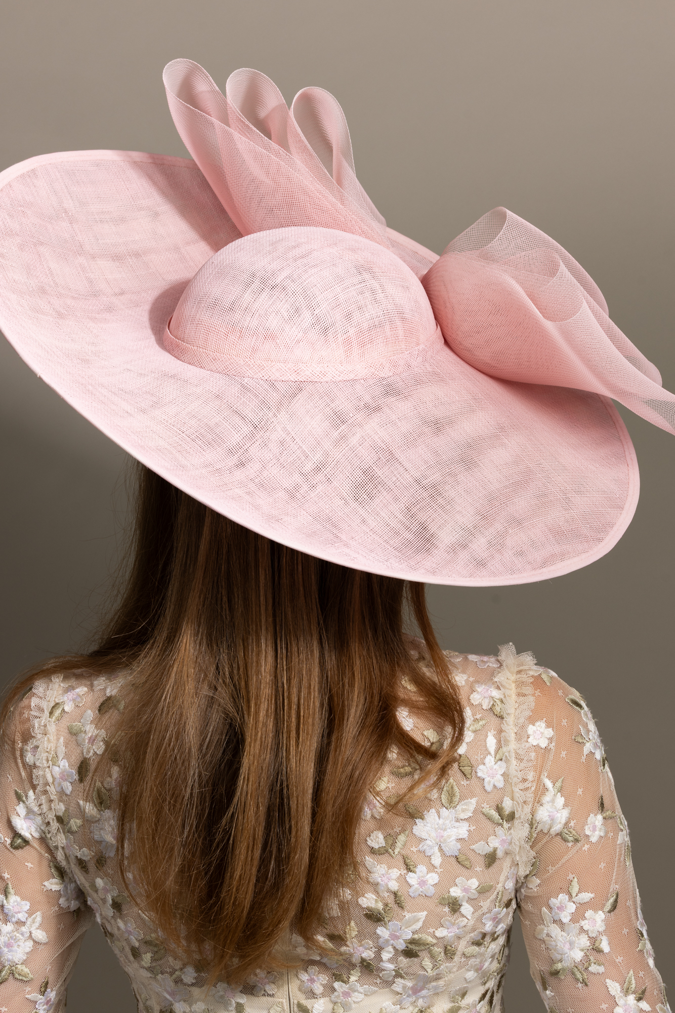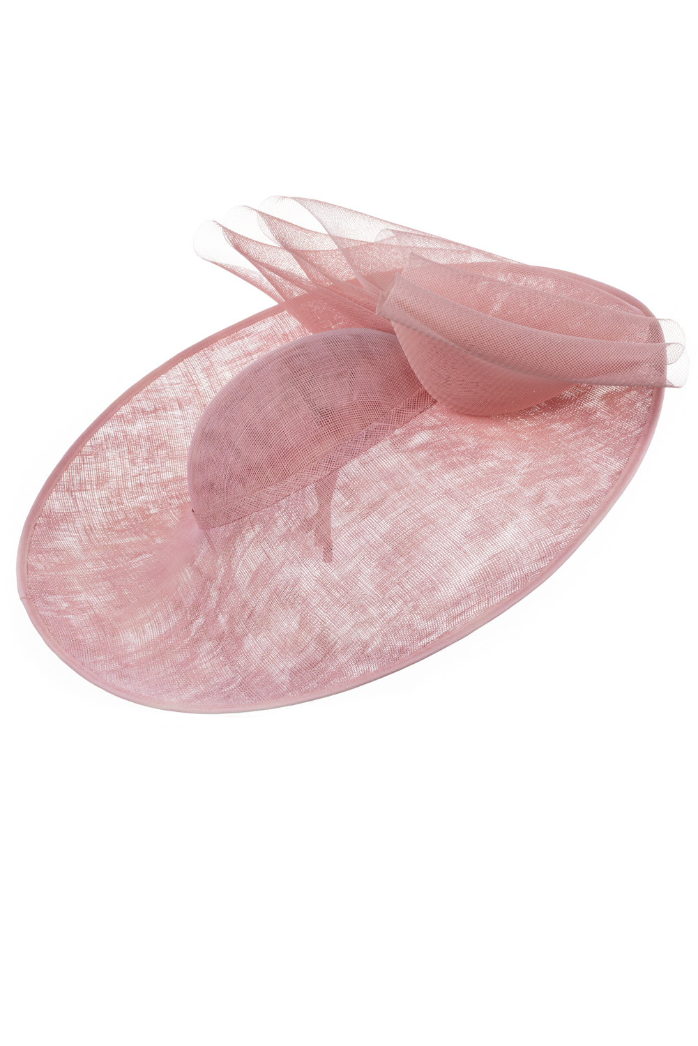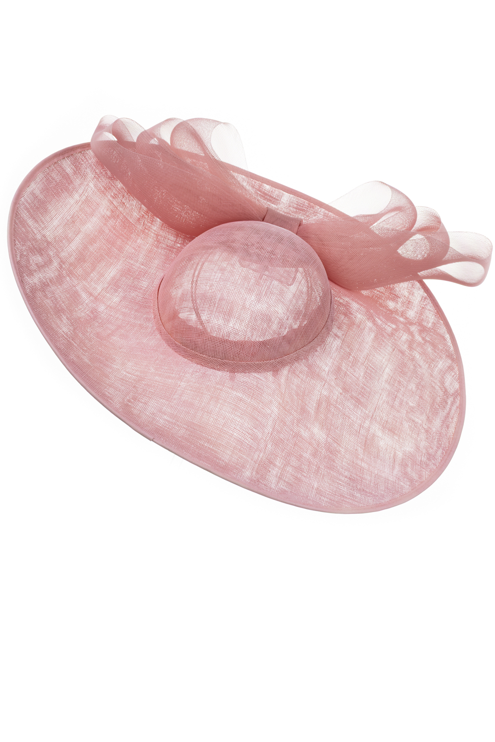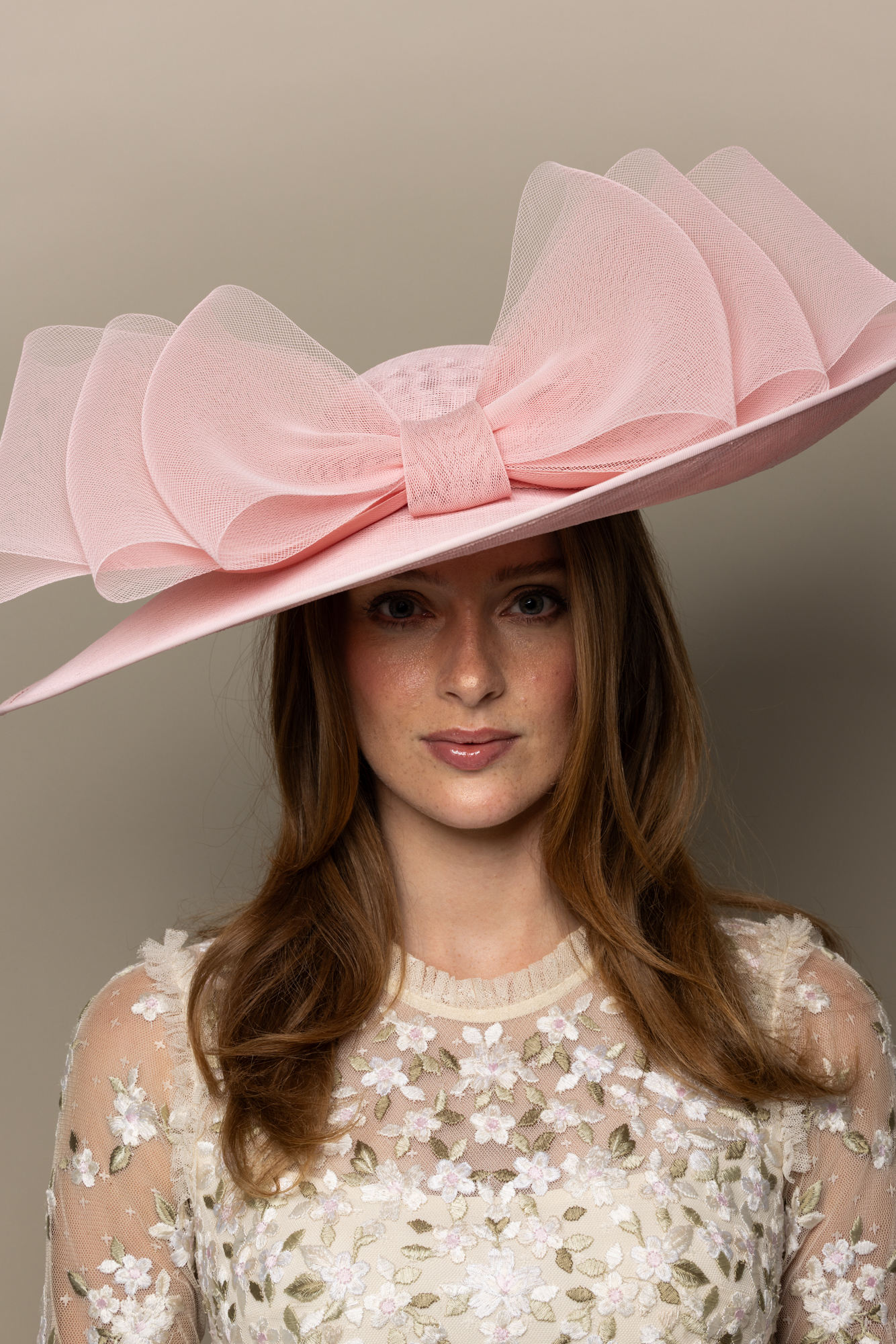 The Merlin Hat comprises a large base with upturn to one side of the brim trimmed to the front with a large signature Hostie bow made from crinoline with three bow loops.