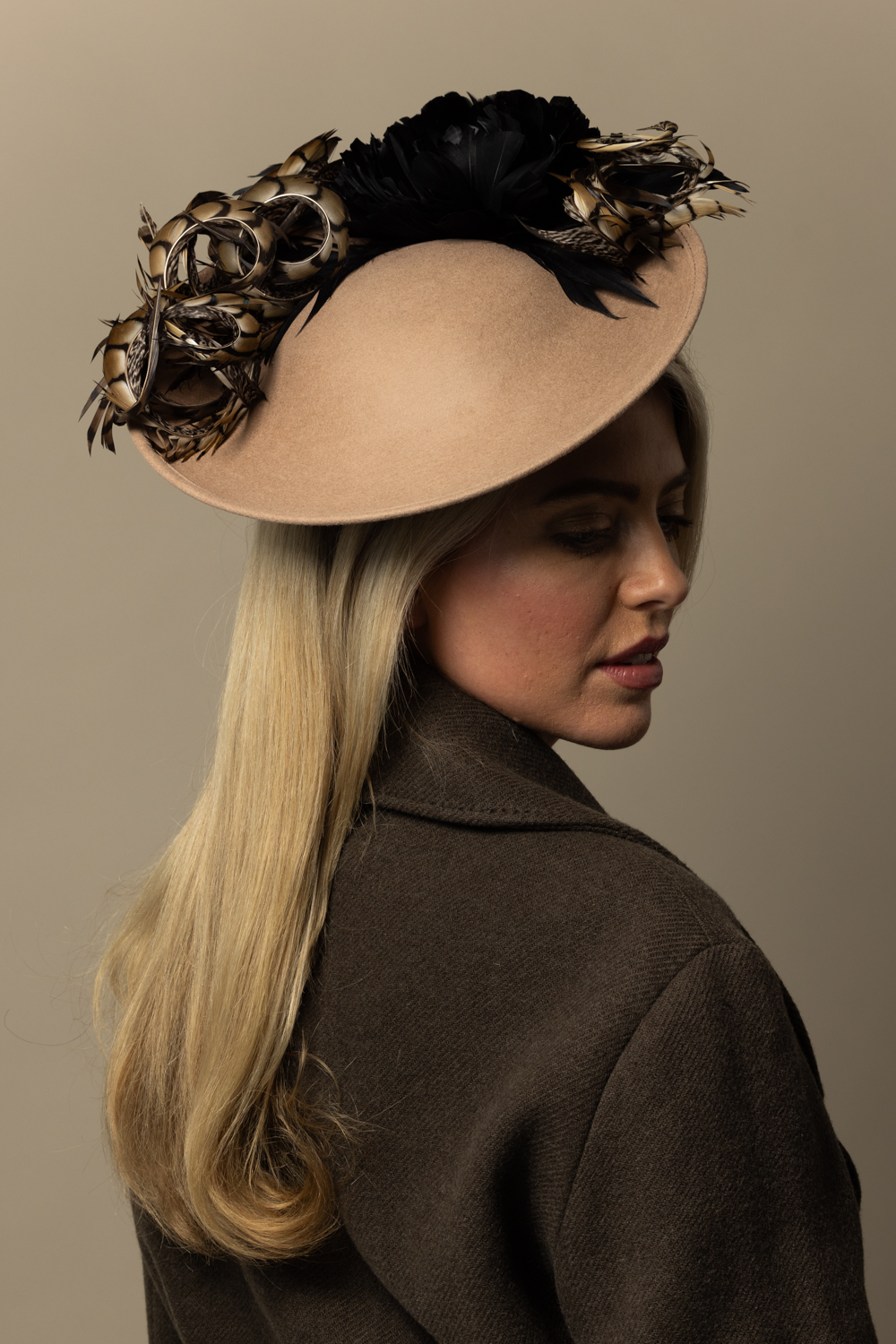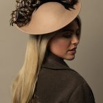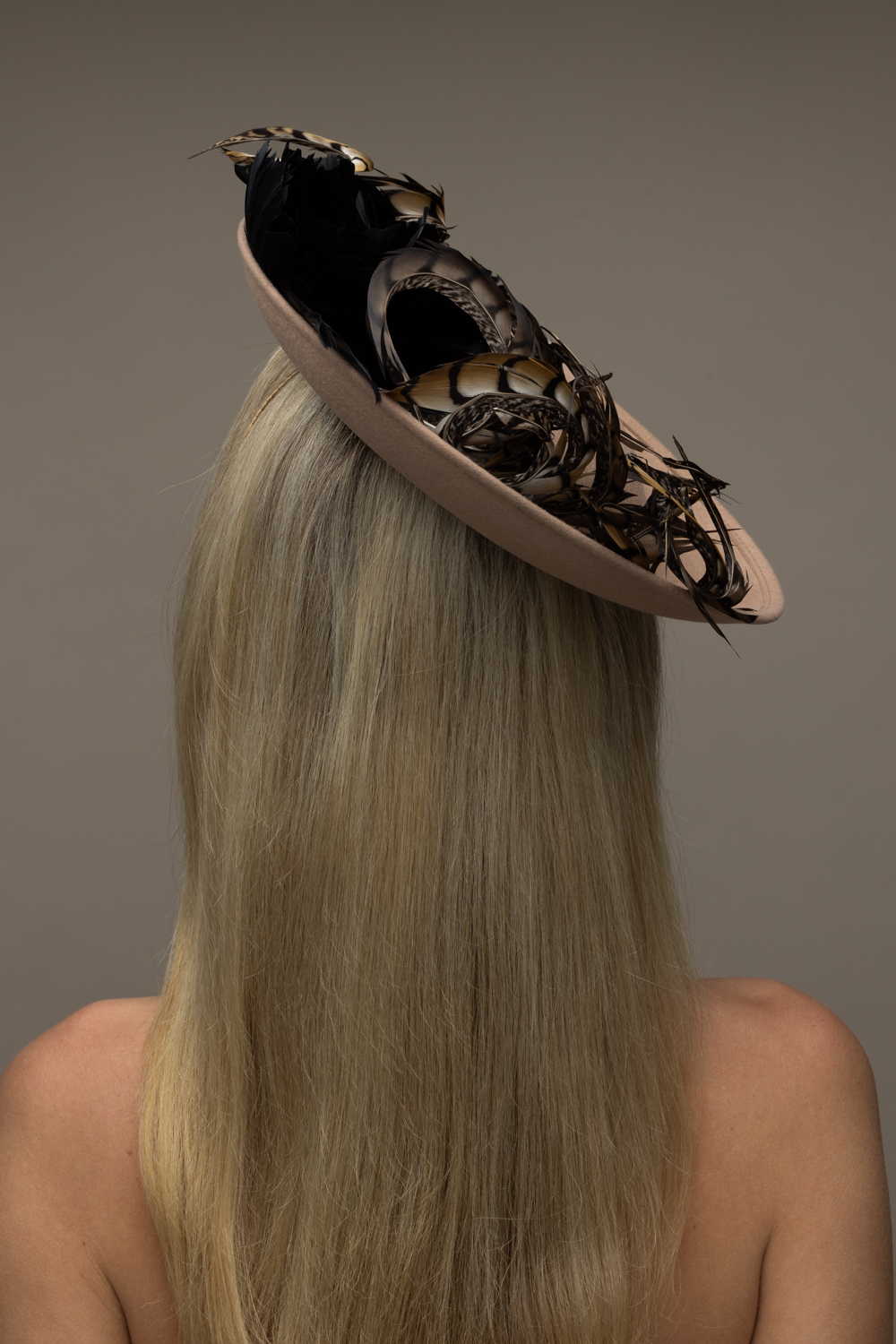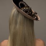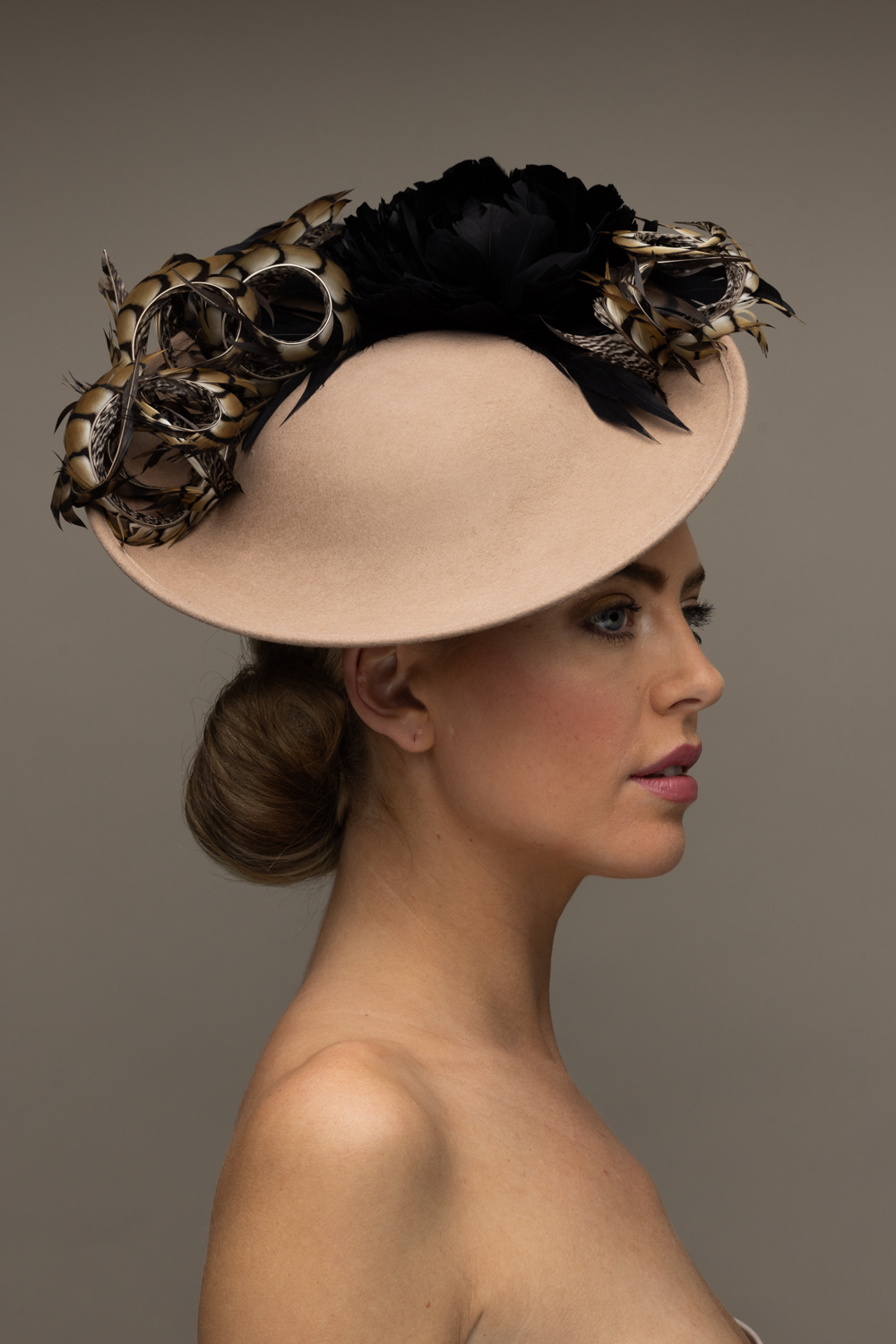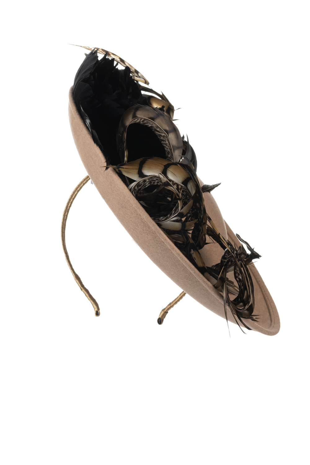 The Michigan Dish hat comprises a 12″ dish base trimmed around the domed crown with feather flowers and natural, curled pheasant feathers.