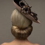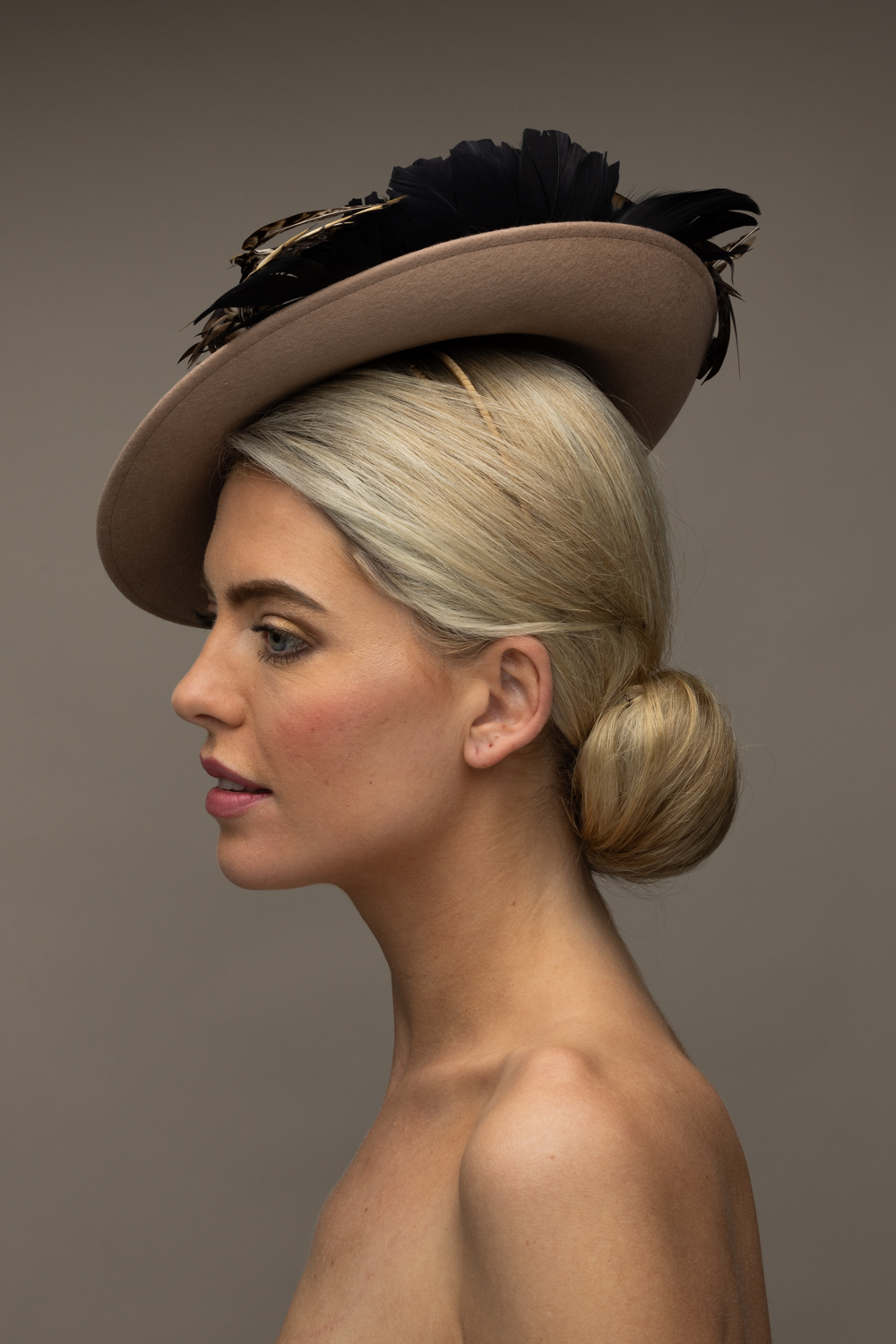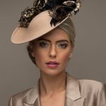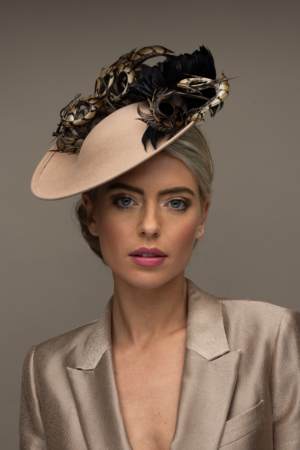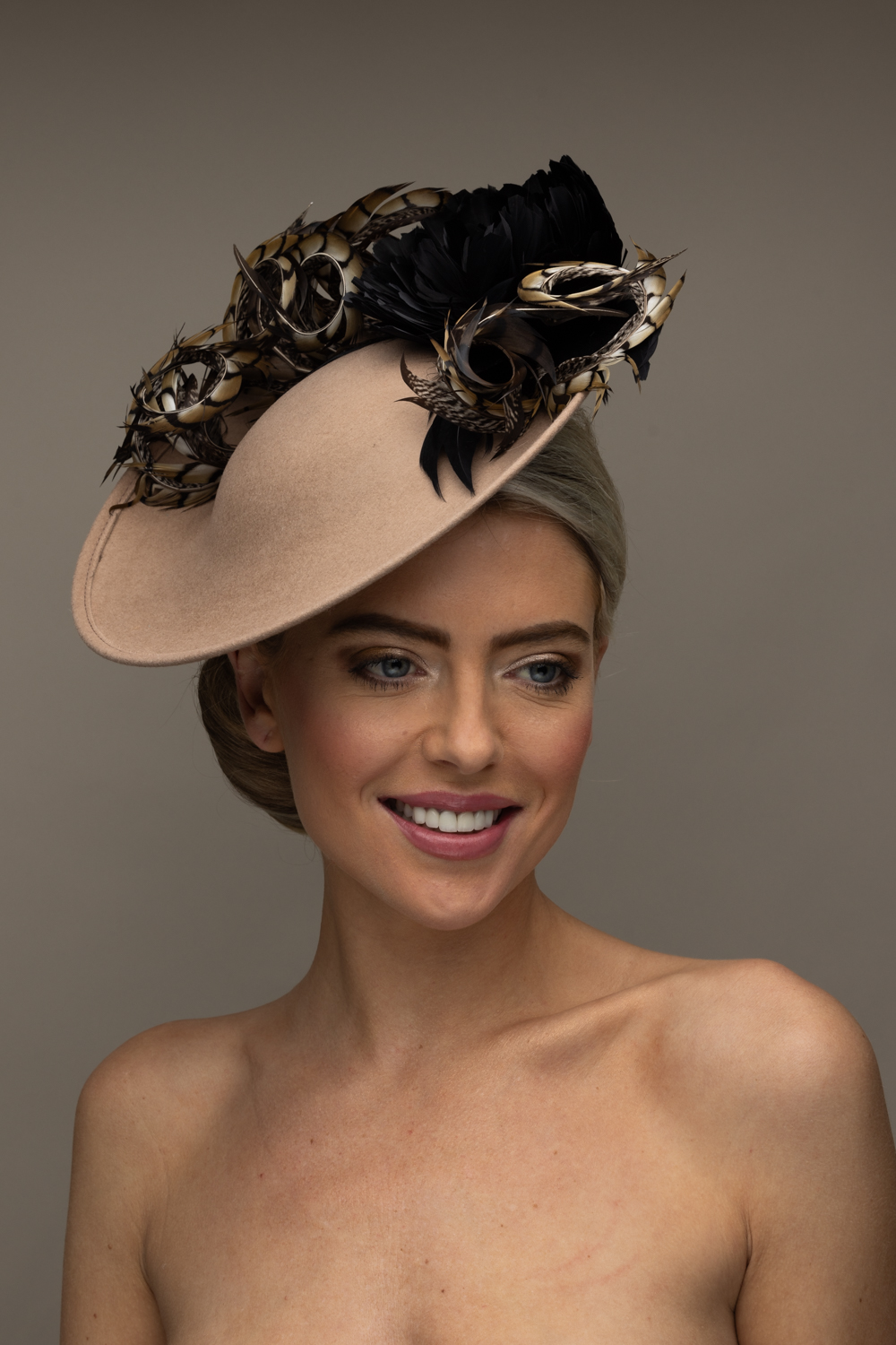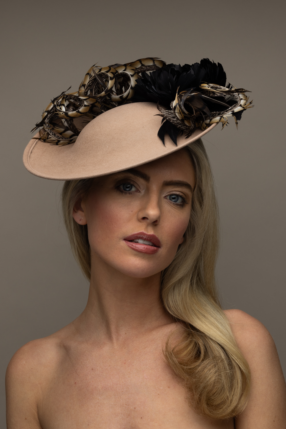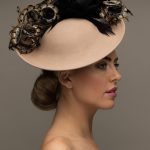 The Michigan Dish hat comprises a 12″ dish base trimmed around the domed crown with feather flowers and natural, curled pheasant feathers.