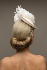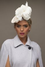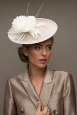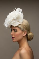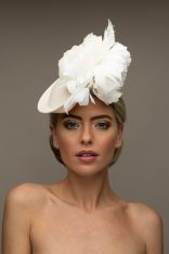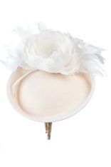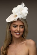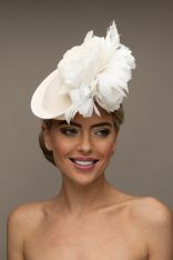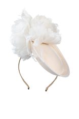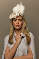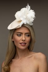 The Mississippi Cocktail hat comprises a concave small felt dish base trimmed both above and below with feather flowers, offset with plain feathers. This hat comes on a comfortable ribbon wrapped double headband which we will match to your hair colour.