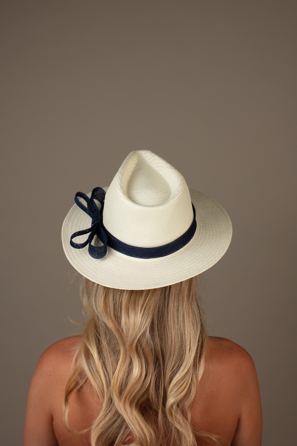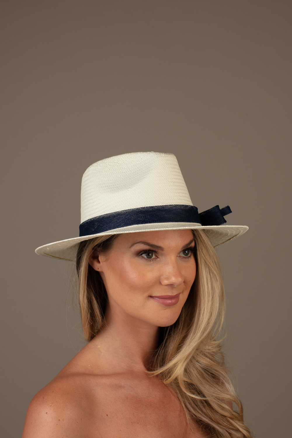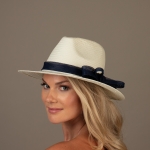 The Nancy Summer Trilby is a great stylish summer hat. The hat base is ivory and is trimmed with a sinamay band and pretty double bow, tied to one side. The hat comes in one size but is fully adjustable to ensure you get a great fit.