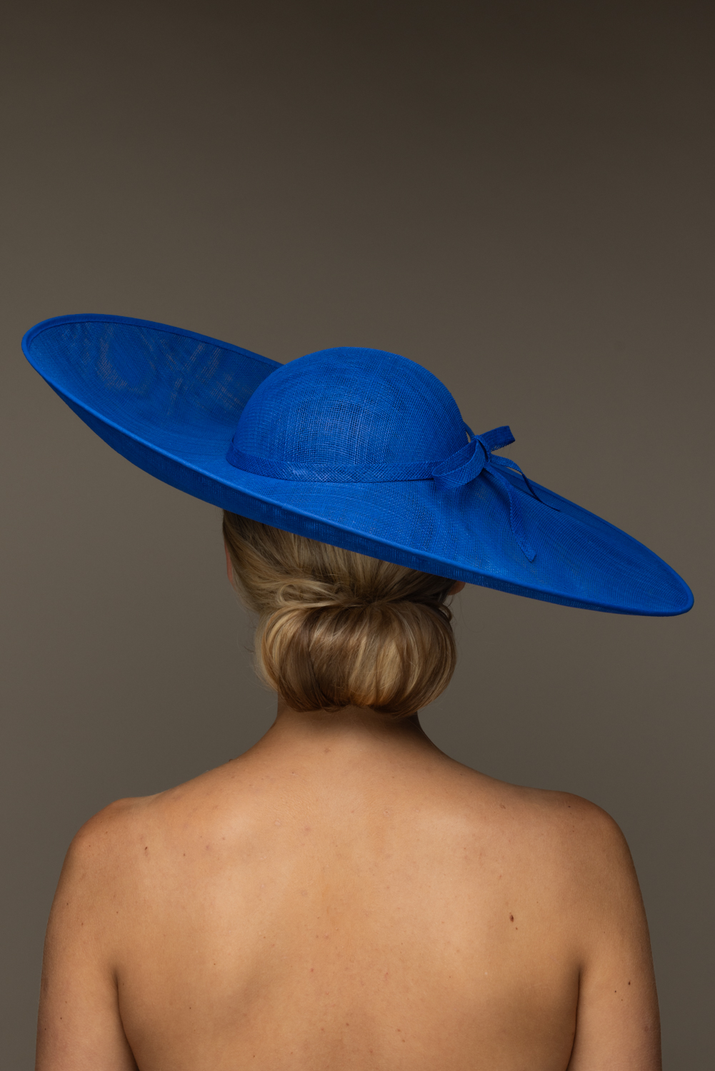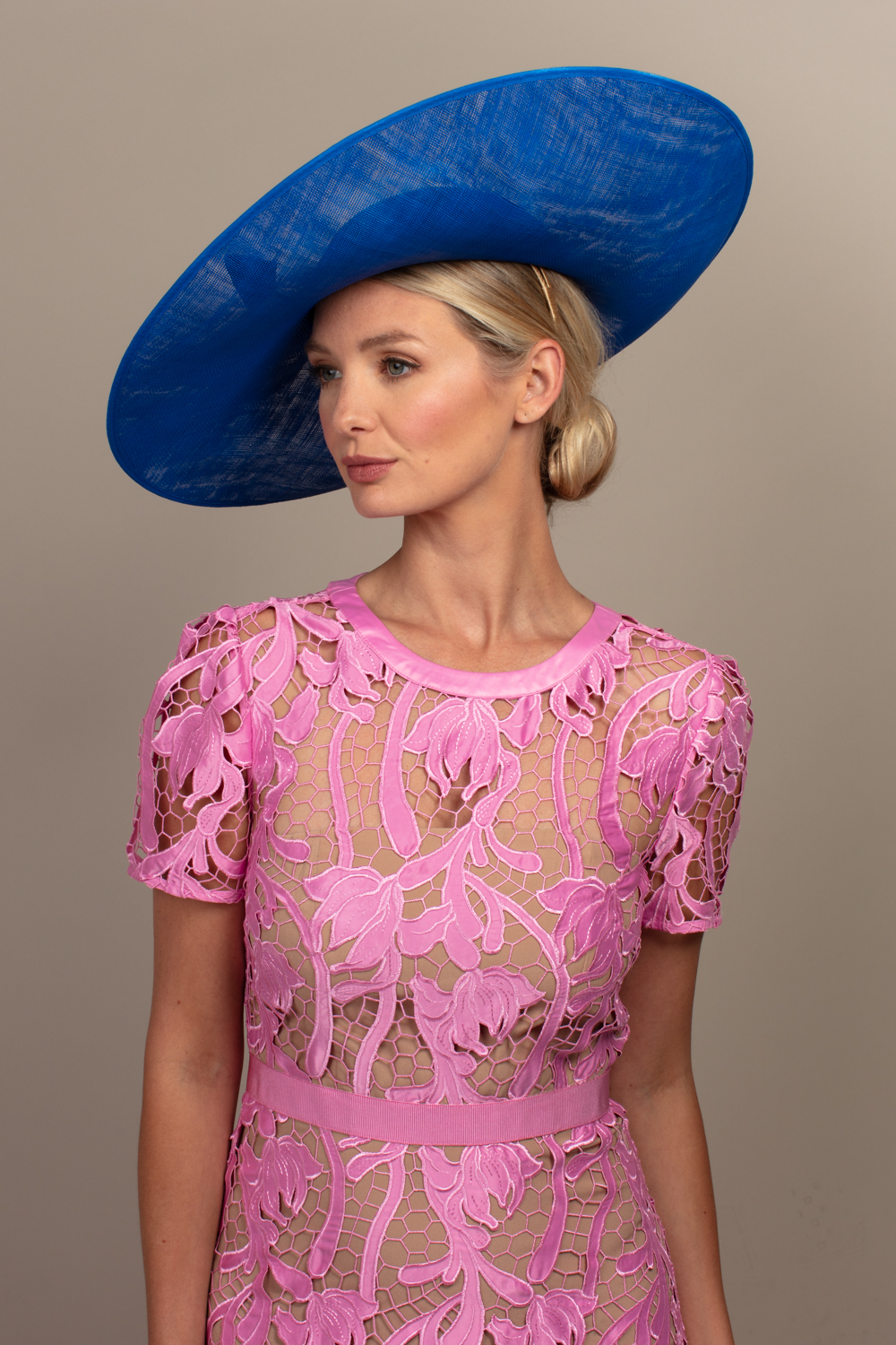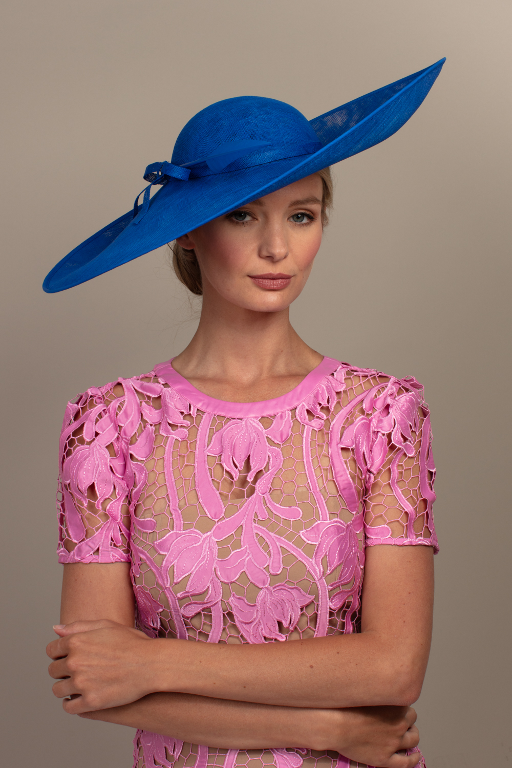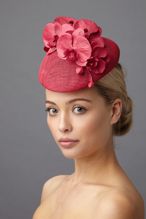 This hat comes on a comfortable, ribbon wrapped double headband which we will match to your hair colour.