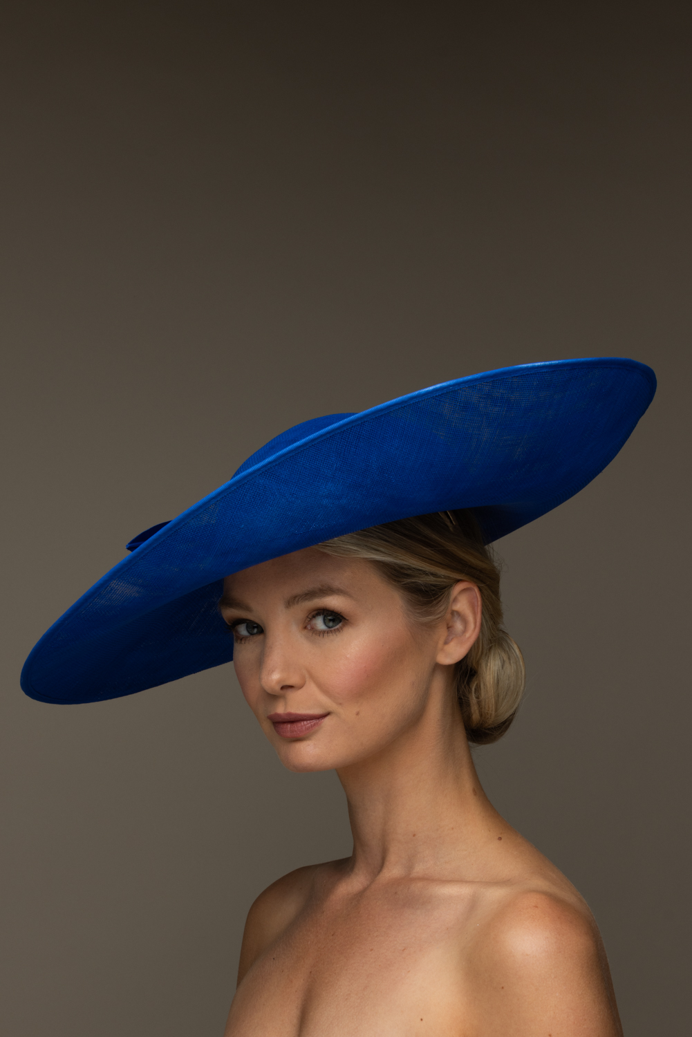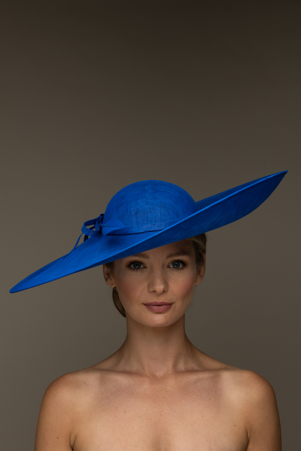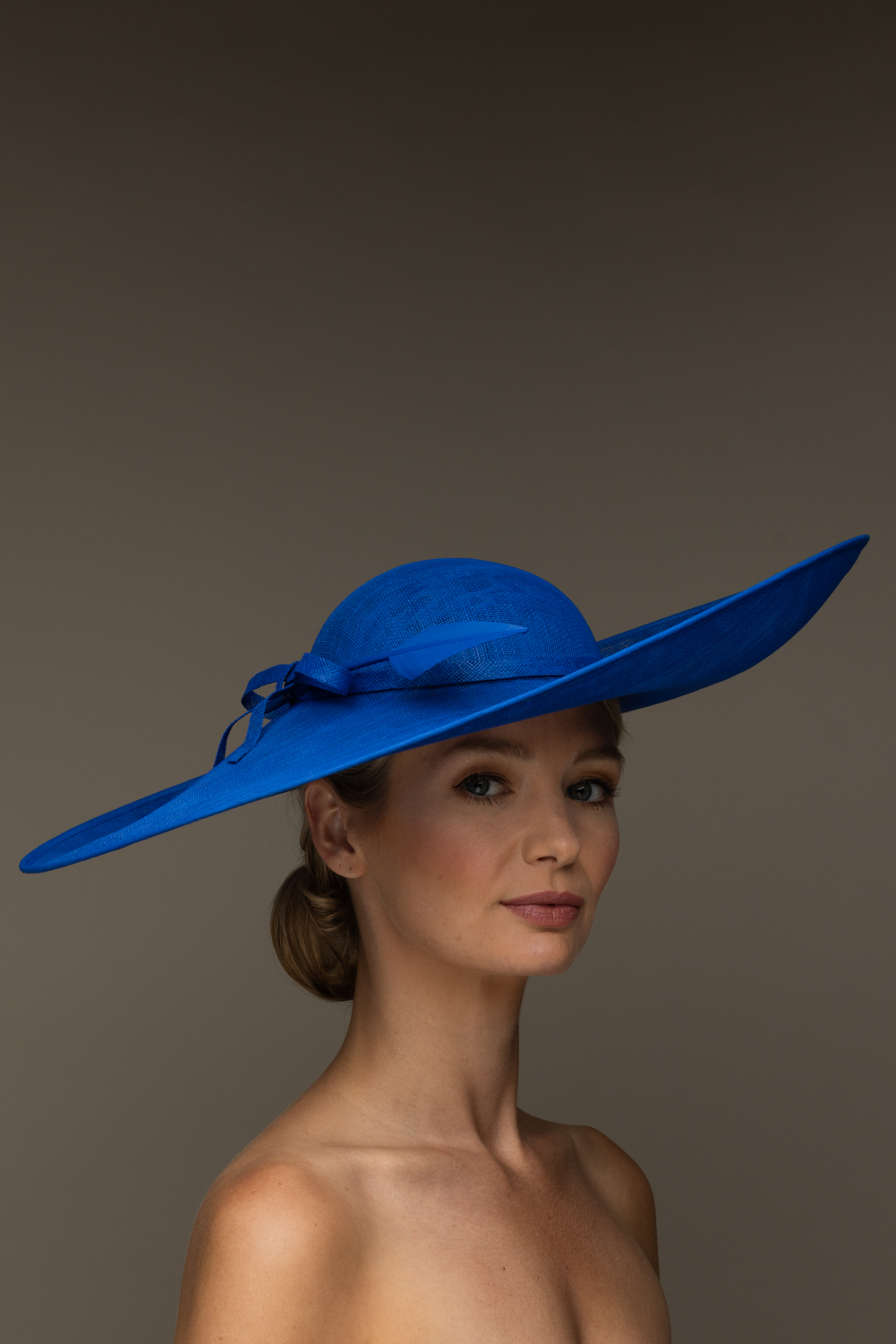 This hat comes on a comfortable, ribbon wrapped double headband which we will match to your hair colour.