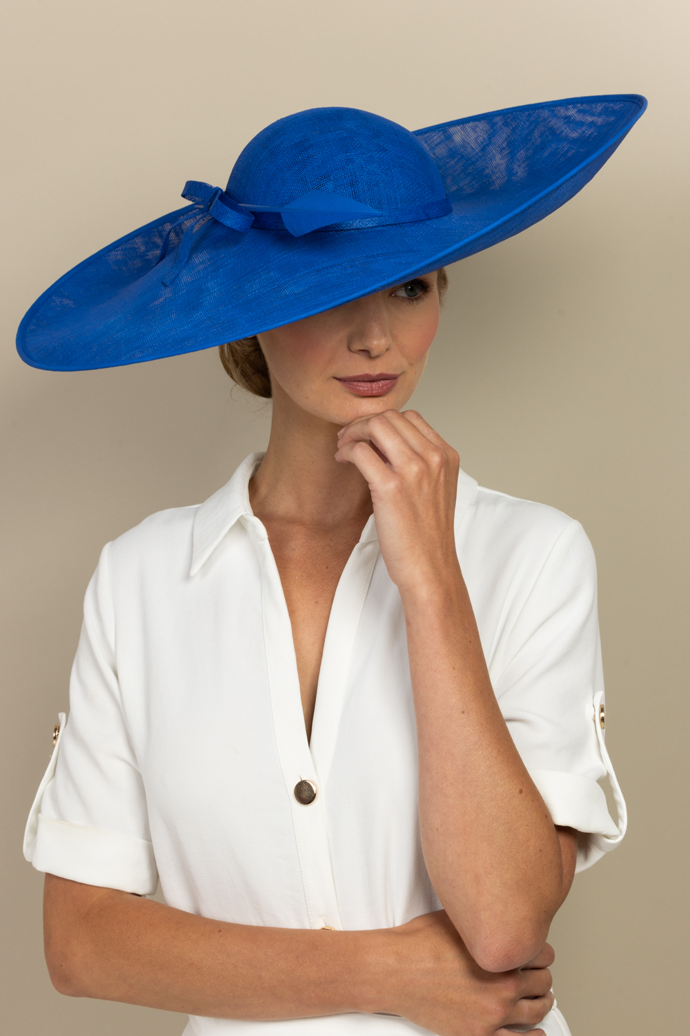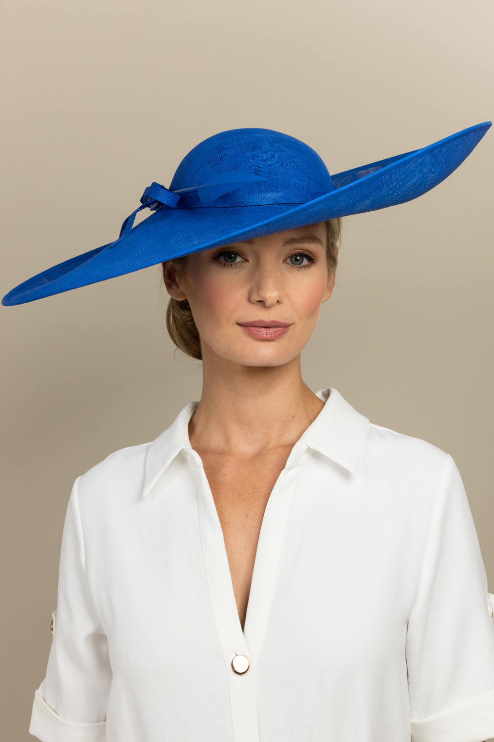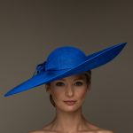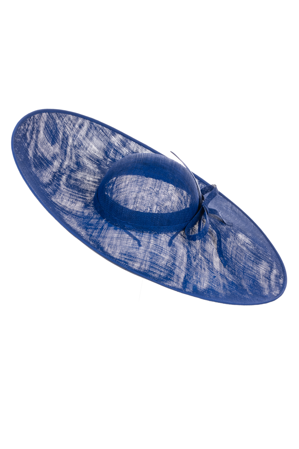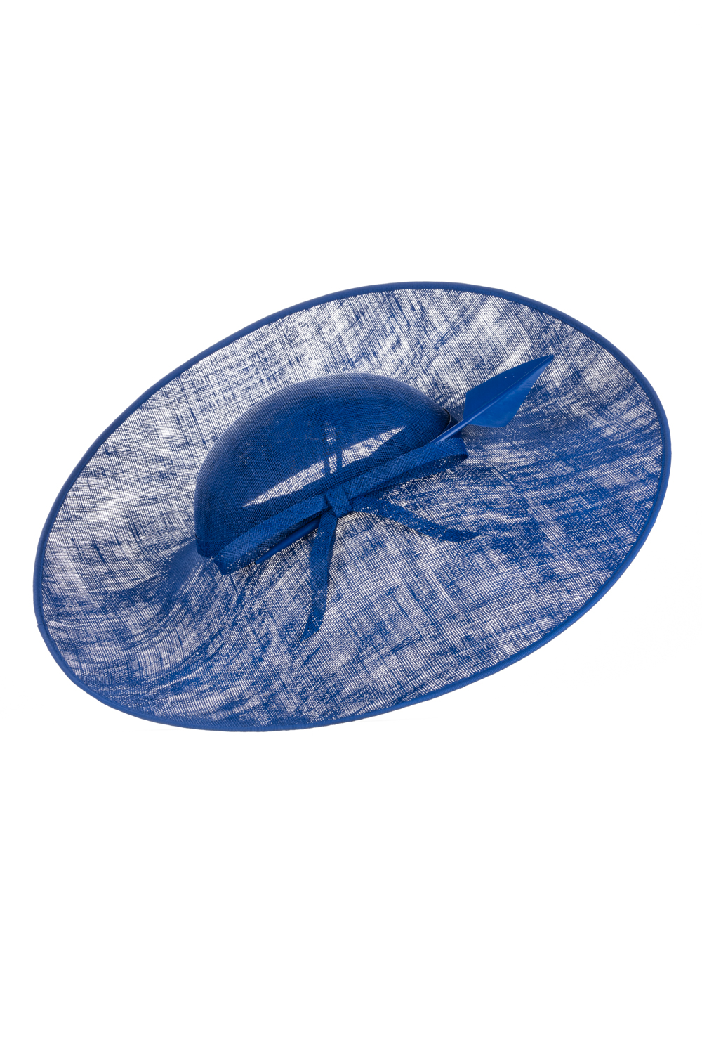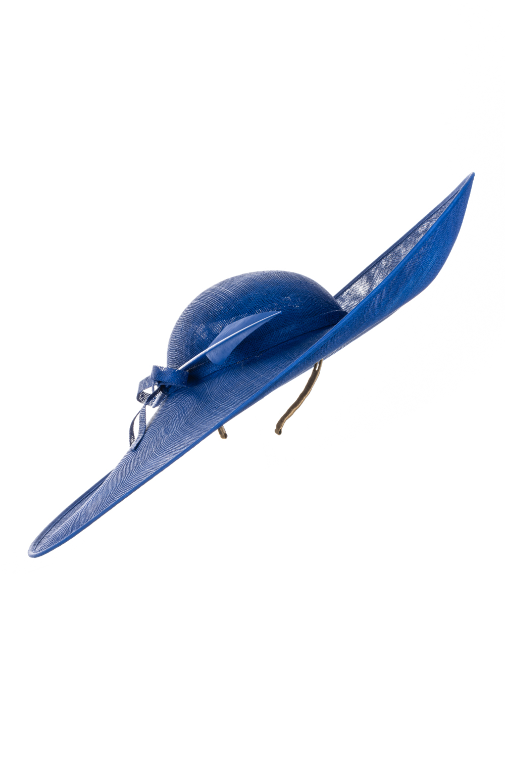 The Nixon Hat comprises a wide sinamay base with upturn to the front and side on a headband. The hat is trimmed with a band, a sinamay bow and is finished off with an elegant feather.