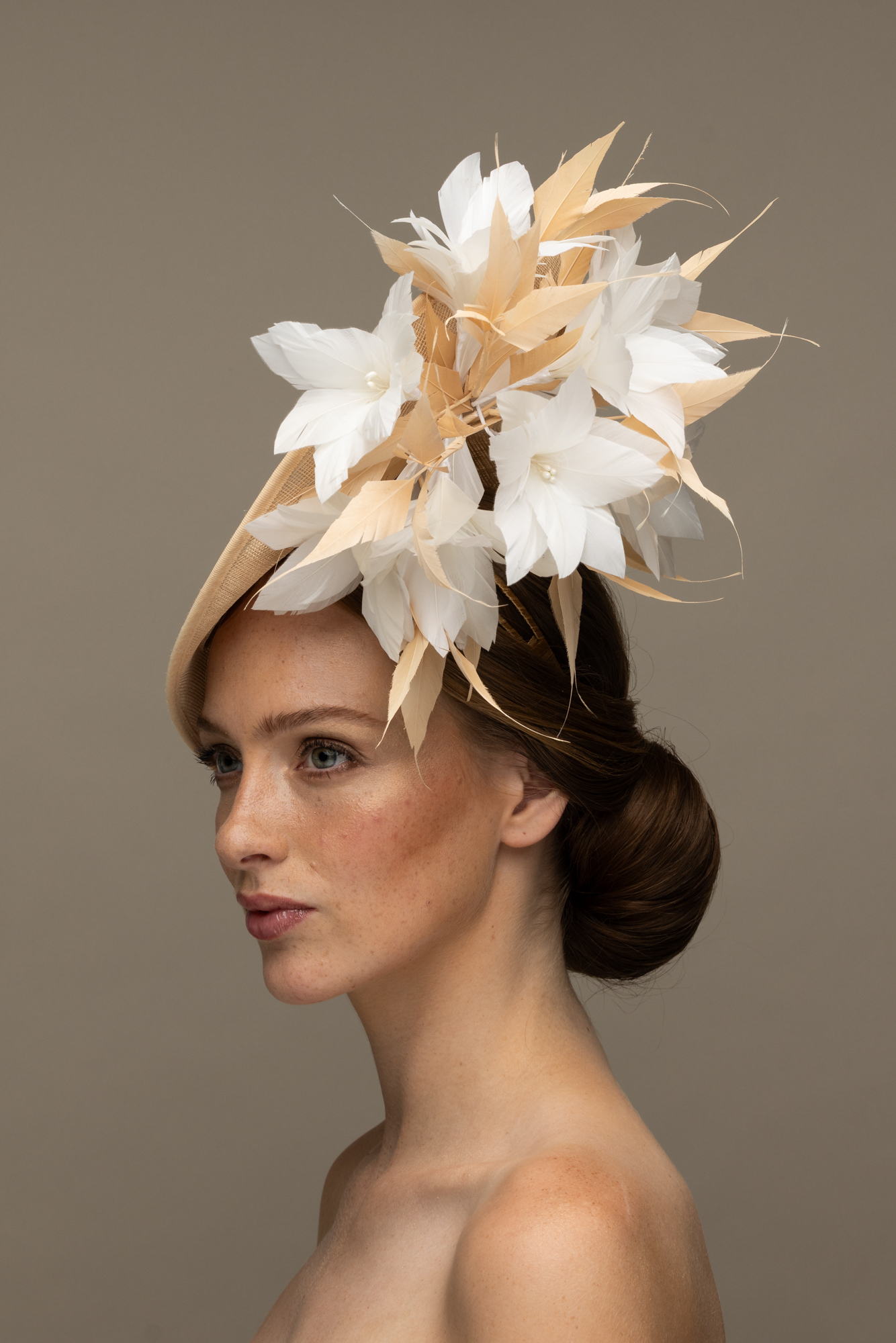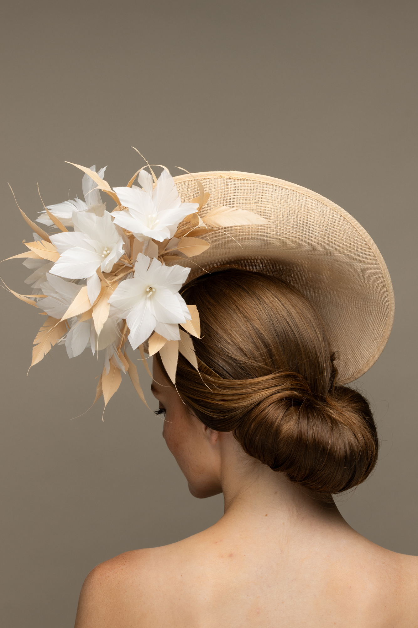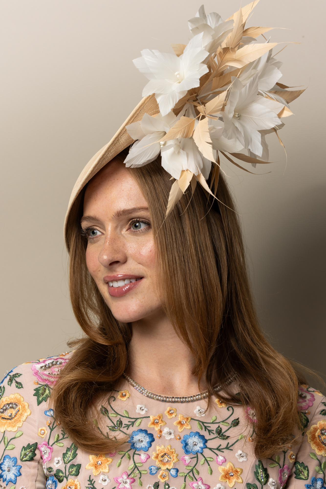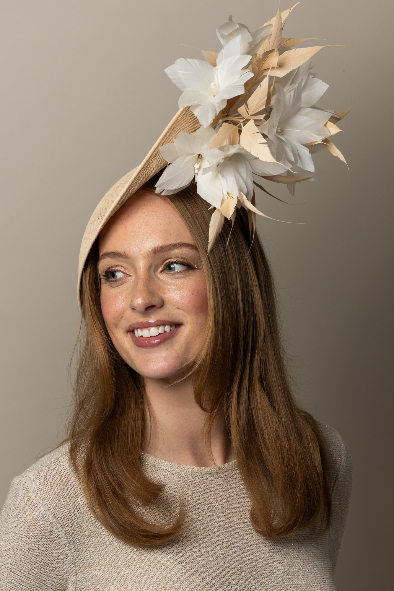 This hat comes on a comfortable, ribbon wrapped double headband which we will match to your hair colour.