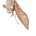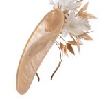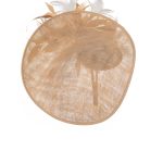 The Osprey Dish Hat comprises a teardrop shaped moulded dish base made from sinamay which is generously trimmed to the underside of the brim with feather flowers and spiked feathers. The feather flowers are available in ivory, navy and black.