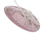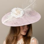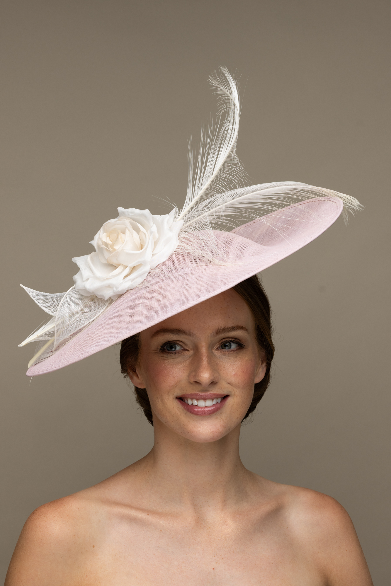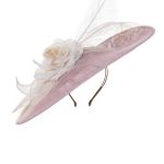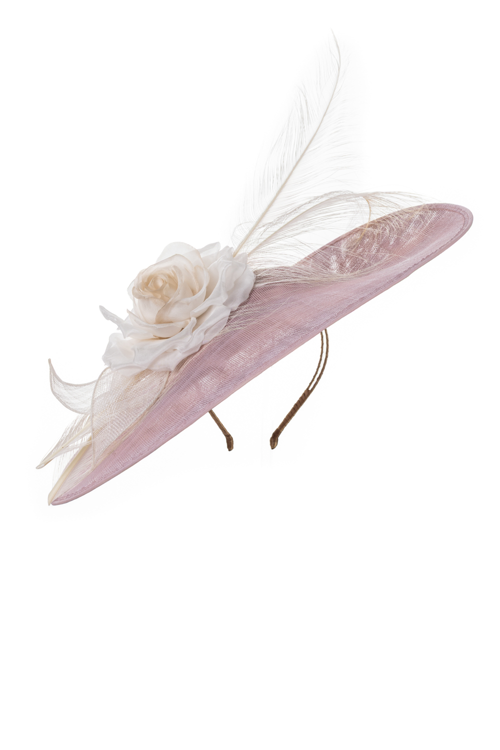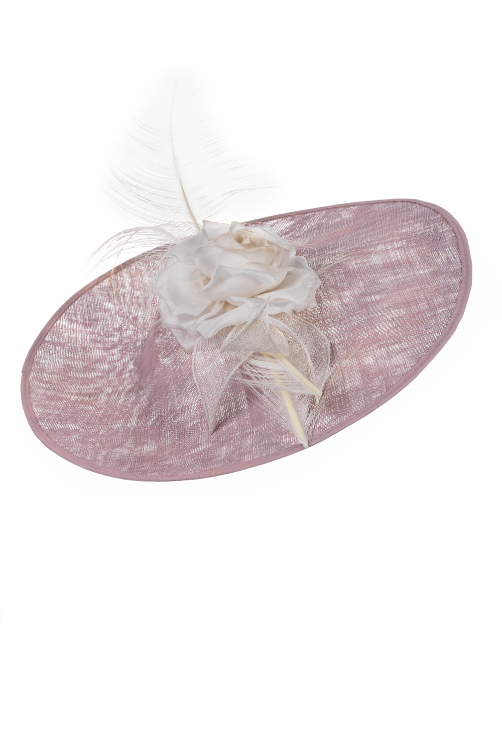 The Parakeet Dish Hat comprises a large 18″ dish base trimmed with a beautiful silk flower, framed with sinamay leaves and finished off with two elegant feathered quills.