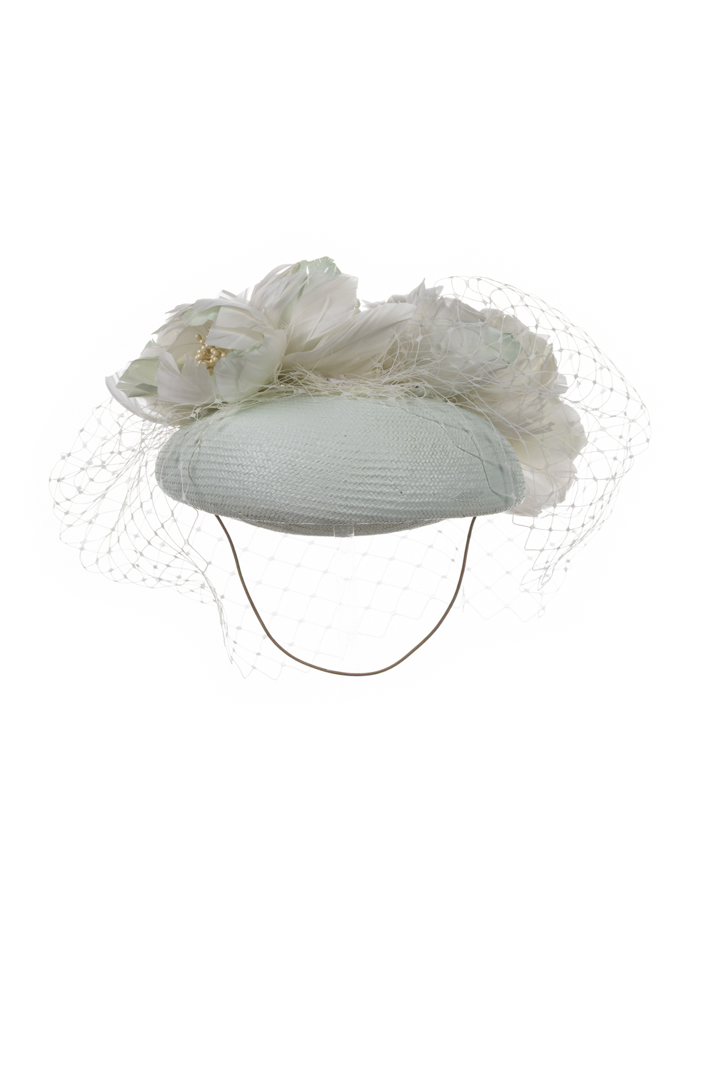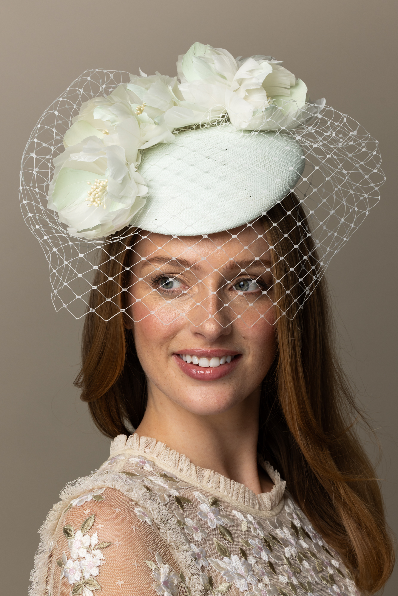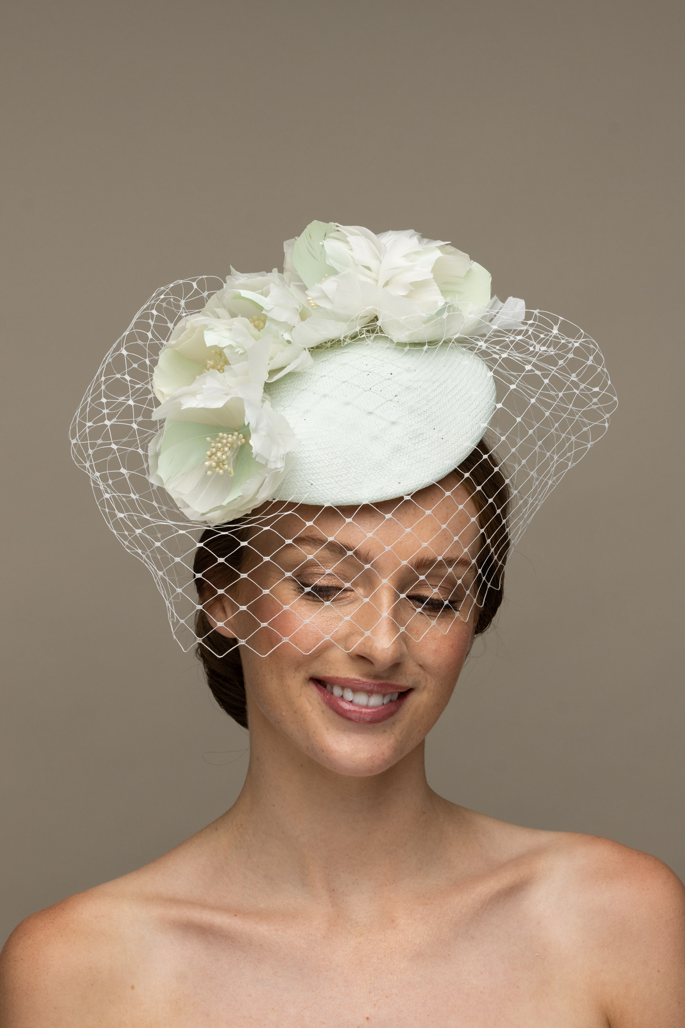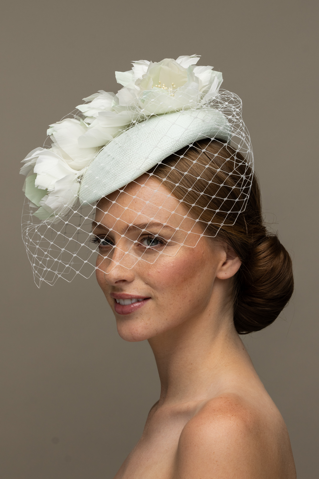 The Parrot Pillox hat comprises a neat, straw pillbox base trimmed with small feather flowers and a veil.