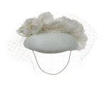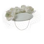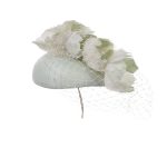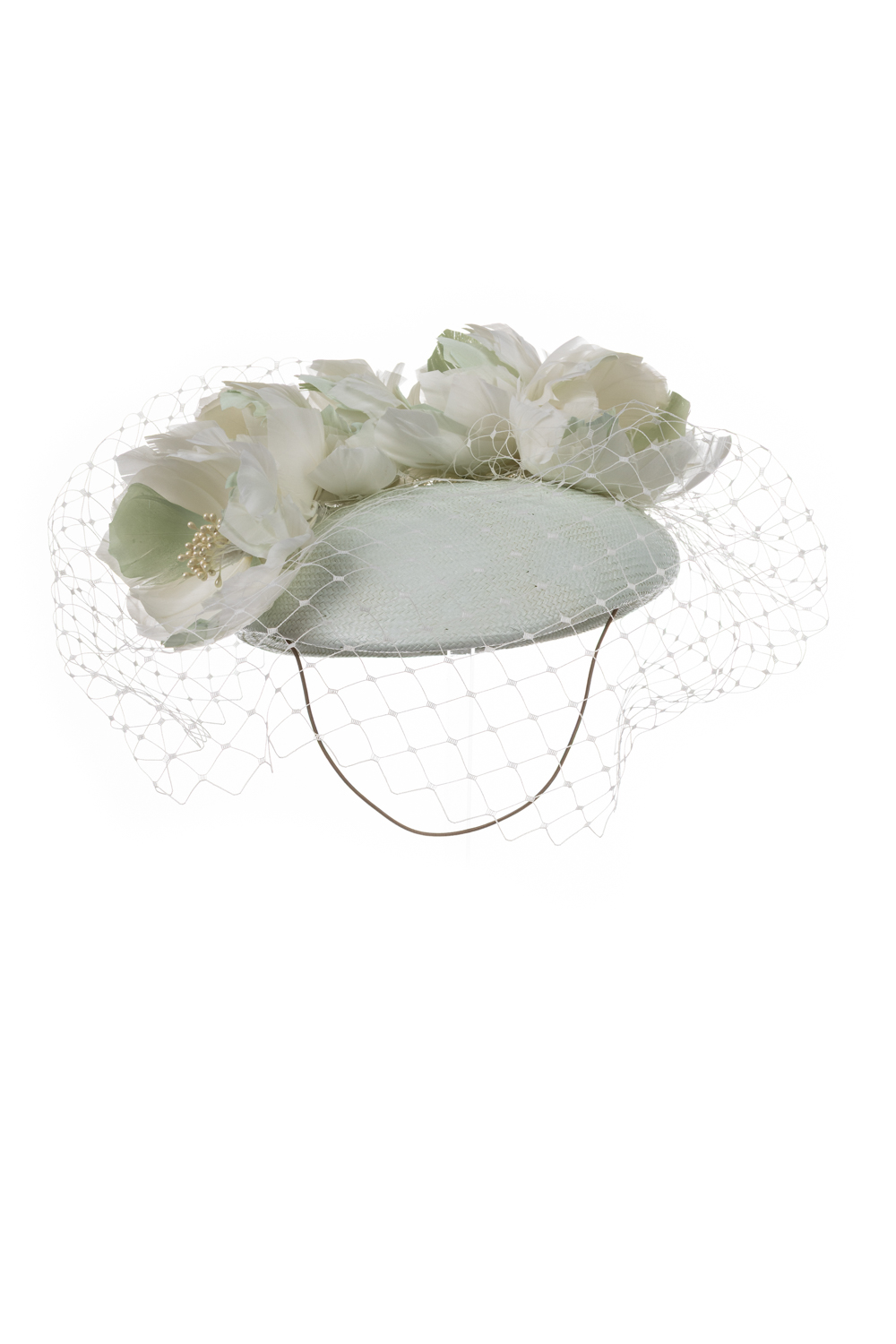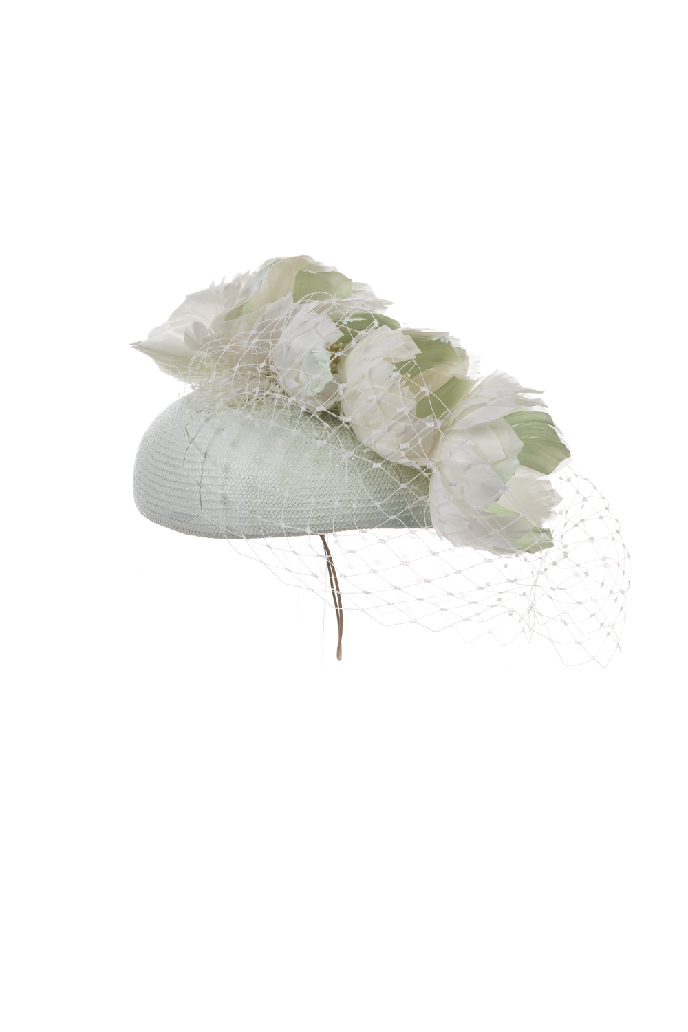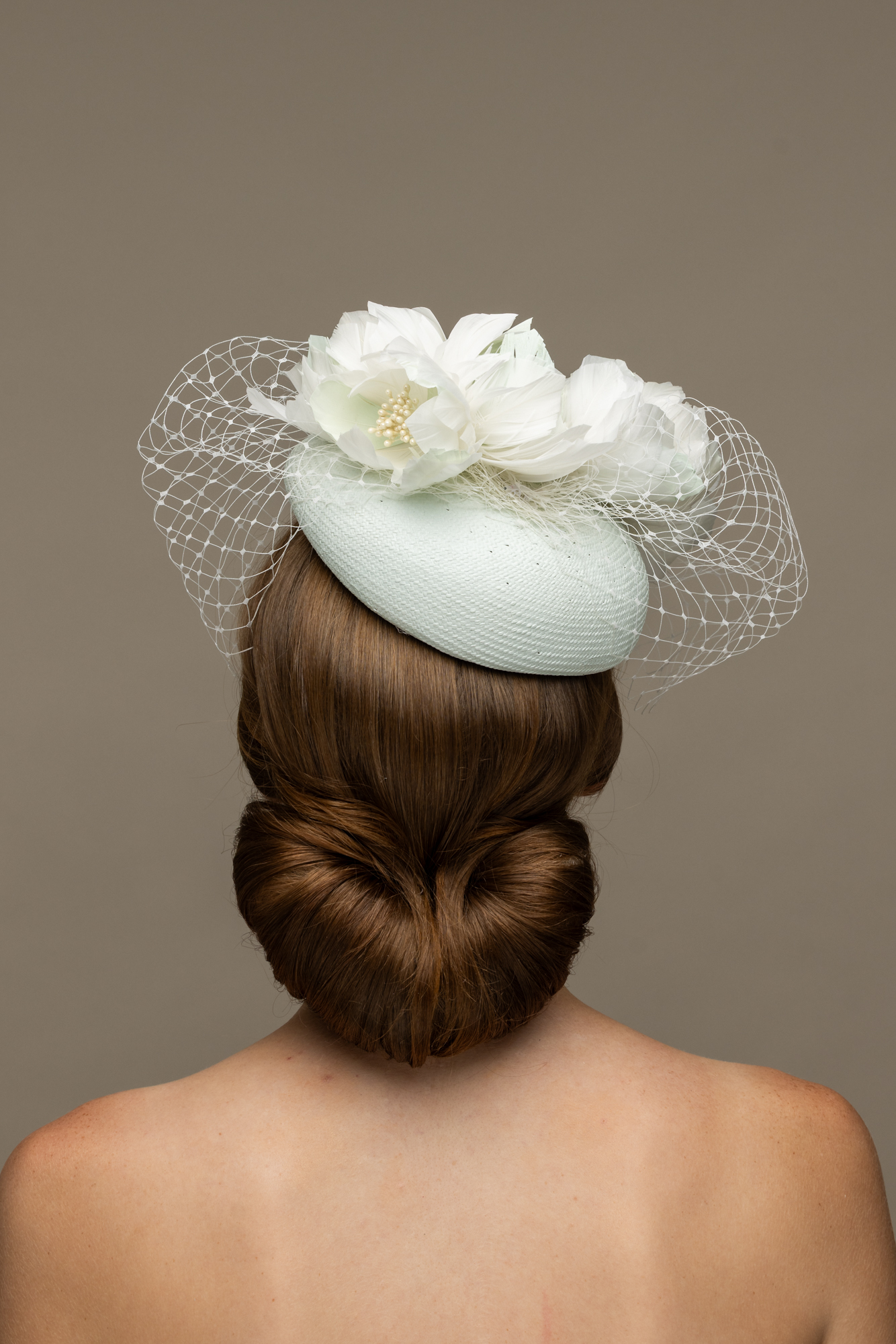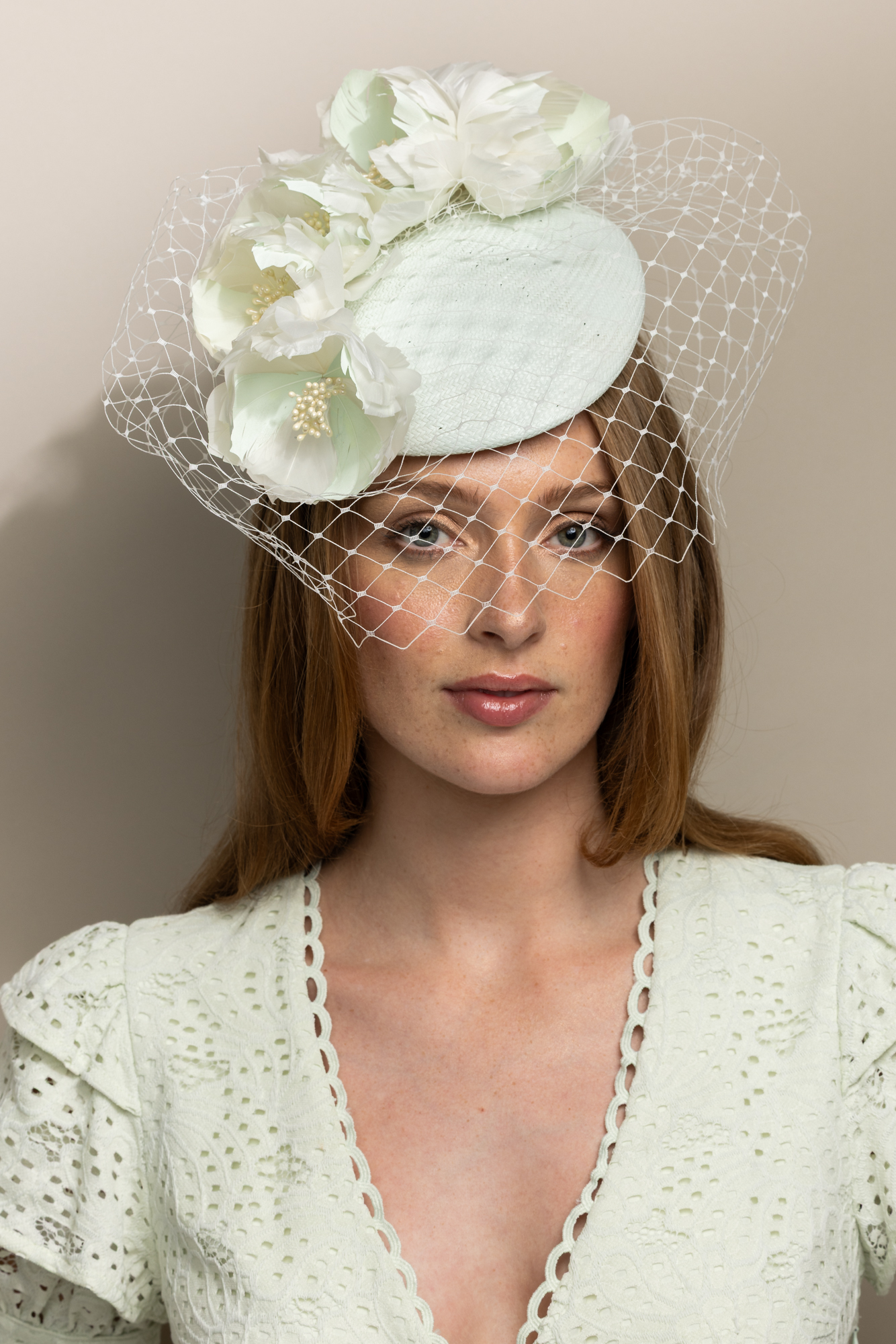 The Parrot Pillox hat comprises a neat, straw pillbox base trimmed with small feather flowers and a veil.