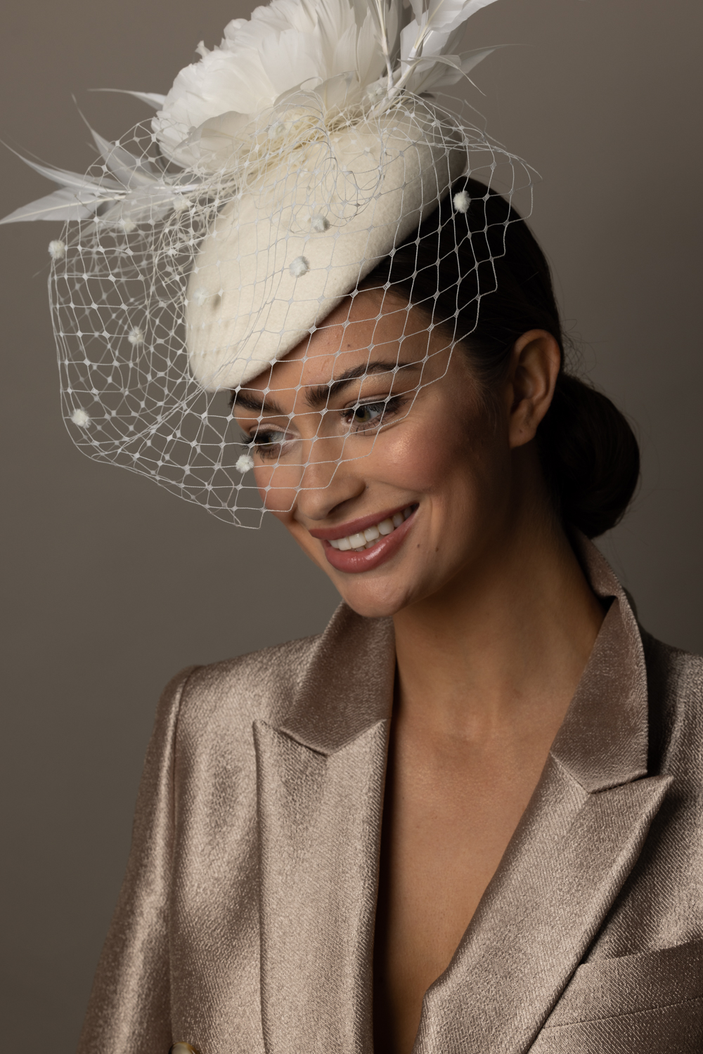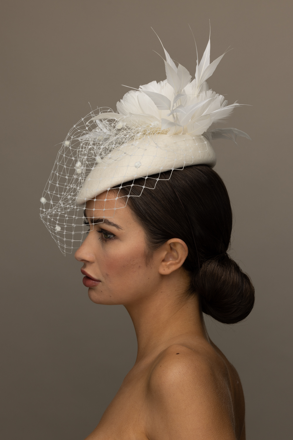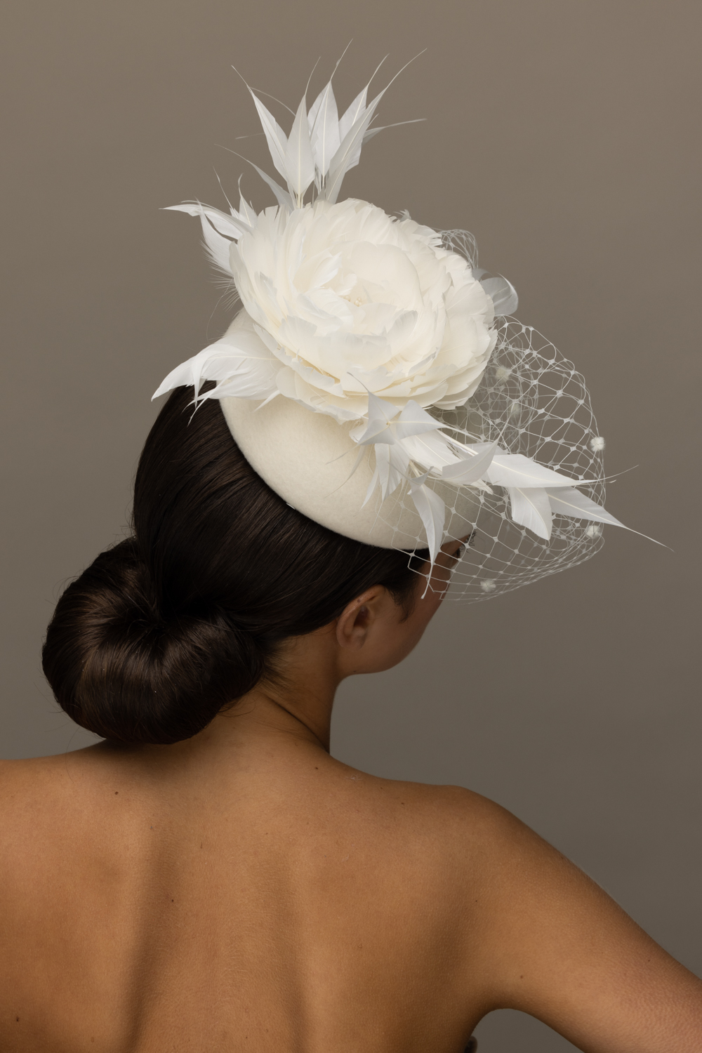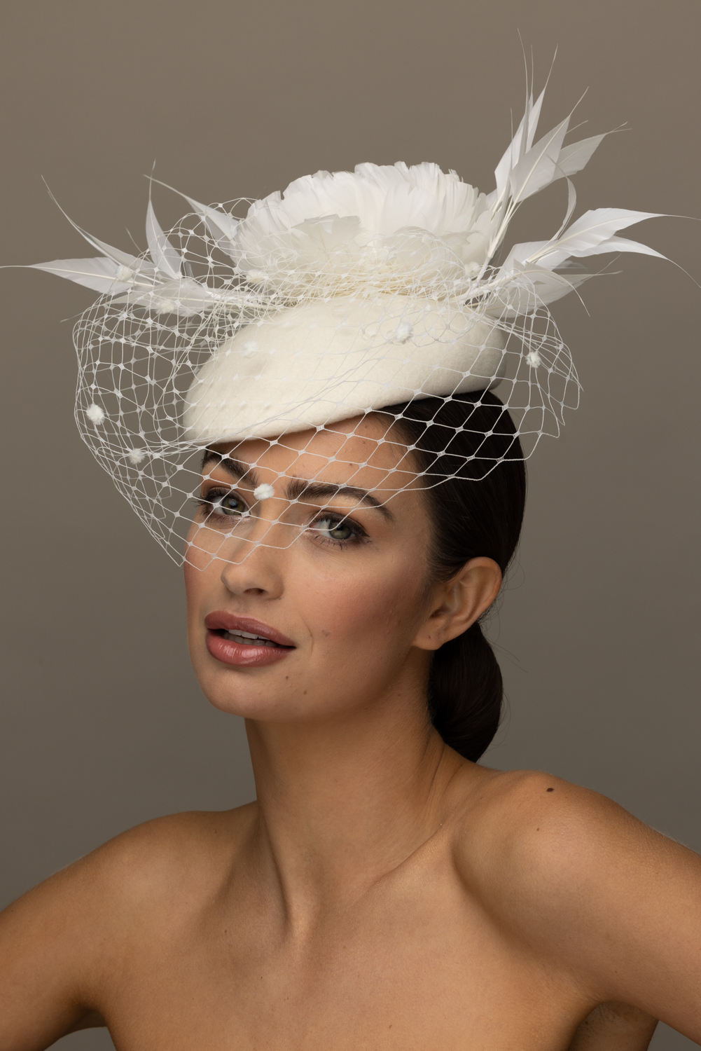 As with all of our hats, you can have your Pine hat in any colour way you wish. Choose your felt base colour here and your feather and veil colours from this  extensive colour chart. The feather flower is available in either ivory or black. We are happy to send out colour swatches so you can be sure that your chosen colours perfectly match your outfit. To order colour samples click here.
