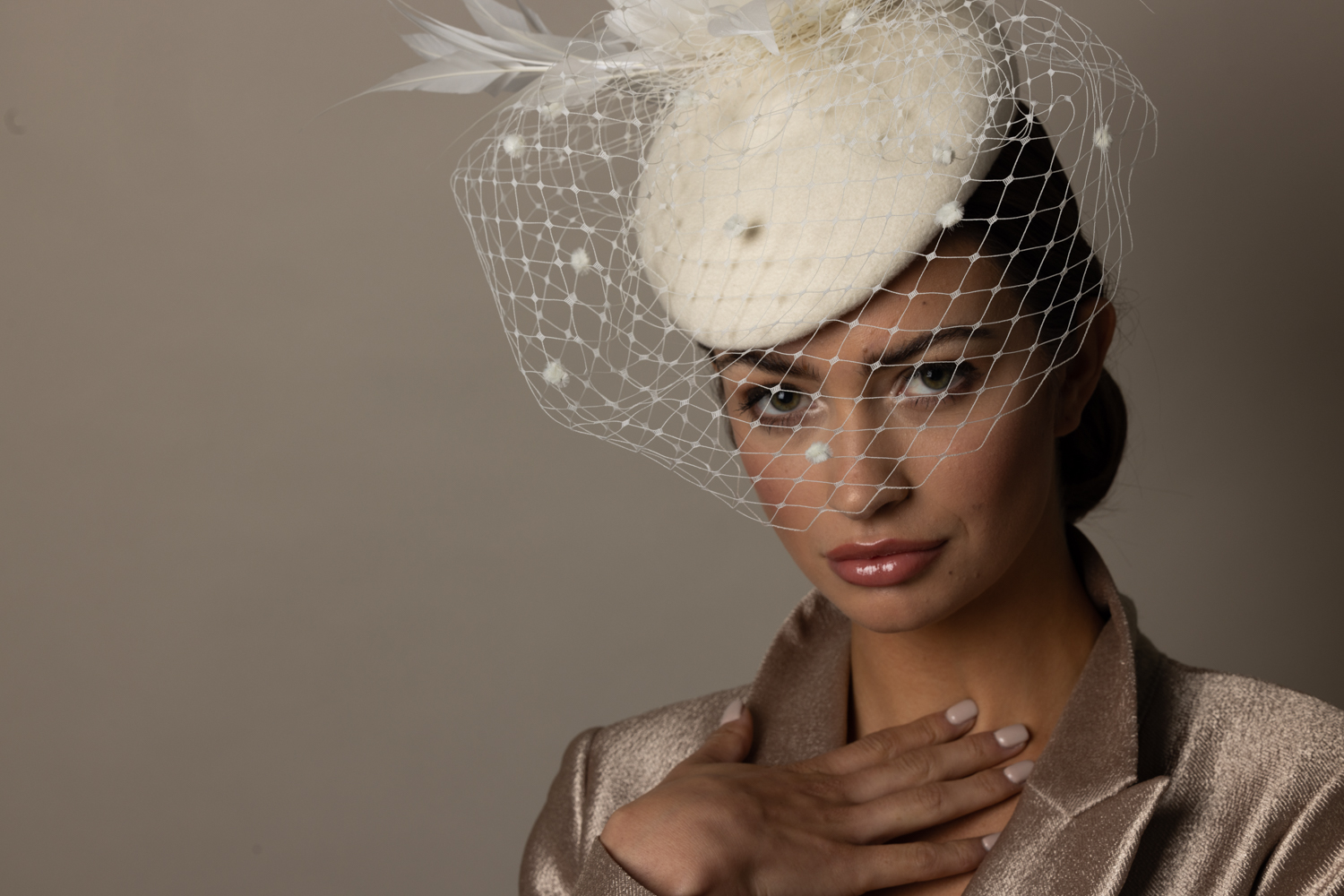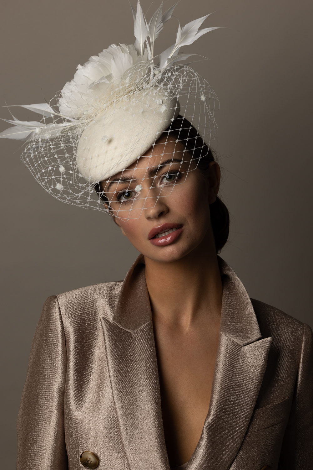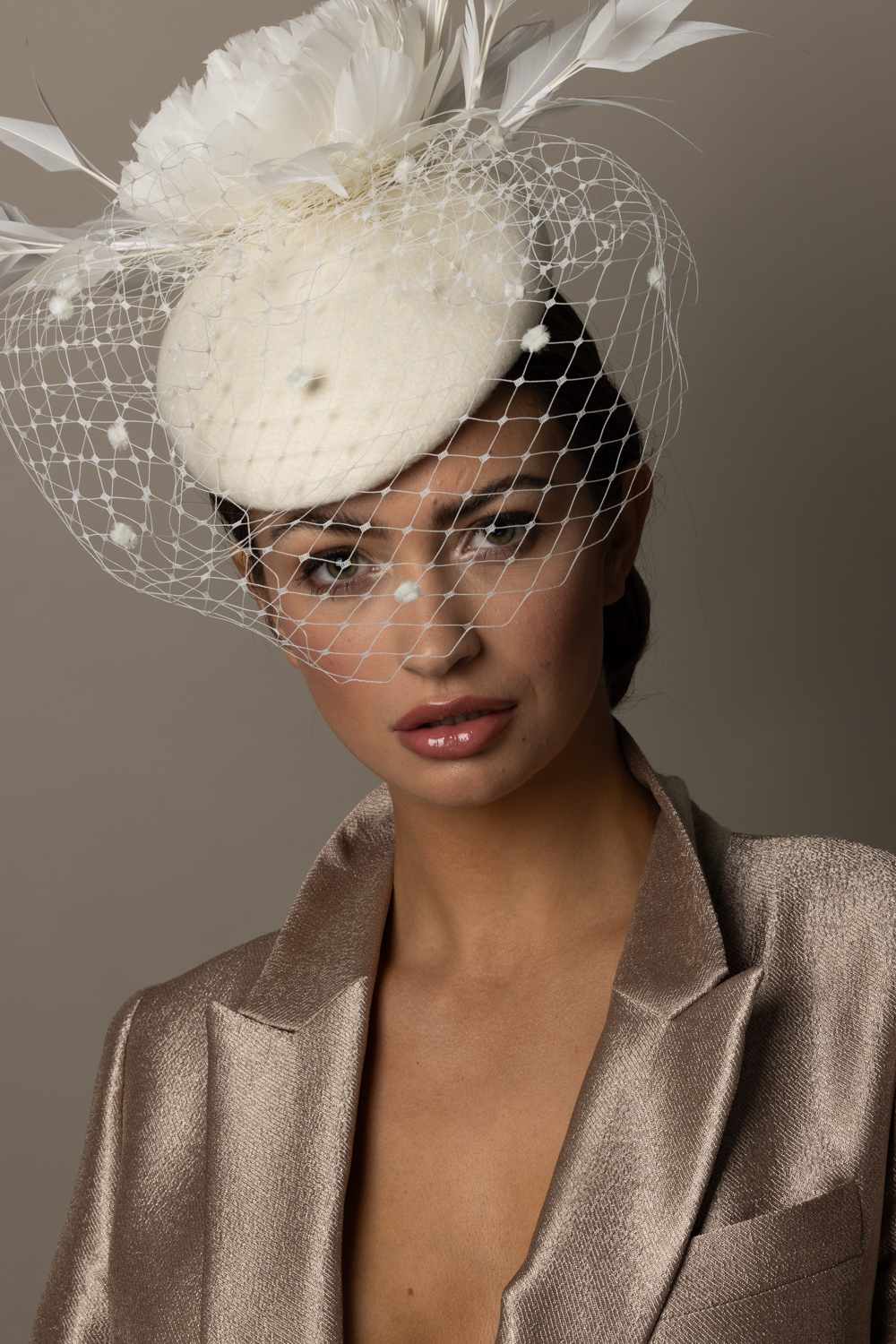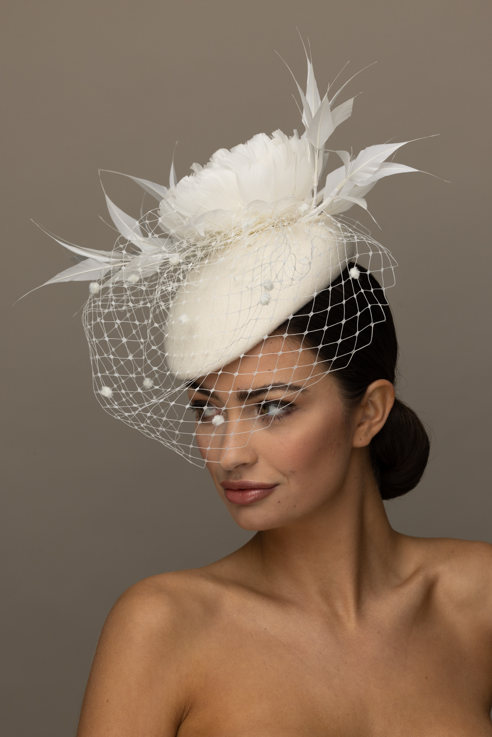 The Pine Pillbox Hat comprises a pillbox felt base trimmed with a soft feather flower framed with spiked feathers. The hat is then finished with a dramatic spotted veil.