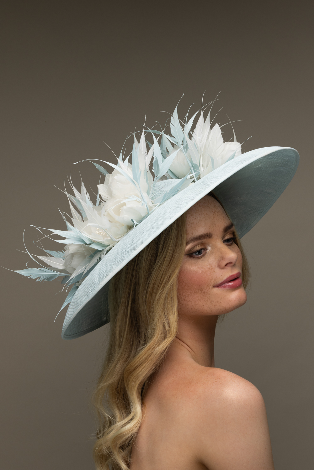 The Platinum hat comprises a large sinamay dish base with shallow crown with narrow band, trimmed to the either side of the crown with feather flowers, spiked feathers.