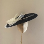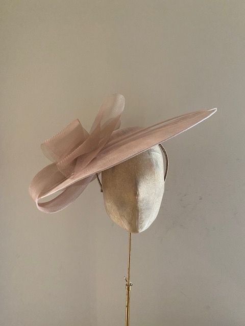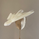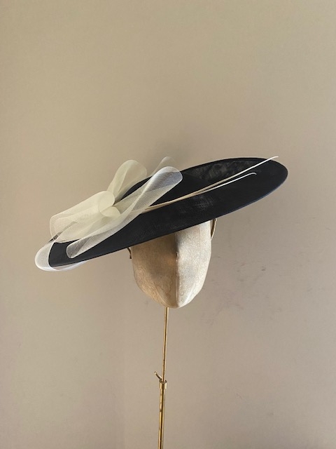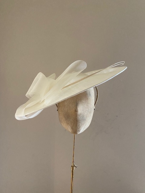 The Prado dish hat comprises a large 18″ sinamay dish base trimmed with a crinoline bow and two elegant quills. This hat comes on a comfortable ribbon wrapped double head band which we will match to your hair colour.