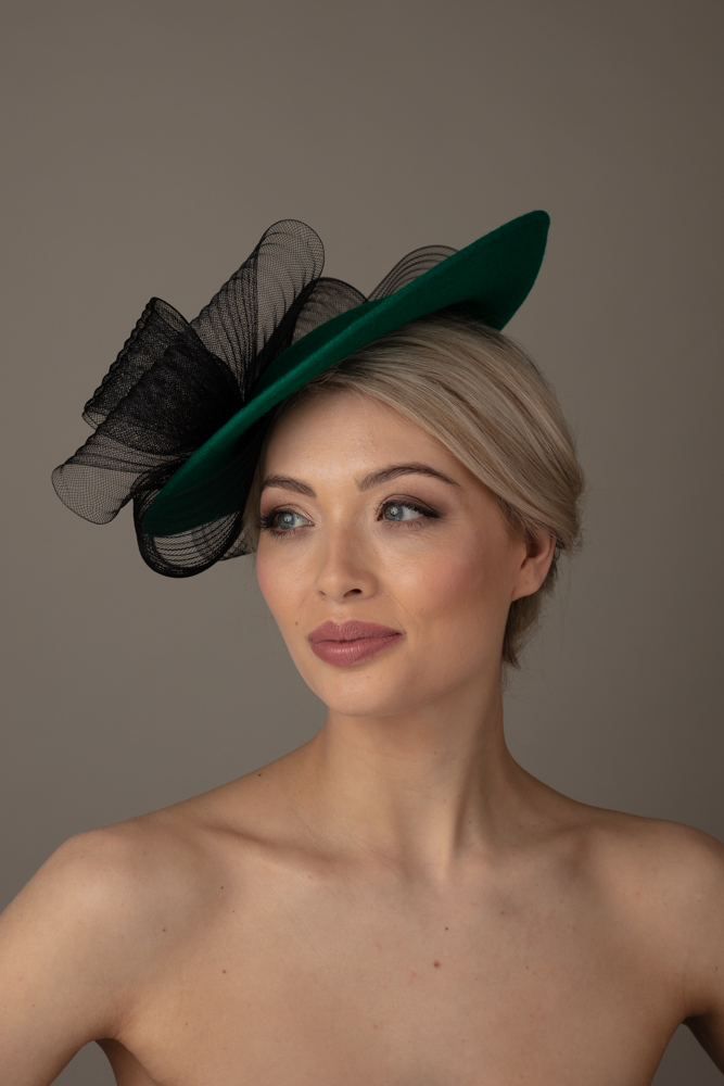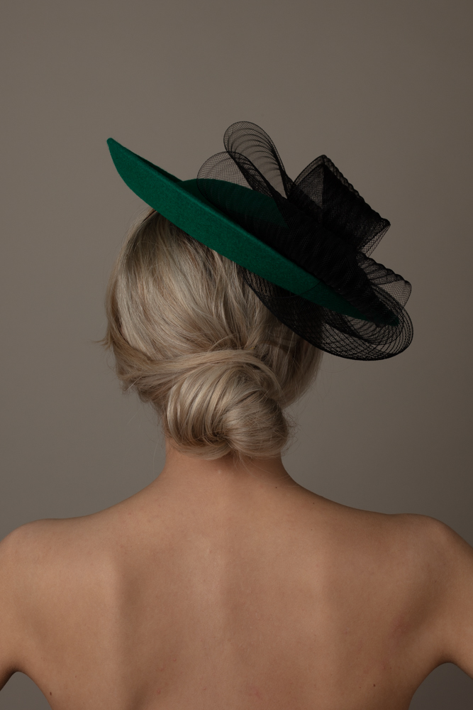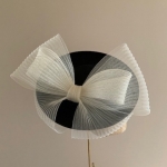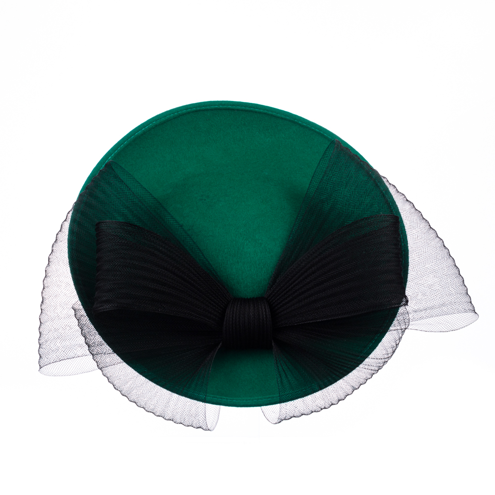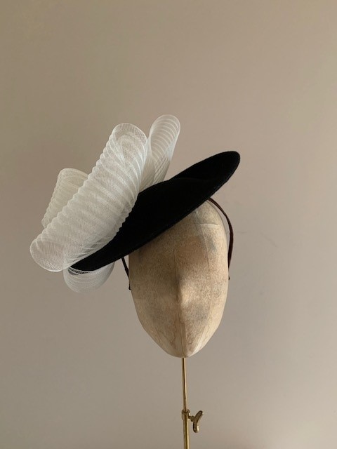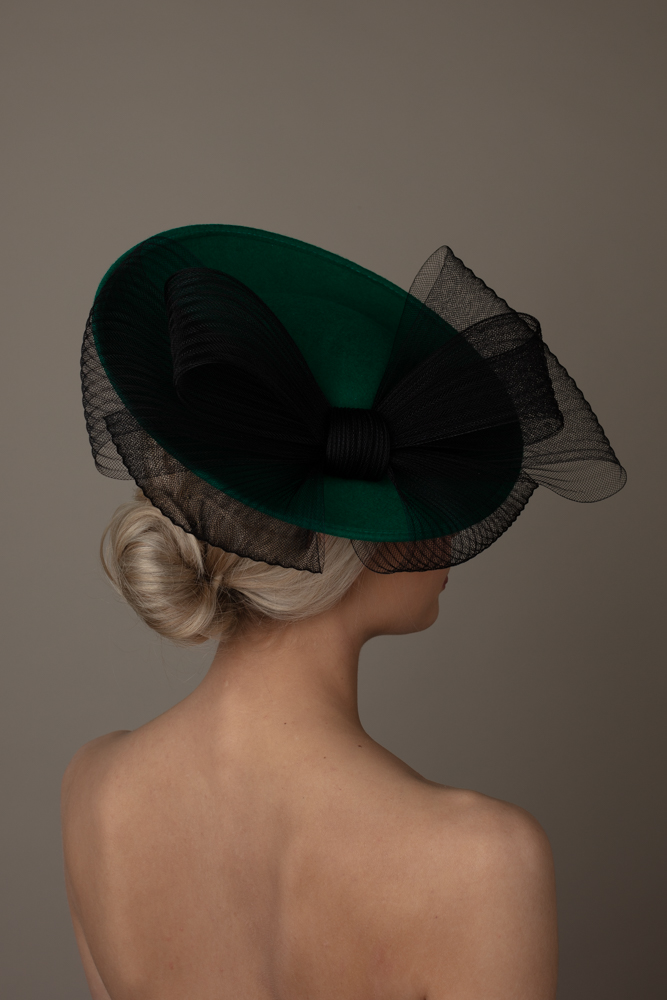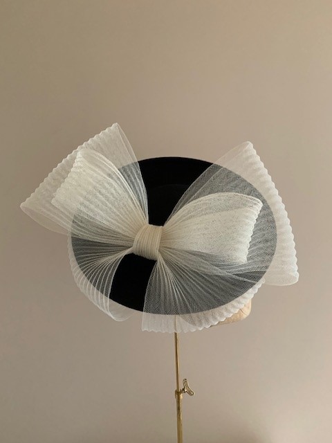 The Raphael Dish Hat comprises a felt dish base, measuring 12, adorned with a concertina-crinoline double bow, the tails of which wrap the underside of the brim.